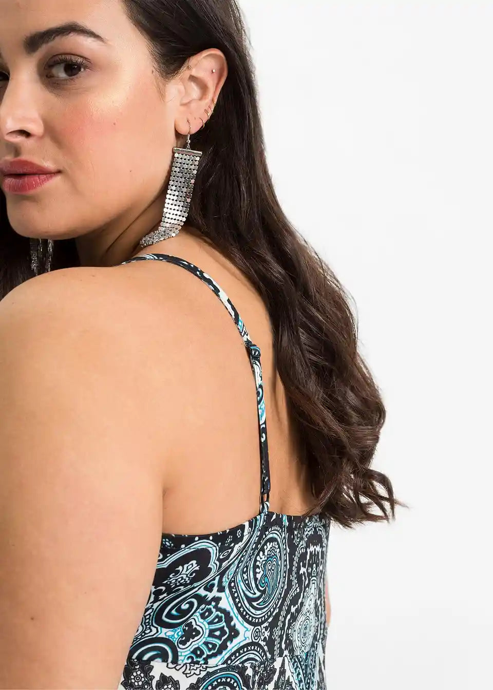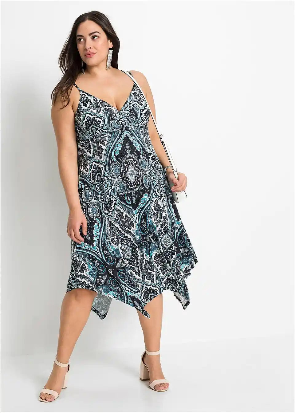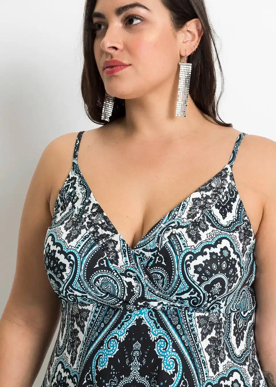 Šarmantno se predstavlja ova lagana ljetna haljina marke BODYFLIRT. Haljina s cjelovitim uzorkom krojena je u Empire stilu sa suptilnim šavom ispod grudi. Ispod grudi lagani materijal slobodno i lepršavo pada prema dolje. Moderan asimetričan porub diskretno otkriva koljena. Spageti naramenice i duboki V-izrez atraktivno stavljaju model u prvi plan.