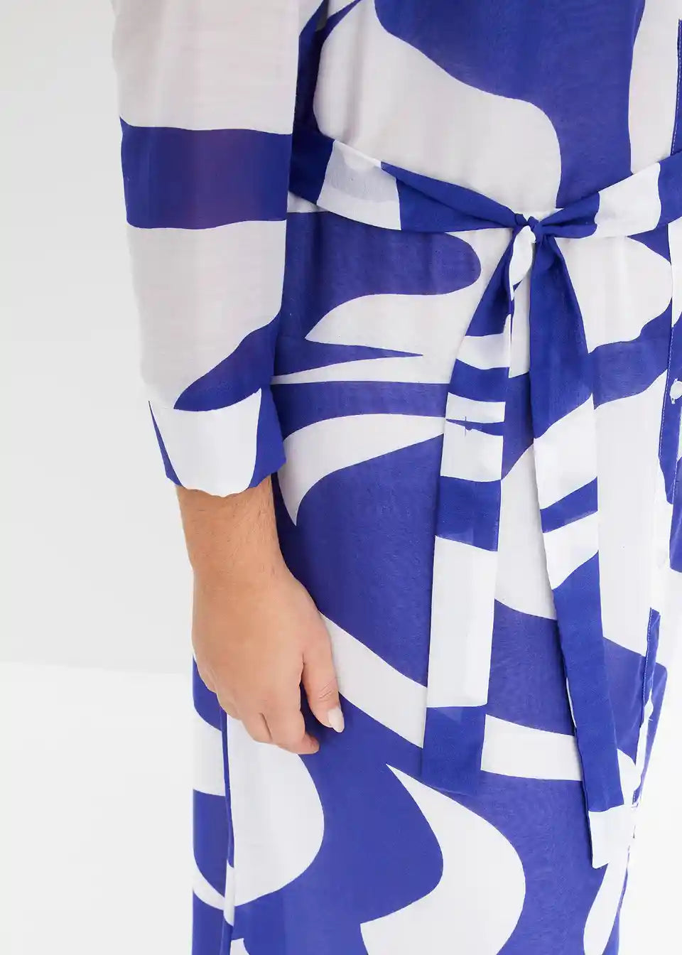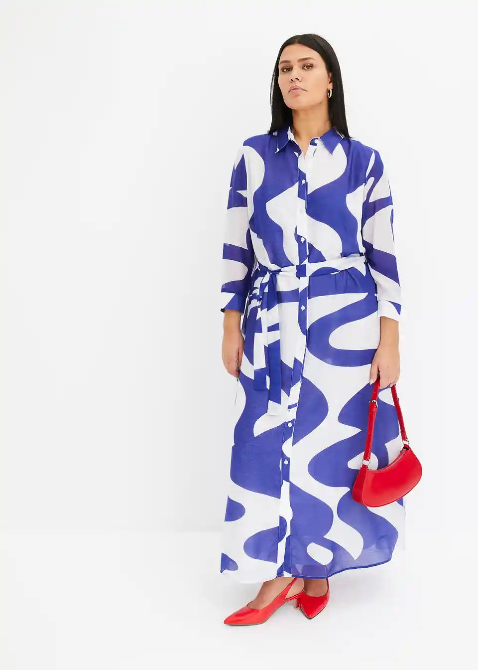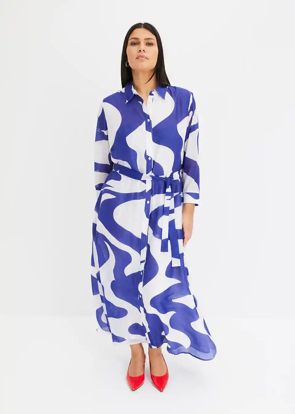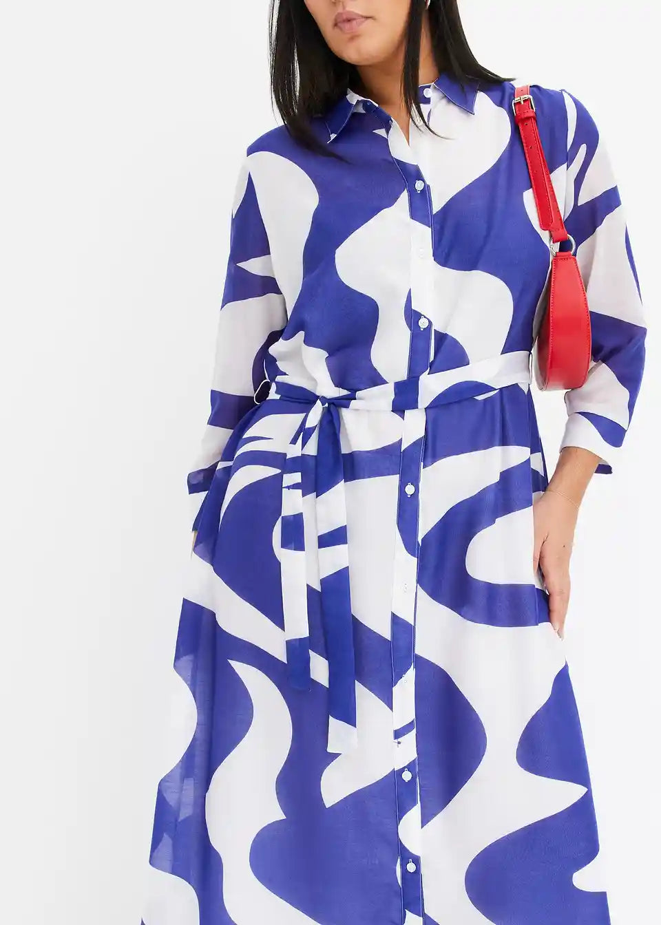 moderna tiskana midi haljina s pojasom u struku i prednjom kopčanjem na gumbe