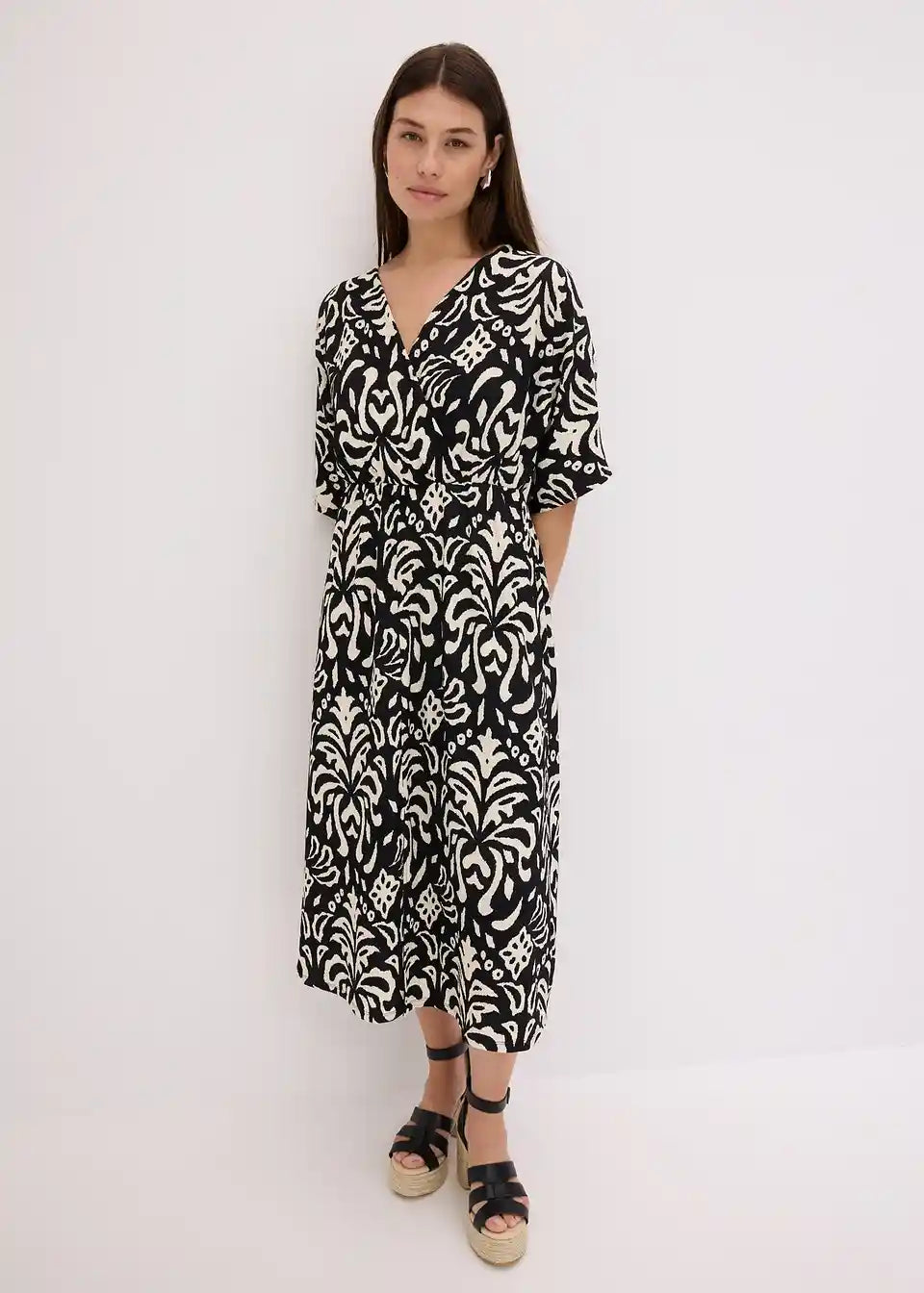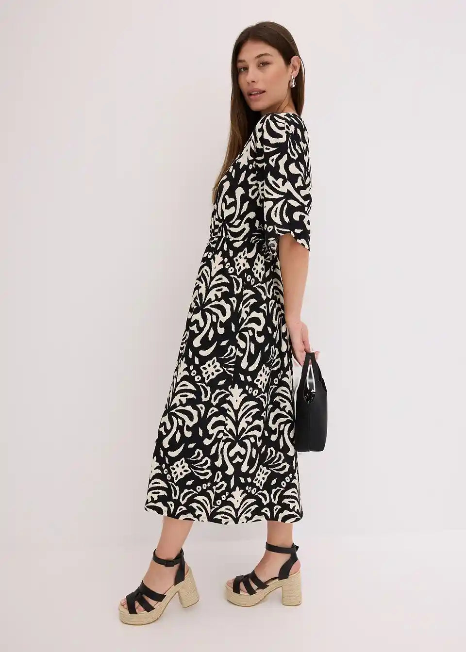 moderna tištana midije haljina s dubokim V-izrezom sprijeda i prorezom na prednjem dijelu suknje
