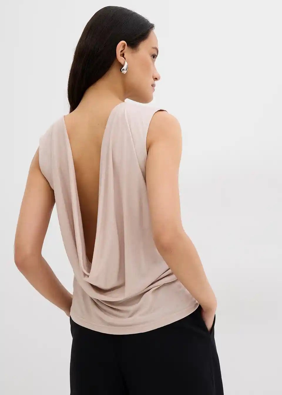 Top koji prati figuru od lepršavog materijala s dubokim vodopad izrezom na leđima