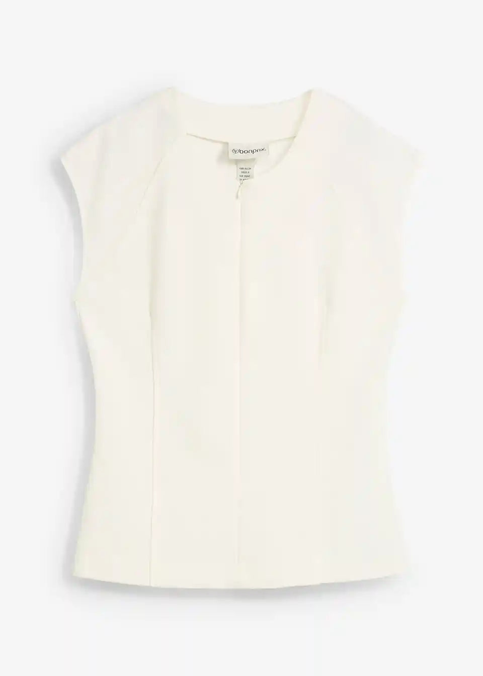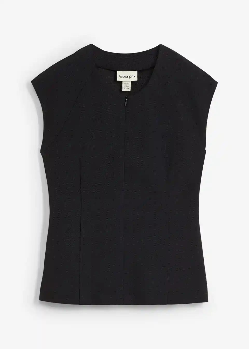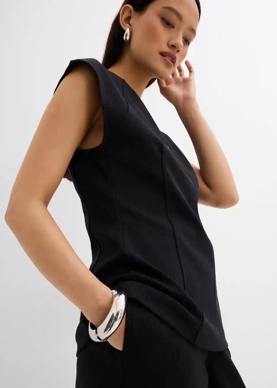 Top koji naglašava figuru s okruglim izrezom, podijeljenim šavovima i skrivenim patentnim zatvaračem sprijeda.
