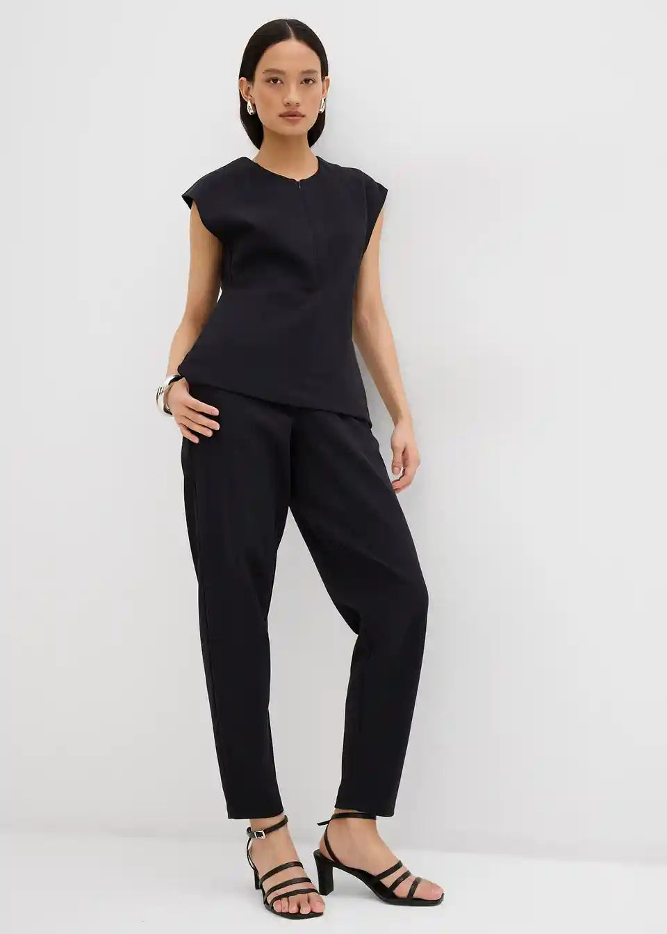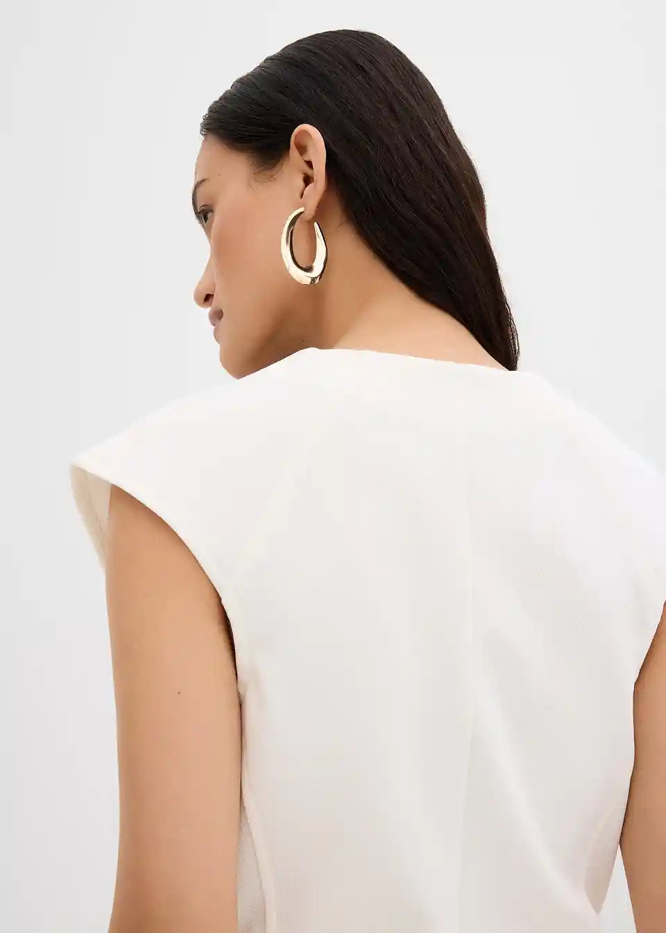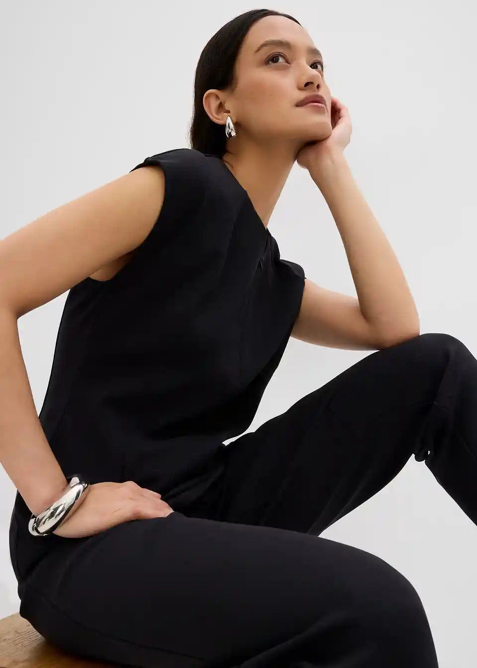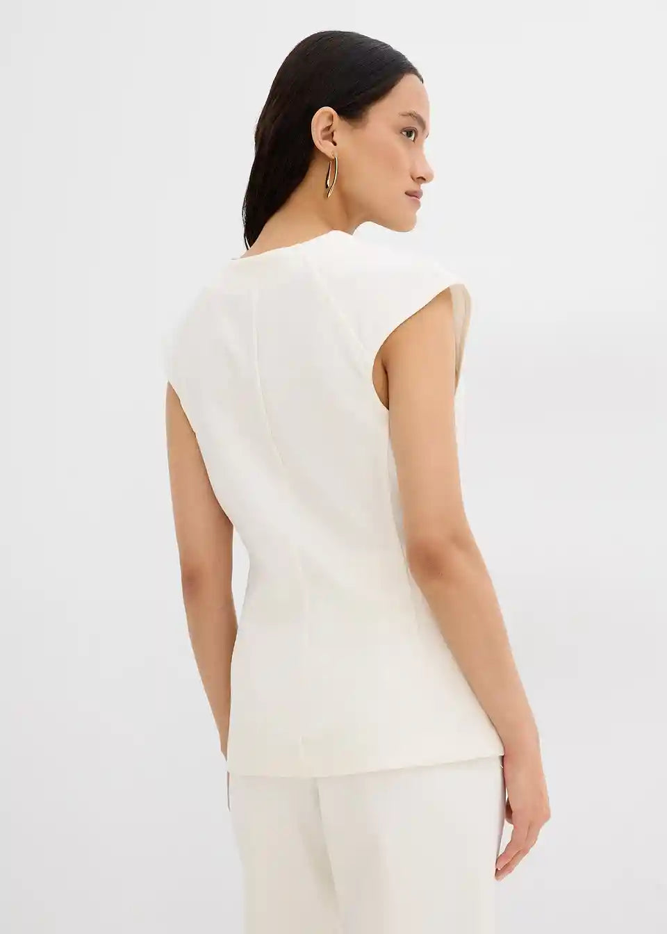 Top koji naglašava figuru s okruglim izrezom, podijeljenim šavovima i skrivenim patentnim zatvaračem sprijeda.