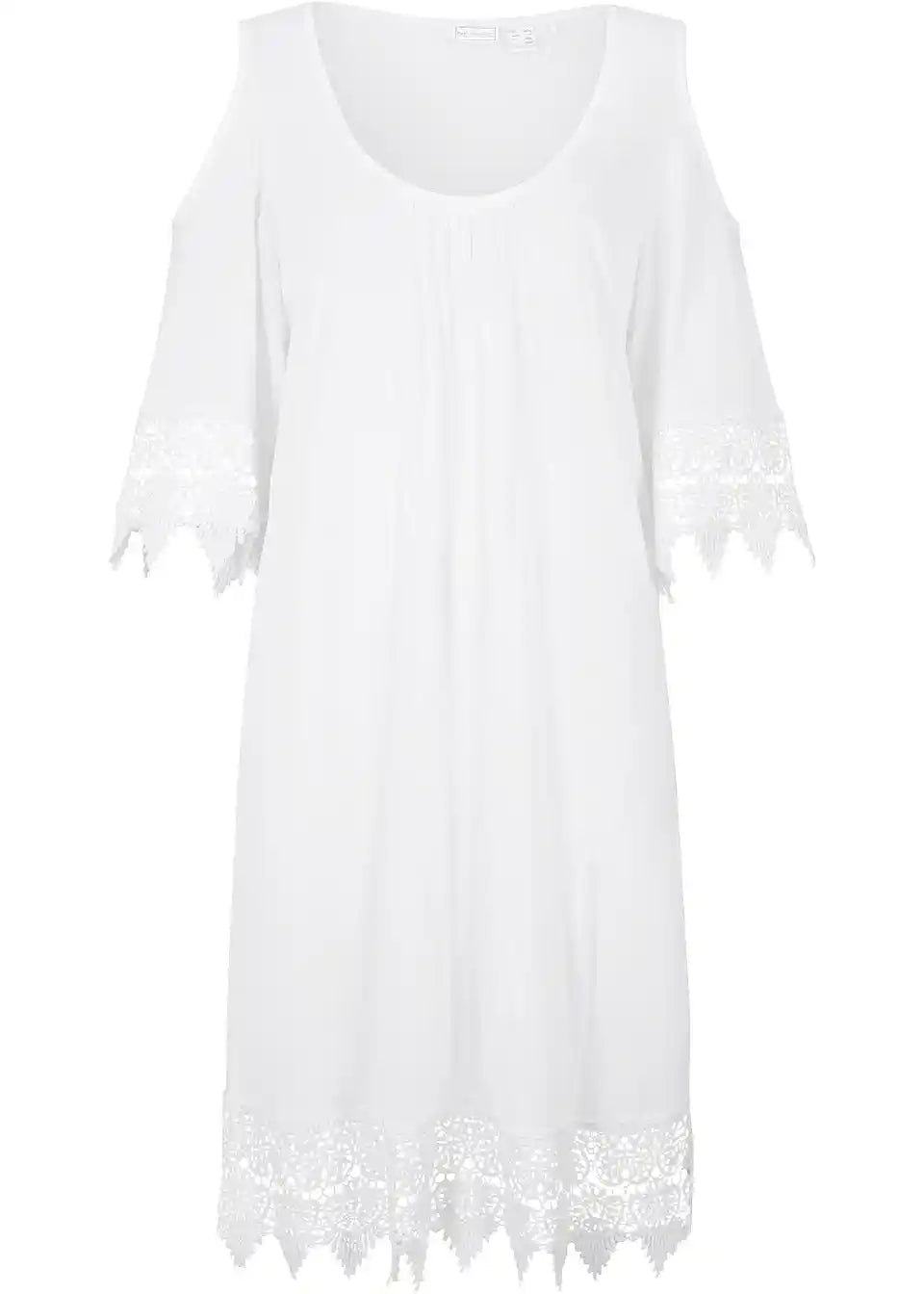 Oversized majica za plažu od jerseya s čipkastim rubom. Off-Shoulder. Lagano prozirna.