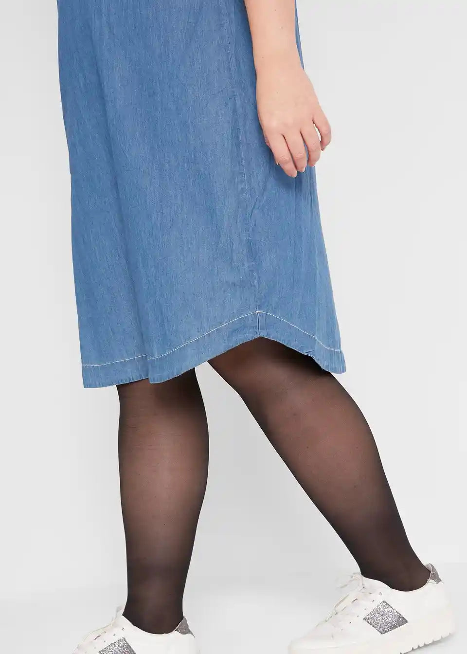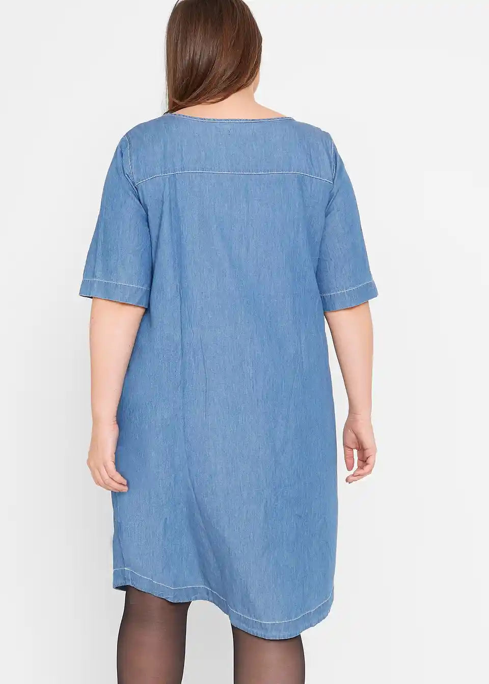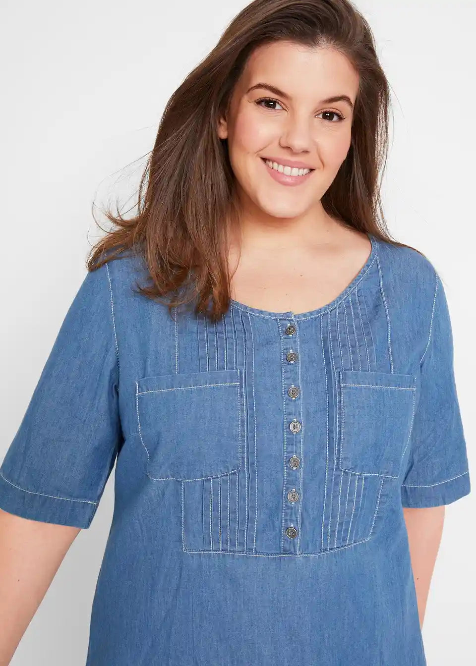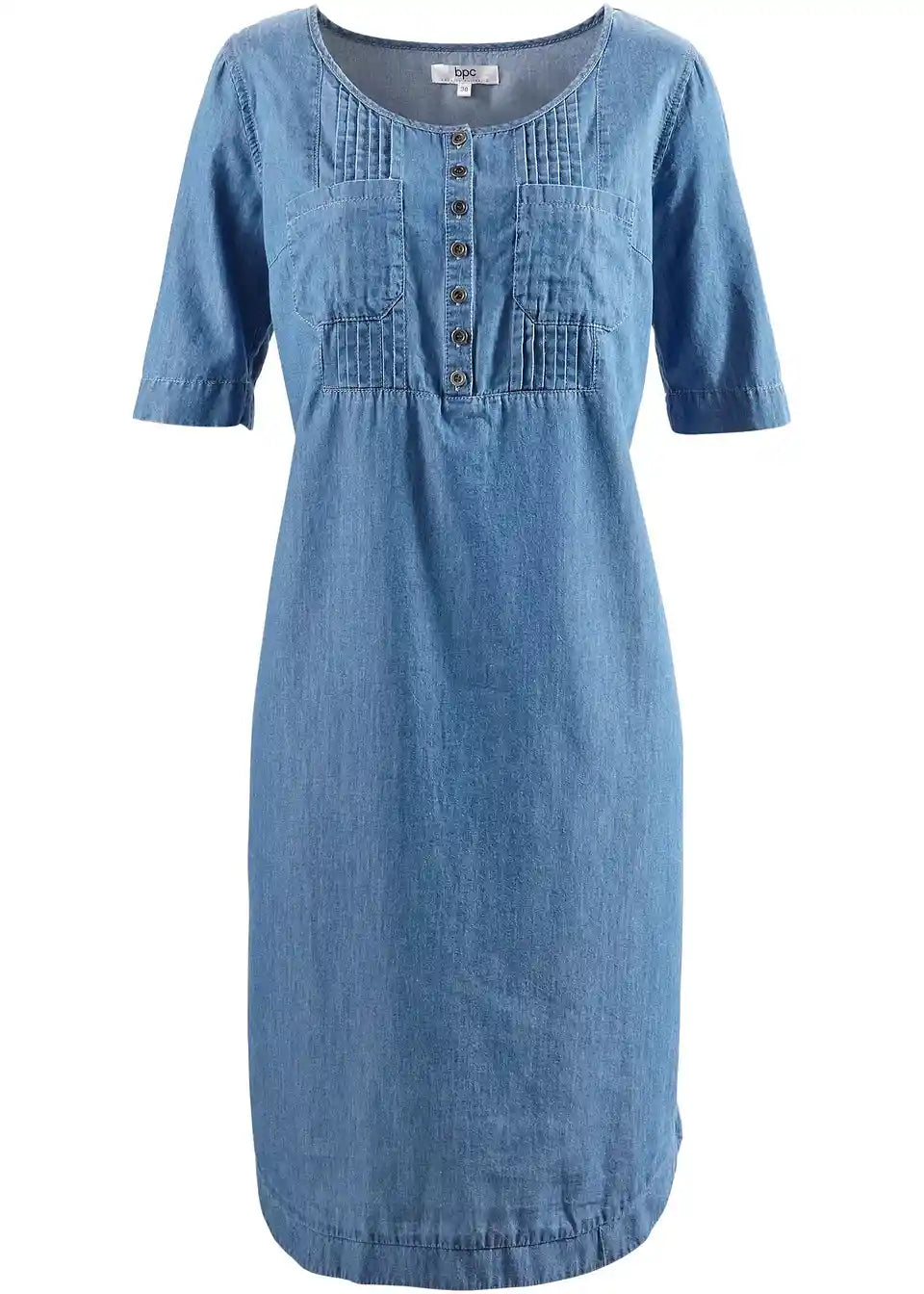 Ova traper haljina od bpc-a predstavlja traper u svojoj romantičnoj varijanti. Gornji dio s okruglim izrezom ukrašen je naborima i redom gumbi. Dva našivena džepa dodatno naglašavaju dekolte. Rukavi poluduge duljine široko se šire, dajući haljini vrlo udoban karakter. Mekani traper materijal ležerno pada do koljena s zaobljenim rubom. Ova haljina majica u ležernom kroju savršeno se kombinira s modernim kaubojskim ili biker čizmama.