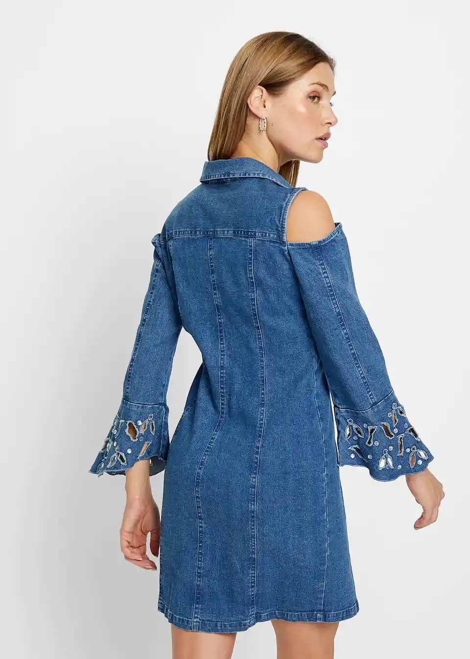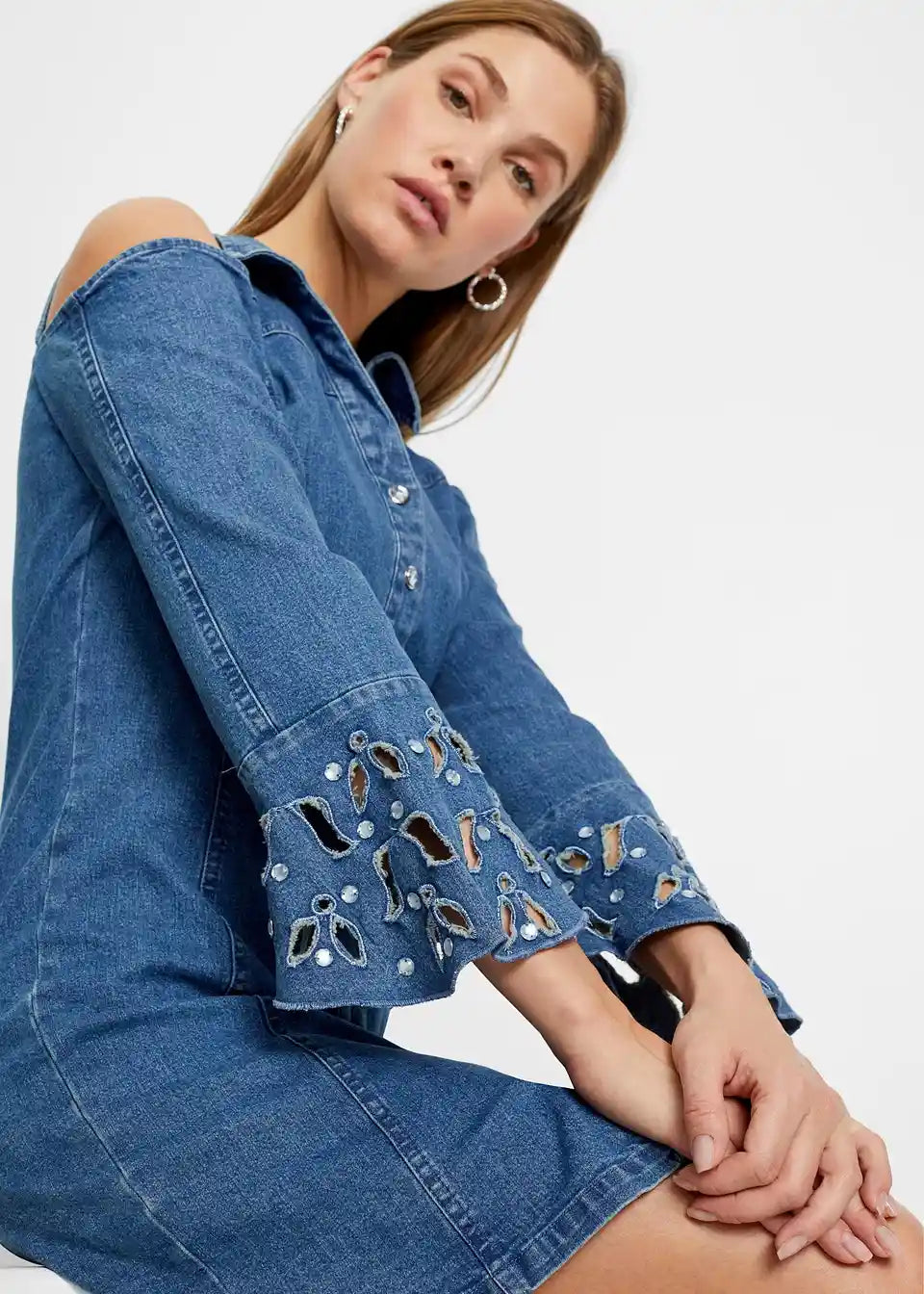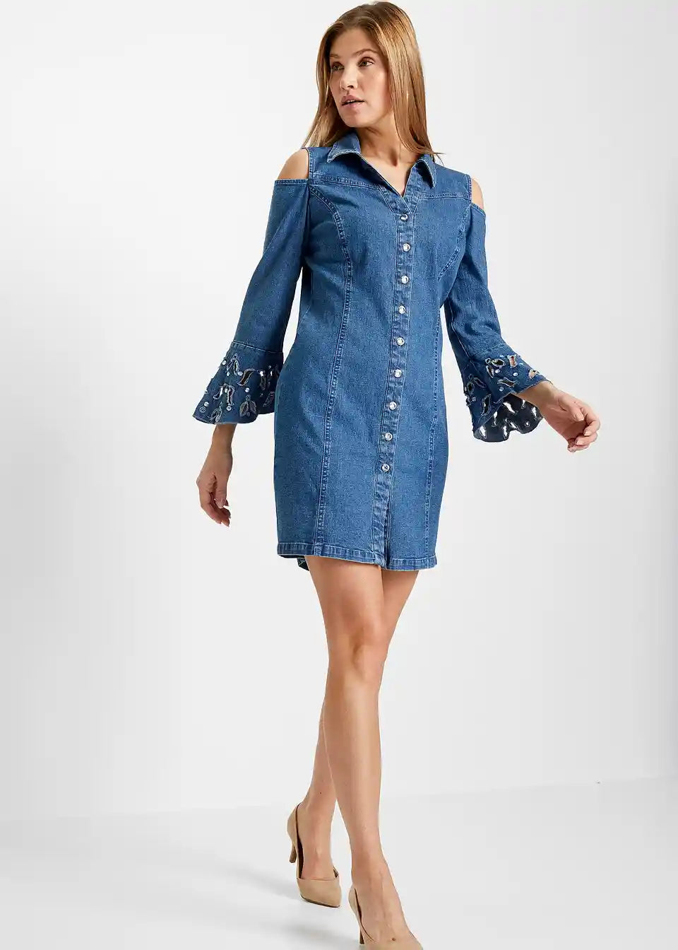 Moderna i ženstvena: Traper haljina s volan rukavima i izrezima.