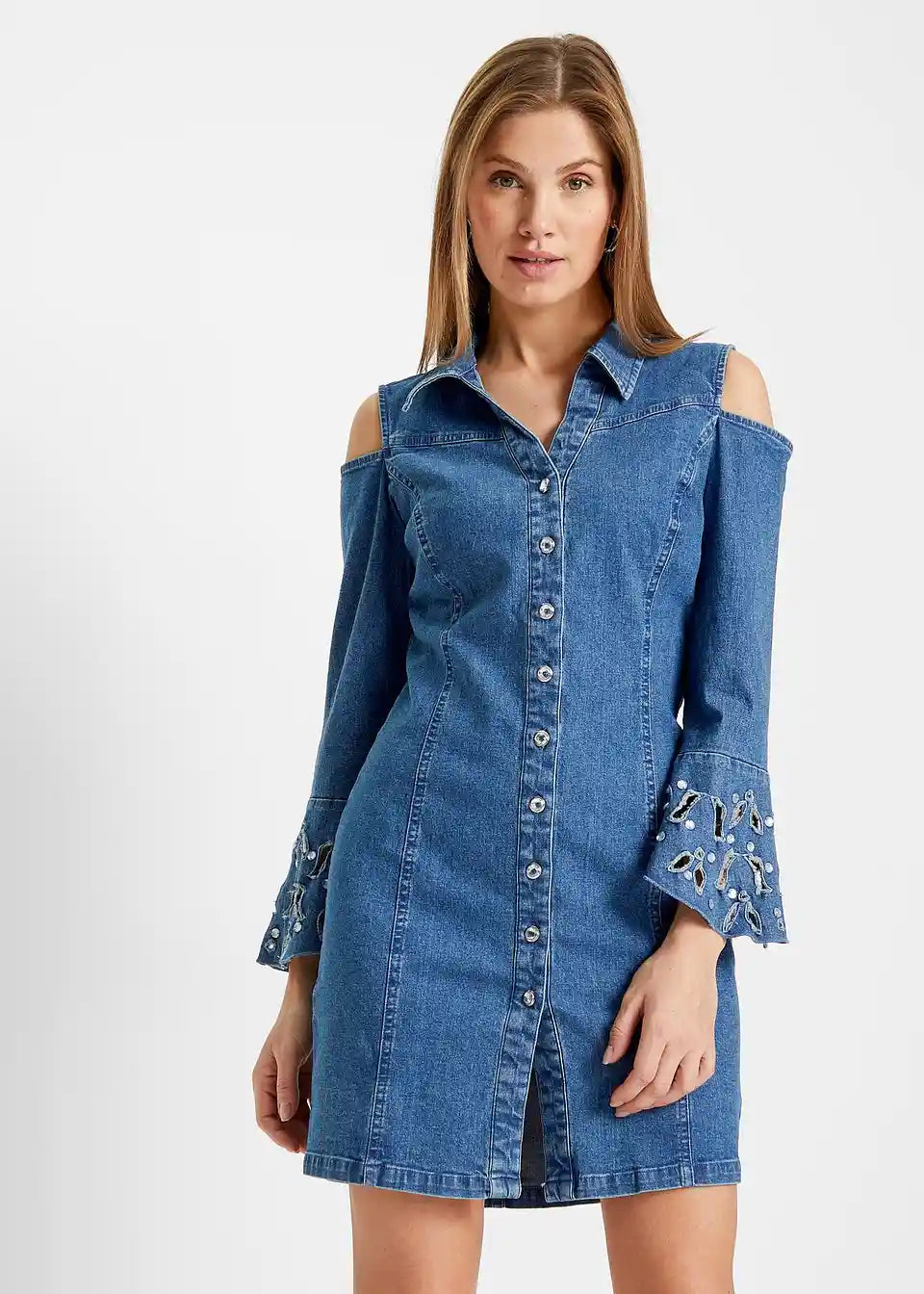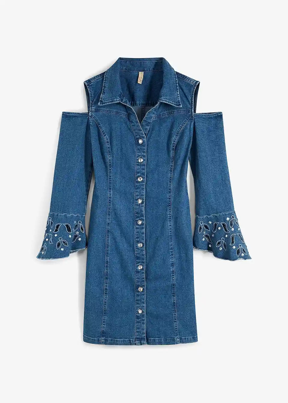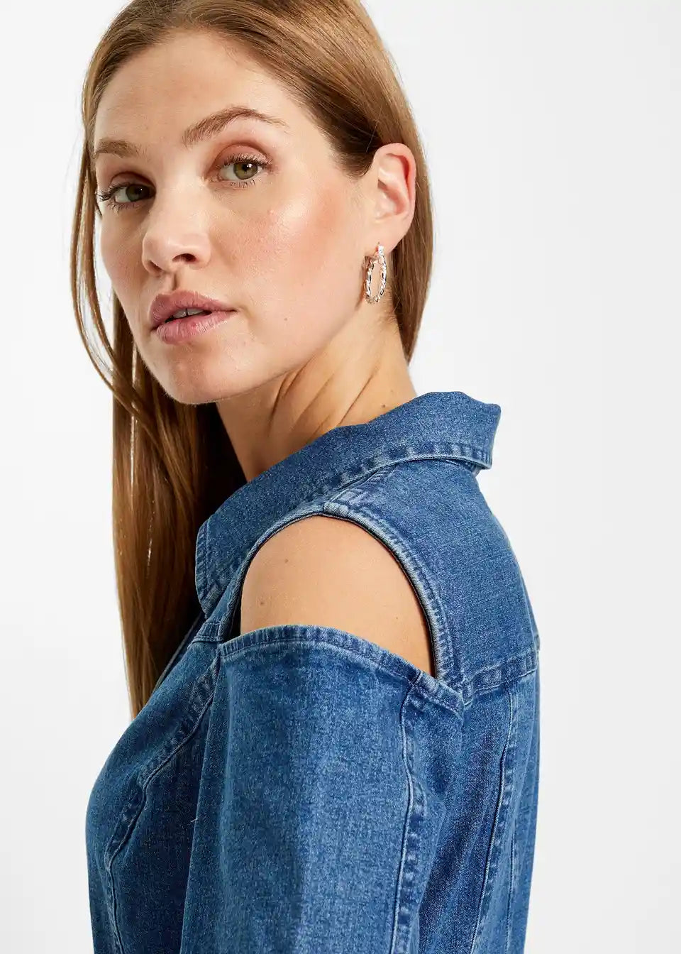 Moderna i ženstvena: Traper haljina s volan rukavima i izrezima.