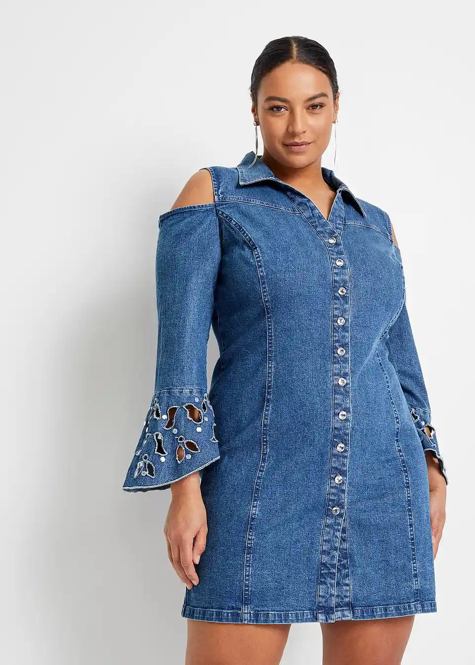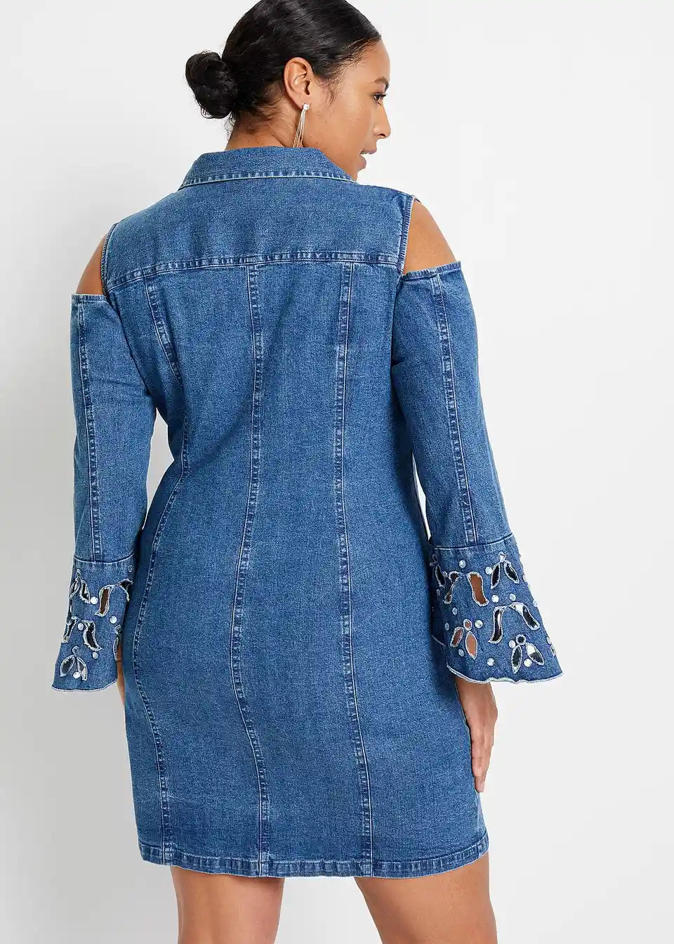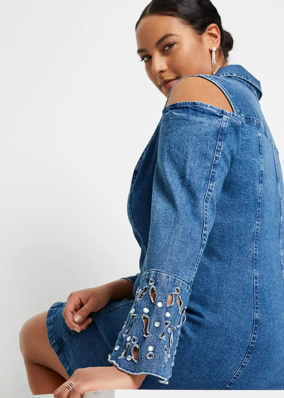 Moderno i ženstveno: Traper haljina s volan rukavima i izrezima.