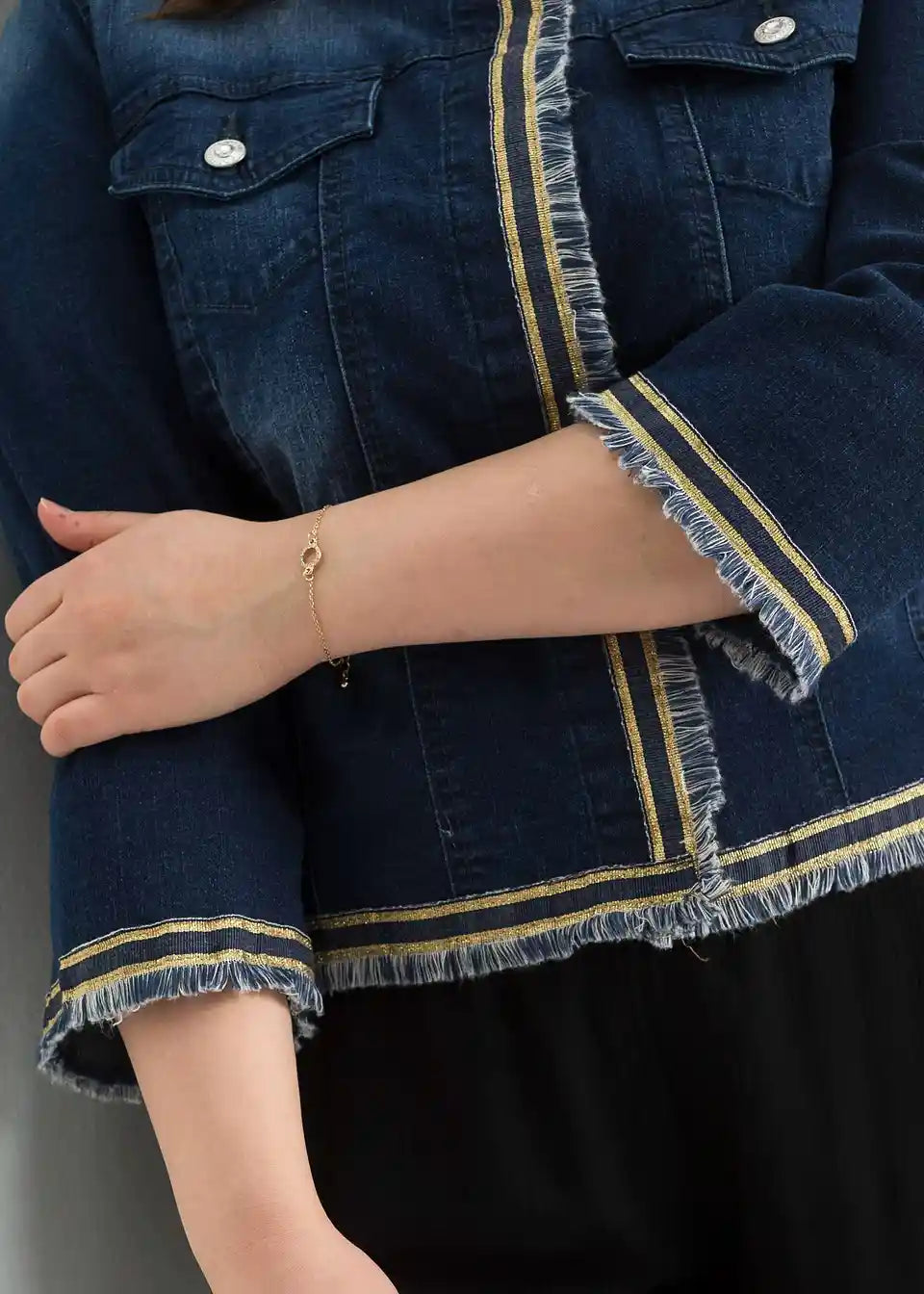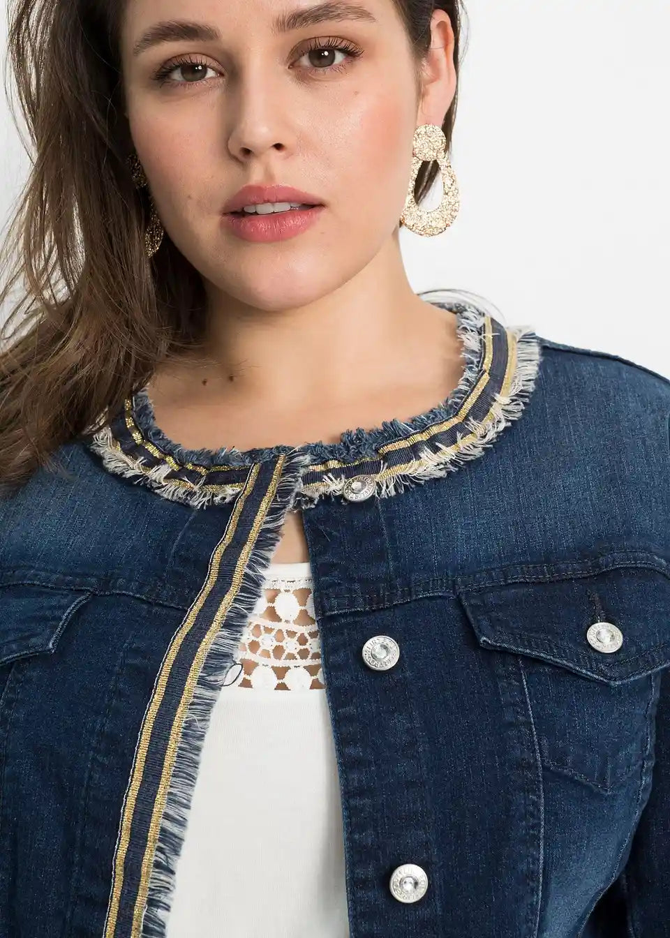 Ova kratko krojena traper jakna s resicama i postavljenom svjetlucavom trakom marke BODYFLIRT očarava modnim šikom. Ukrasni elementi na prednjim rubovima, završecima rukava, okruglom izrezu i porubu daju modelu poseban izgled. Dekorativni detalji su metalni gumbi s kristalima i skrivena kopčica sprijeda.