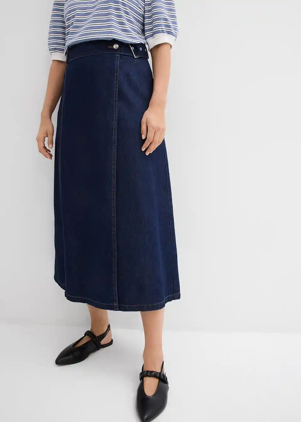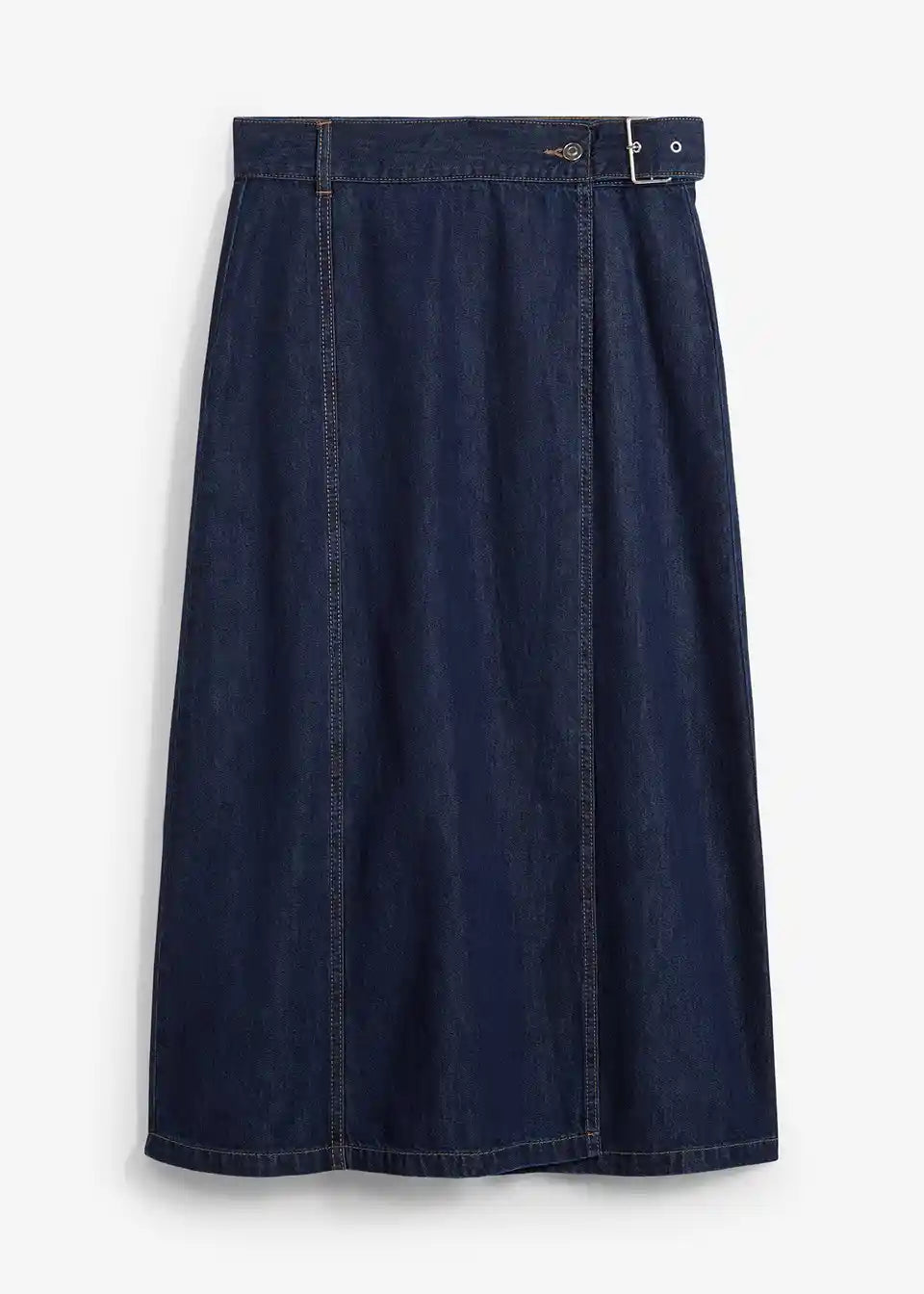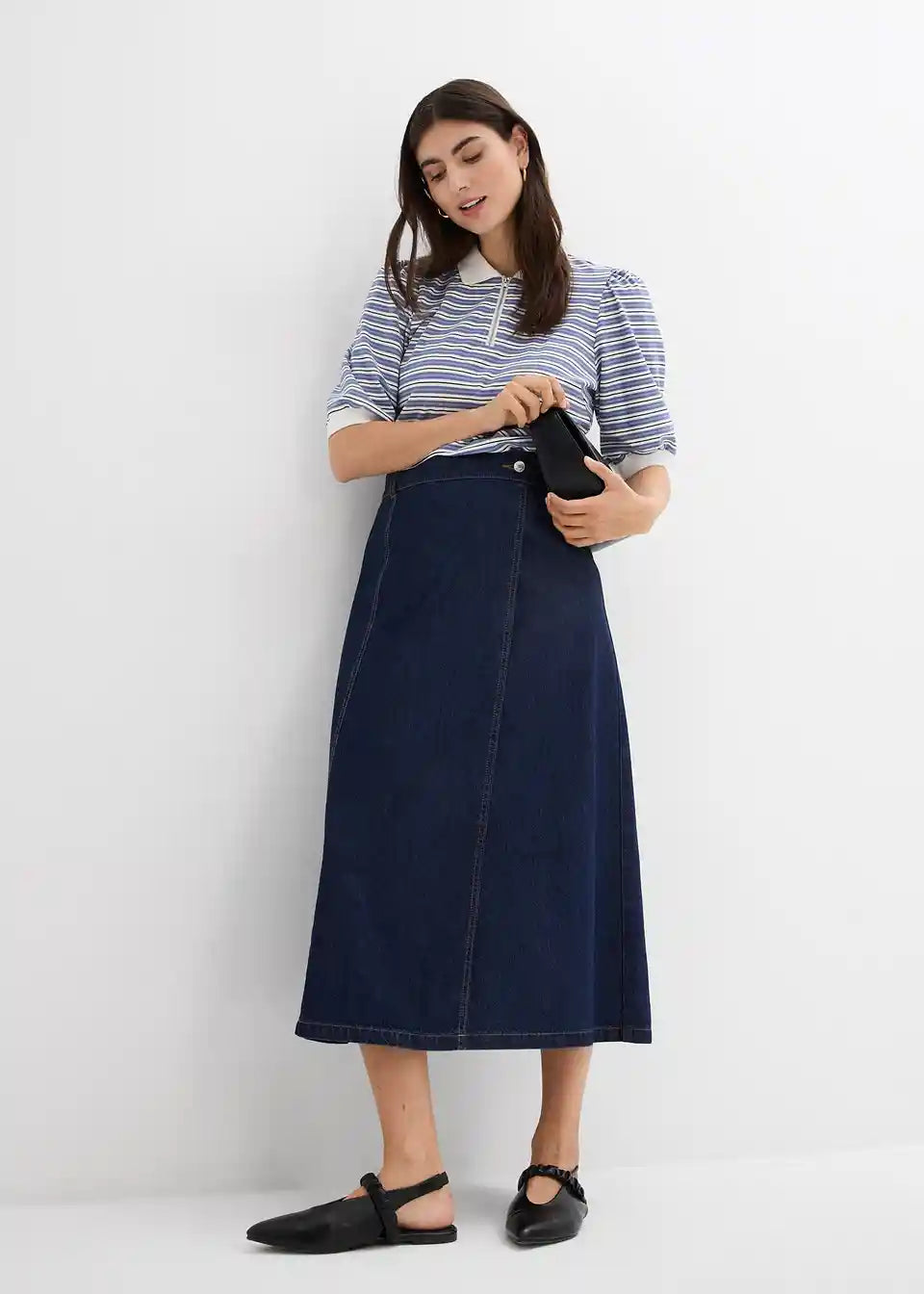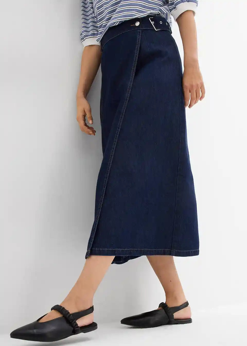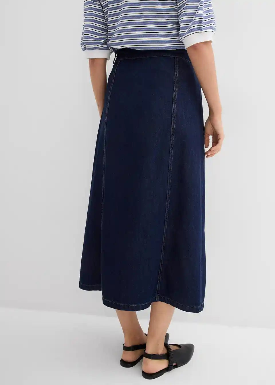 Traper suknja s izgledom preklopa i midi dužine od izuzetno laganog Low Stretch trapera. Ukupna dužina u vel. 42 cca 82 cm, periva u perilici.