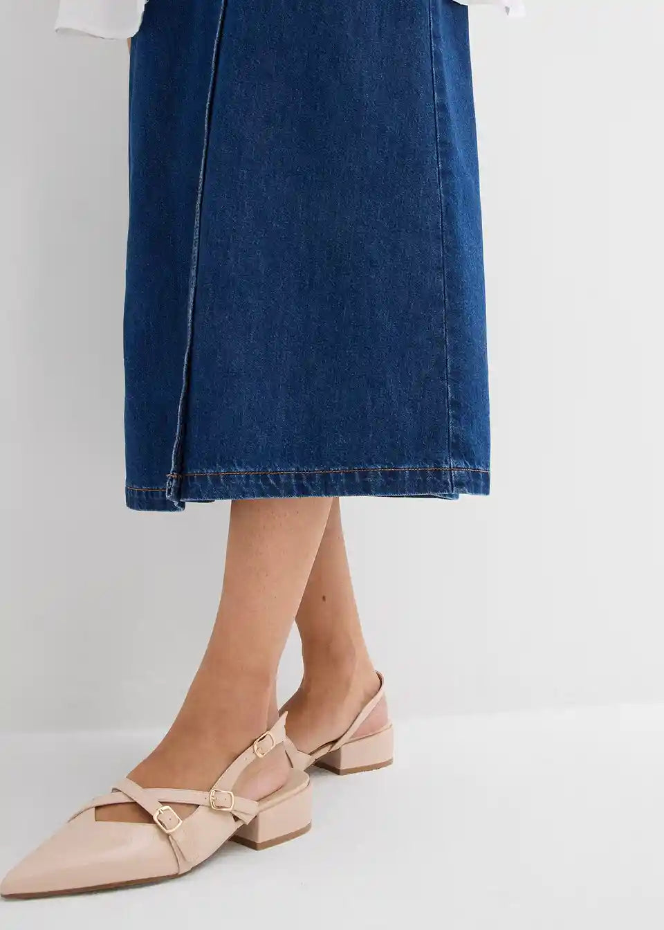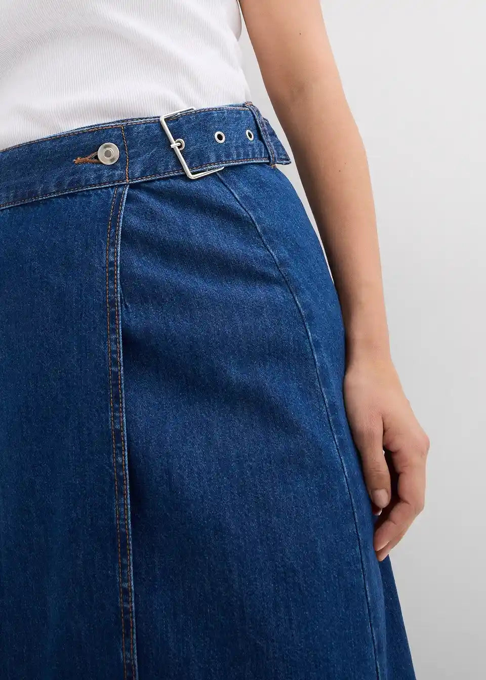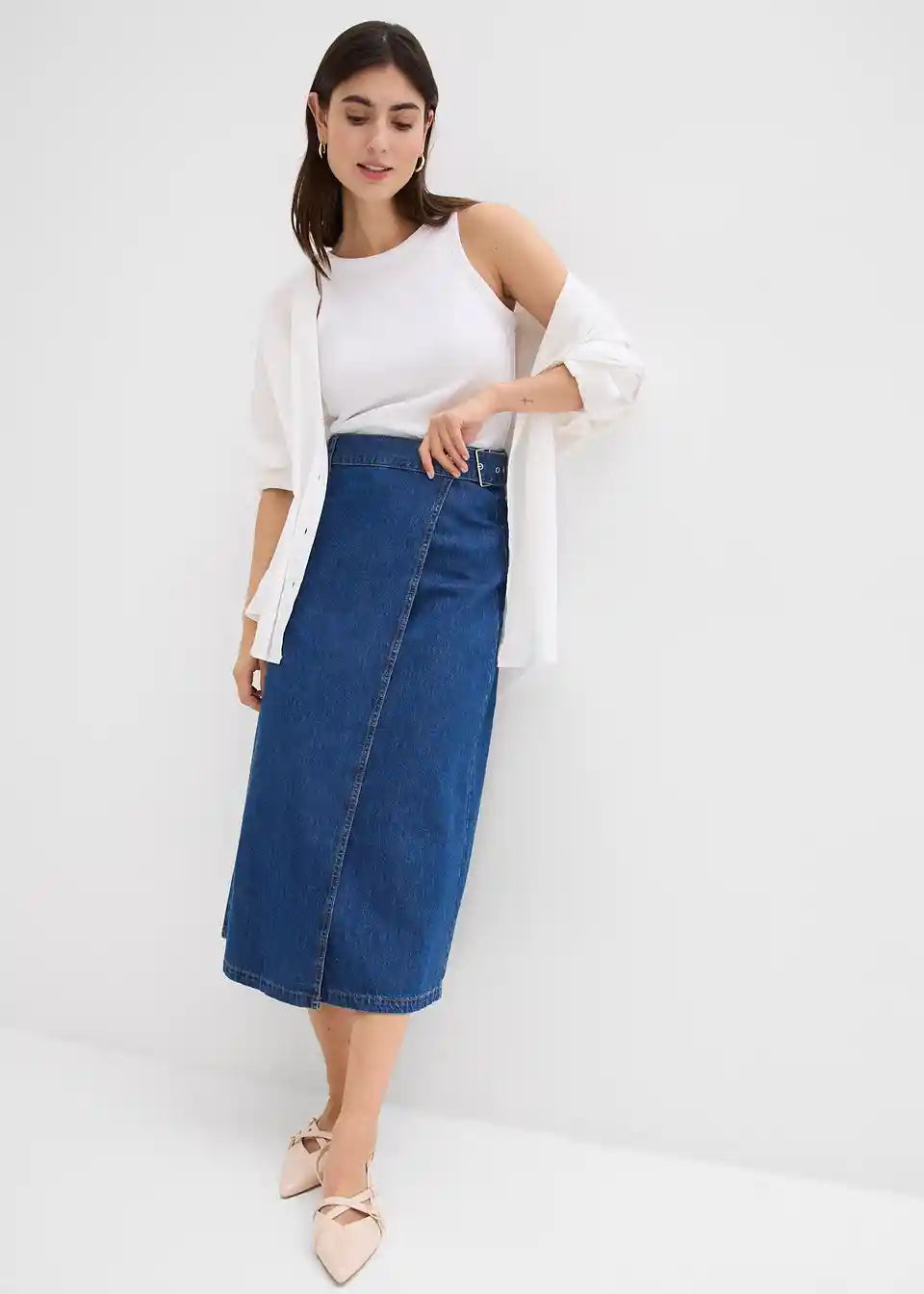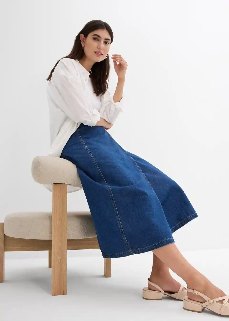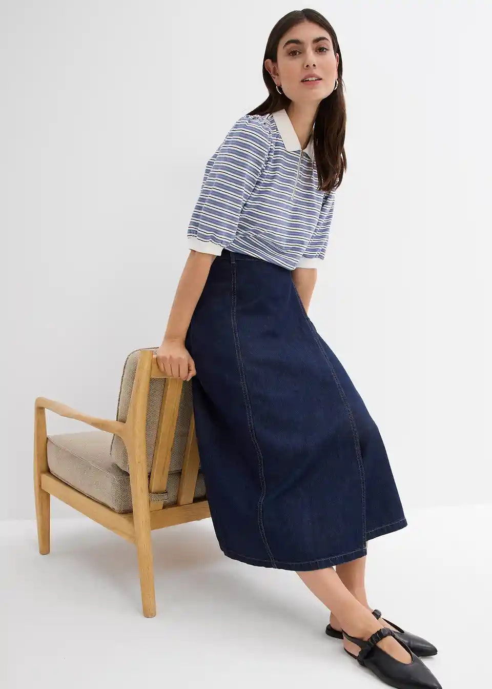 Traper suknja s izgledom preklopa i midi dužine od izuzetno laganog Low Stretch trapera. Ukupna dužina u vel. 42 cca 82 cm, periva u perilici.