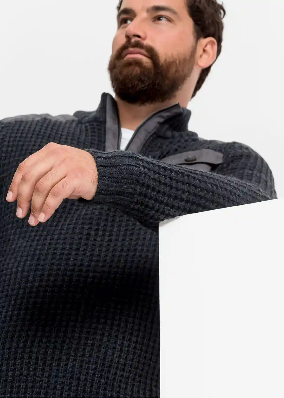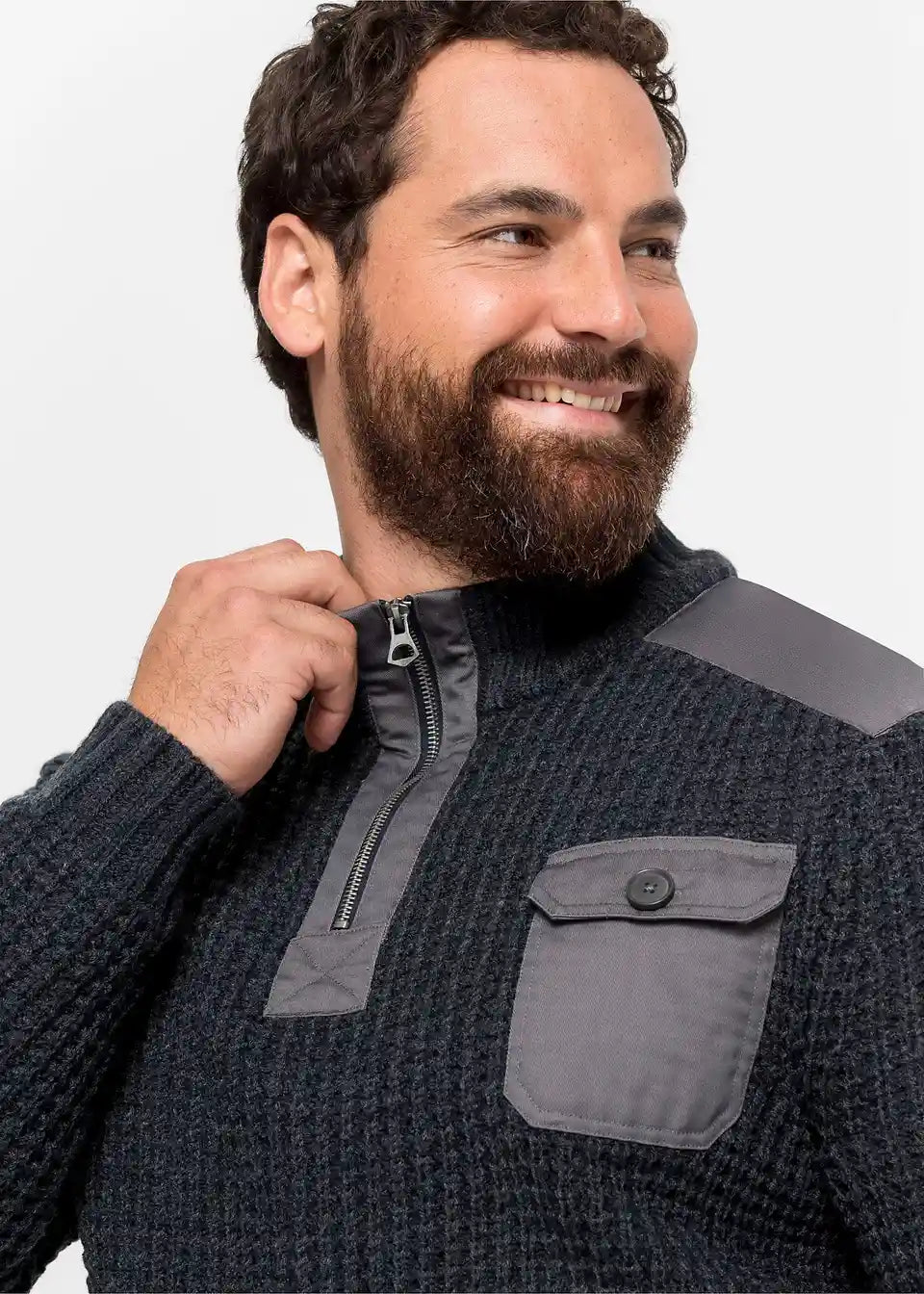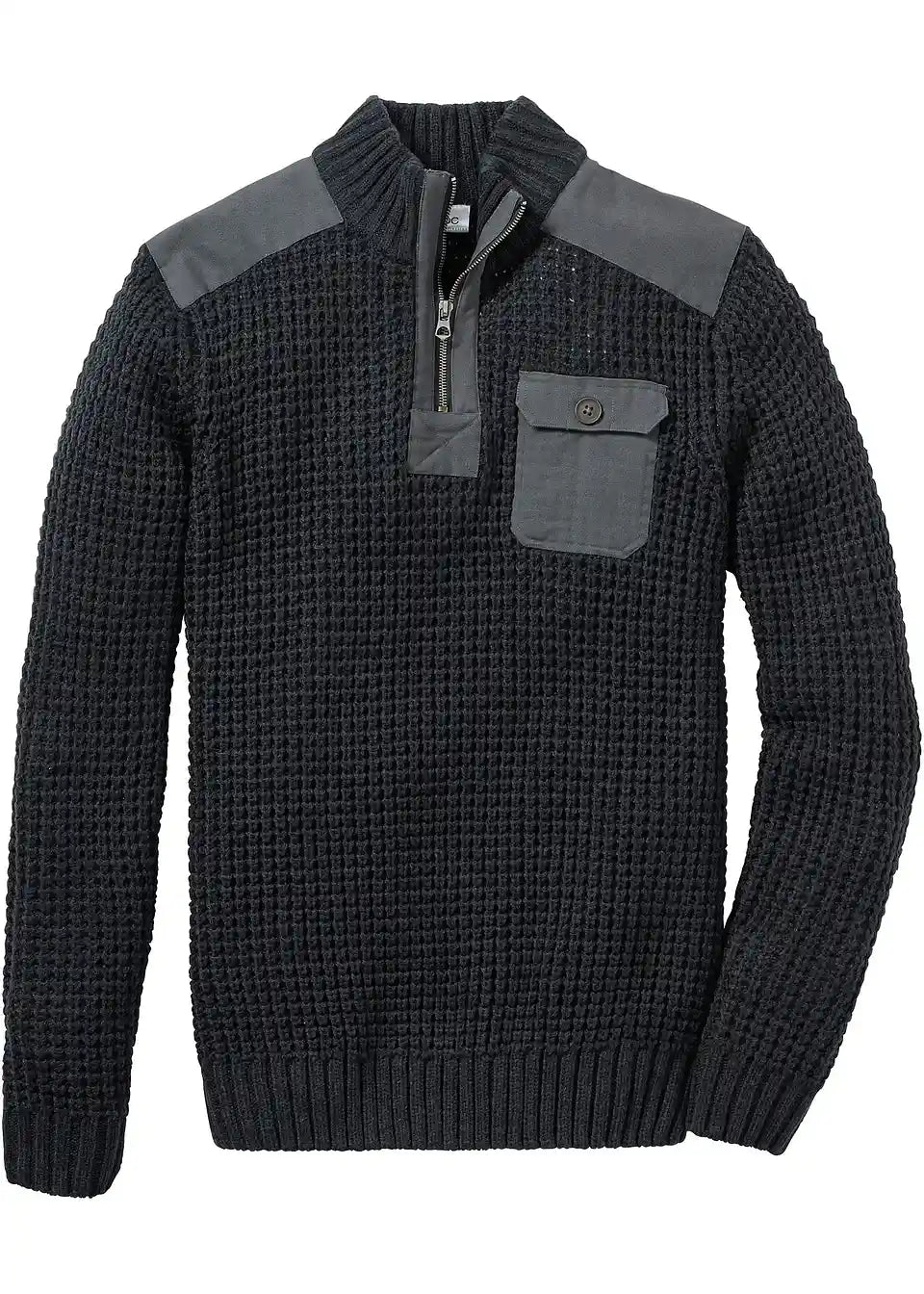 Ovaj udoban muški pulover iz aktualne kolekcije John Baner pravi je svestrani izbor za slobodno vrijeme. Ležerni pulover od grubo pletenog pletiva ima stojeći ovratnik sa zatvaračem i duge rukave. Našiveni džep na prsima i tkaninske aplikacije na ramenima naglašavaju moderan izgled pulovera. Može se svestrano kombinirati s trapericama i chinos hlačama.