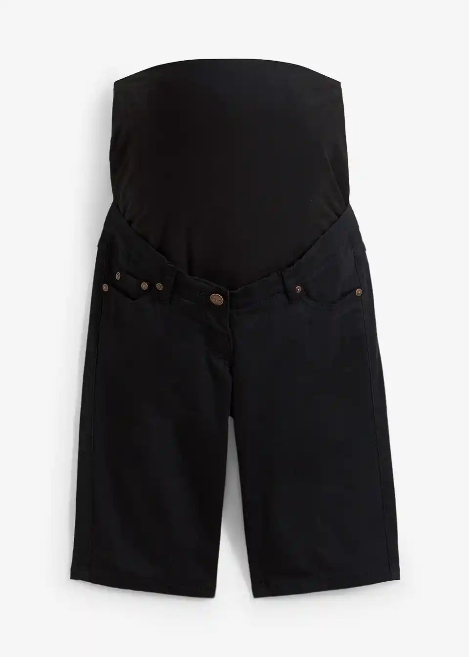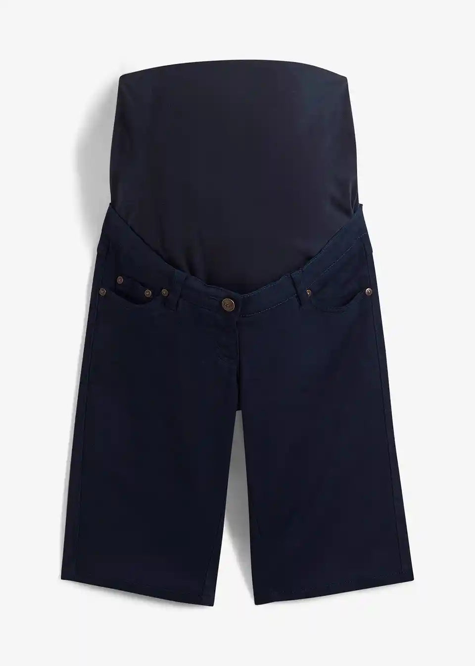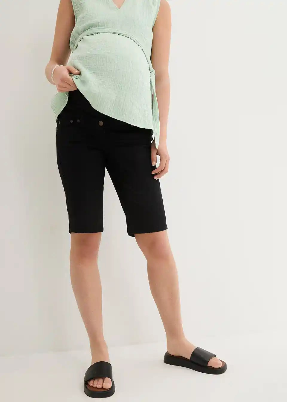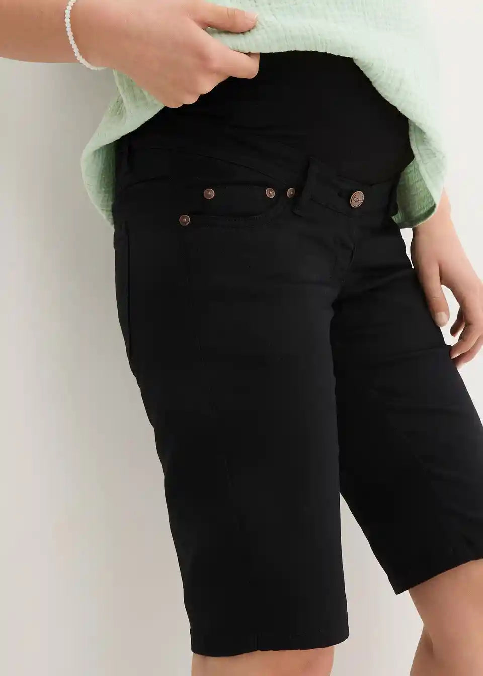 Ove trudničke hlače dužine bermuda s podesivim pojasom i trakom od dresa za trbuh mogu se nositi tijekom cijele trudnoće. Pomaknuti bočni šavovi ovim trudničkim hlačama daju sjajnu figuru i vrlo su udobne. S uobičajenim prednjim i stražnjim džepovima.
