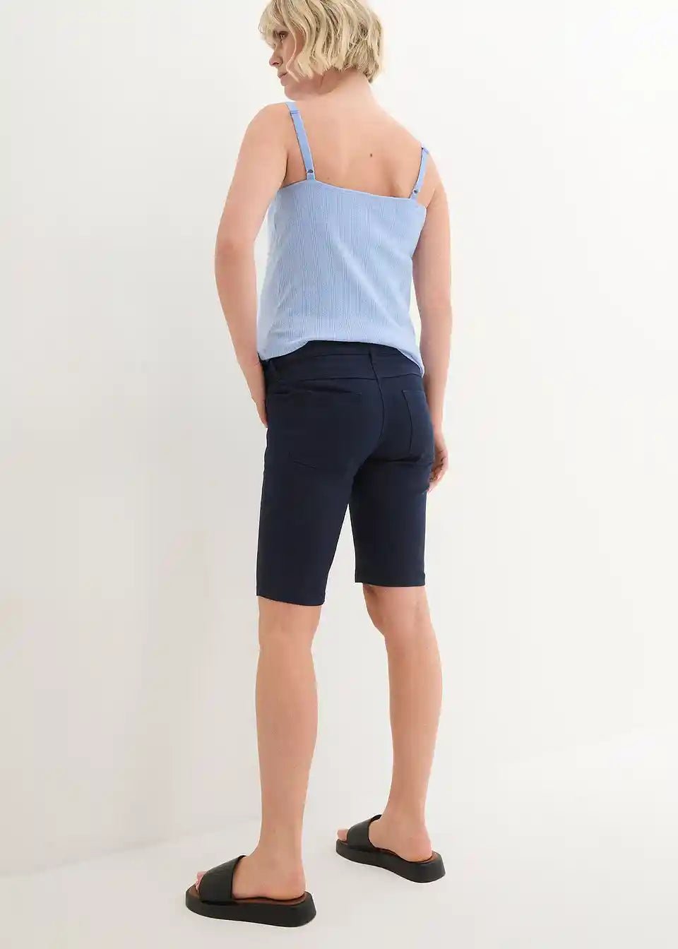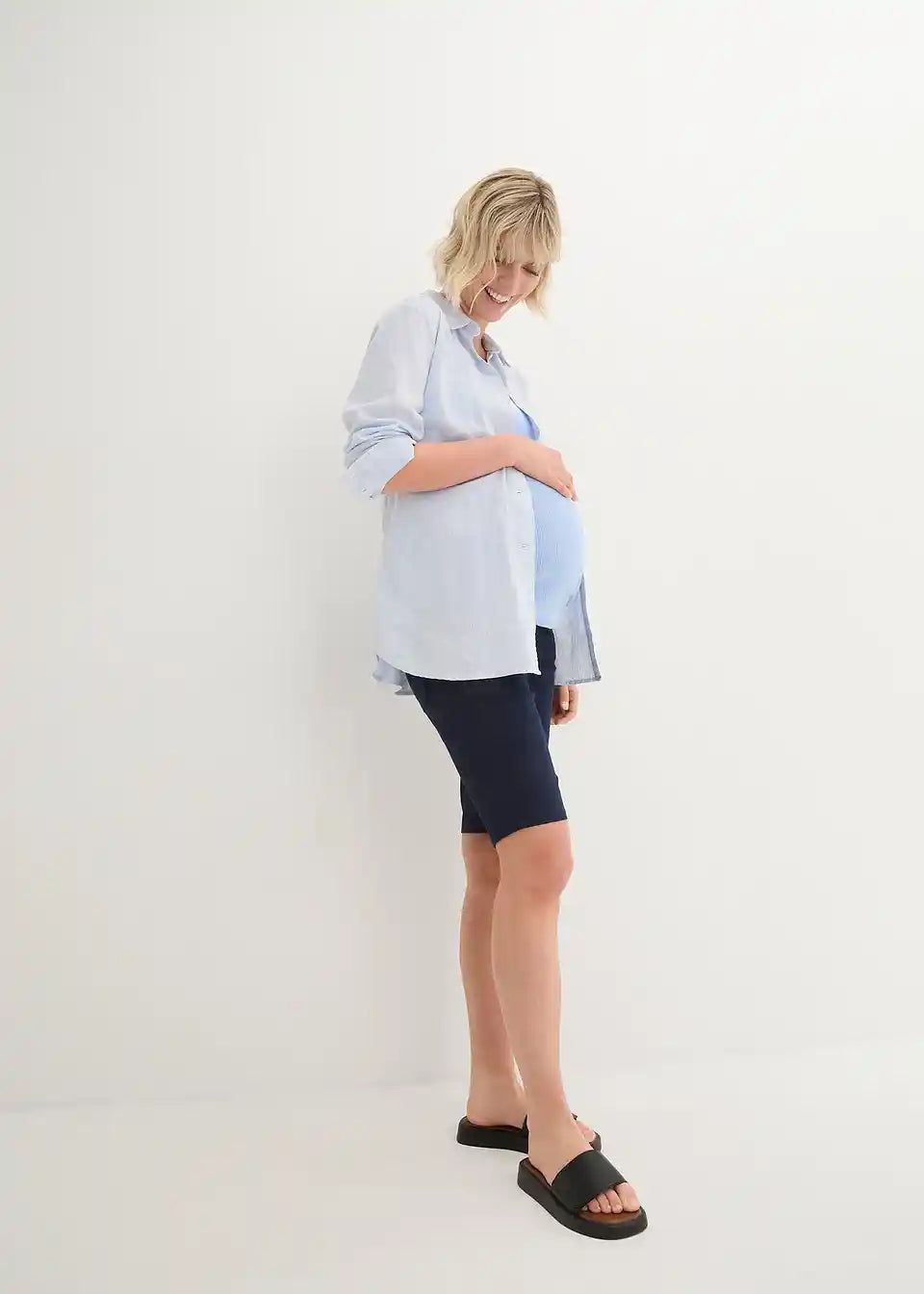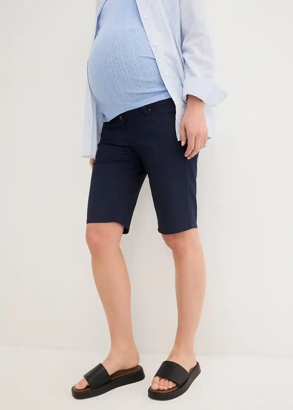 Ove trudničke hlače dužine bermuda s podesivim pojasom i trakom od dresa za trbuh mogu se nositi tijekom cijele trudnoće. Pomaknuti bočni šavovi ovim trudničkim hlačama daju sjajnu figuru i vrlo su udobne. S uobičajenim prednjim i stražnjim džepovima.