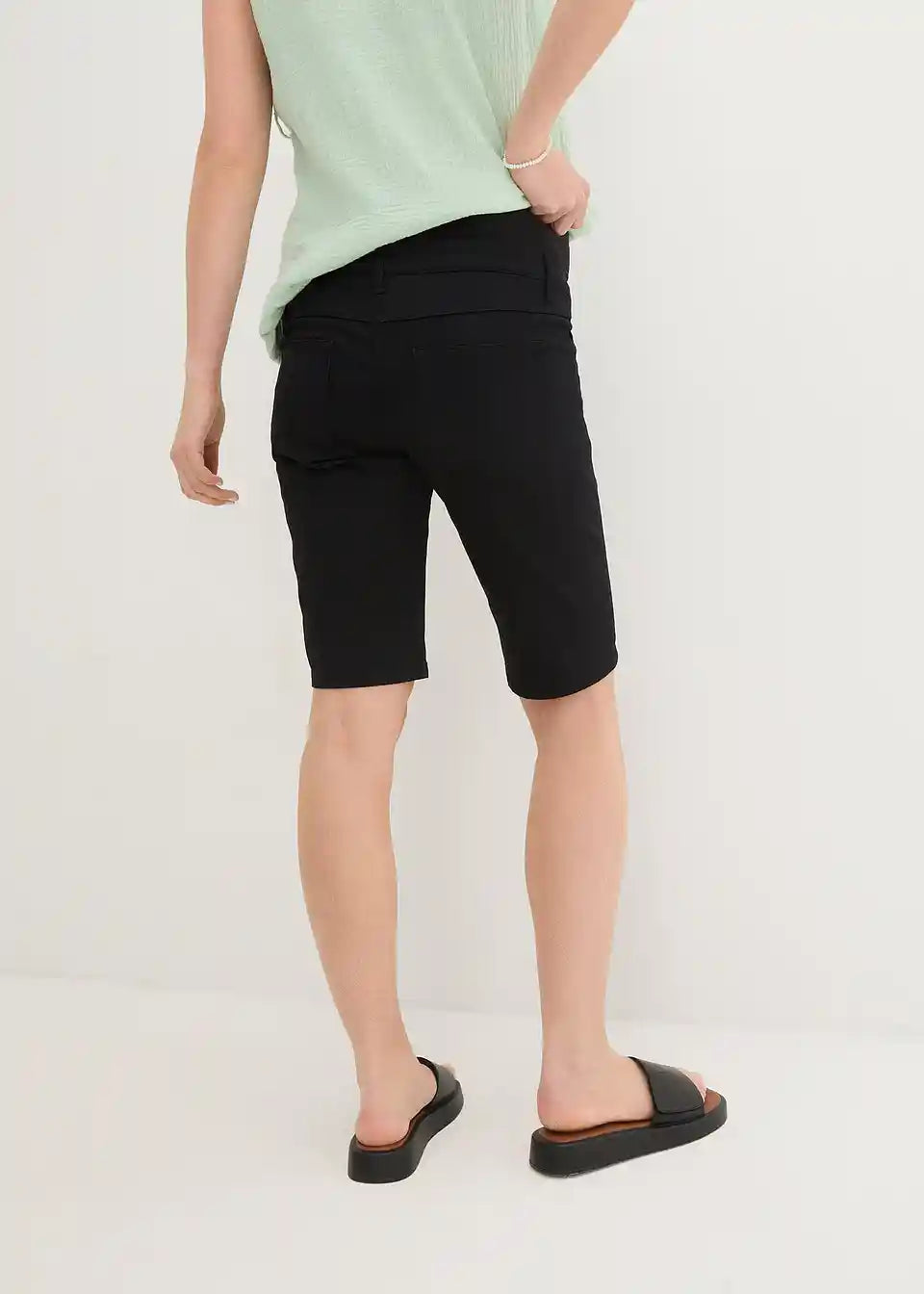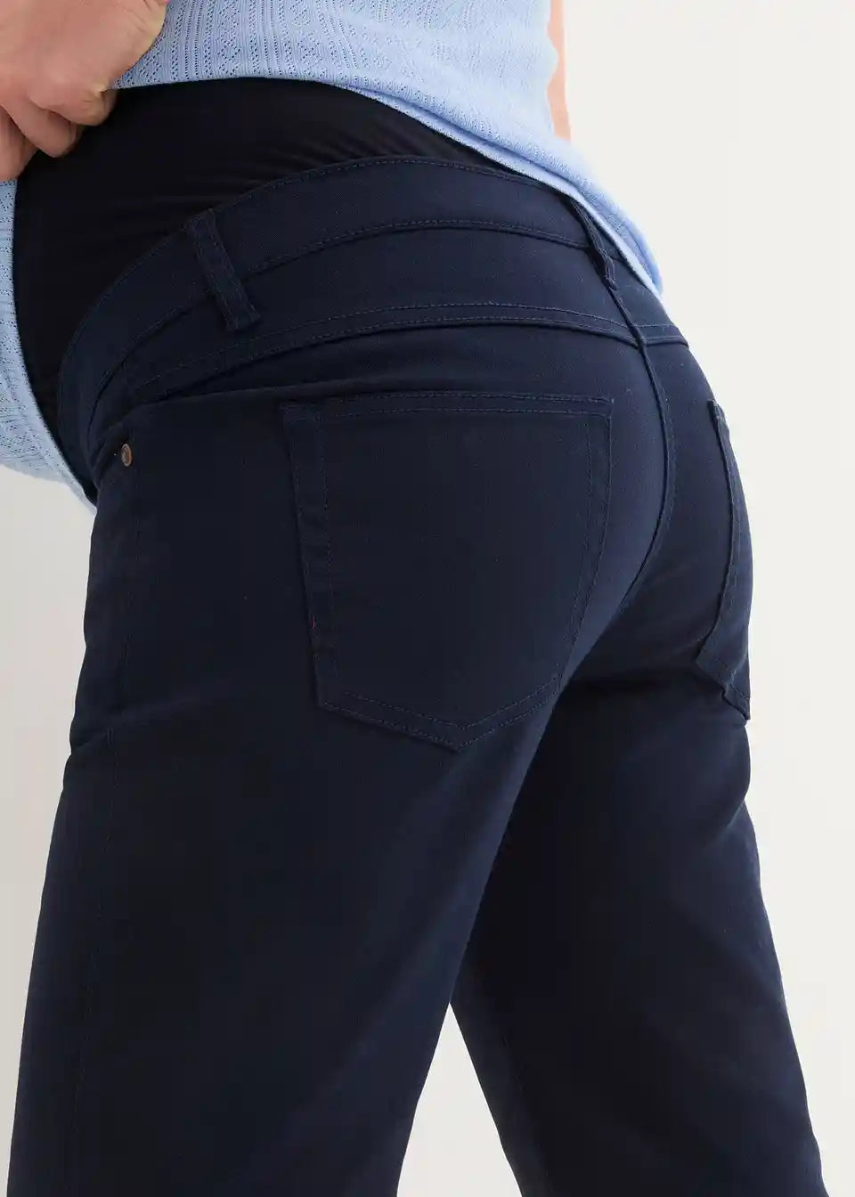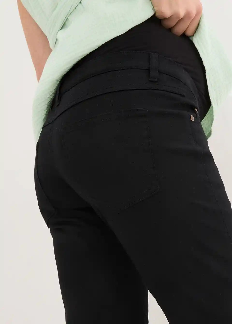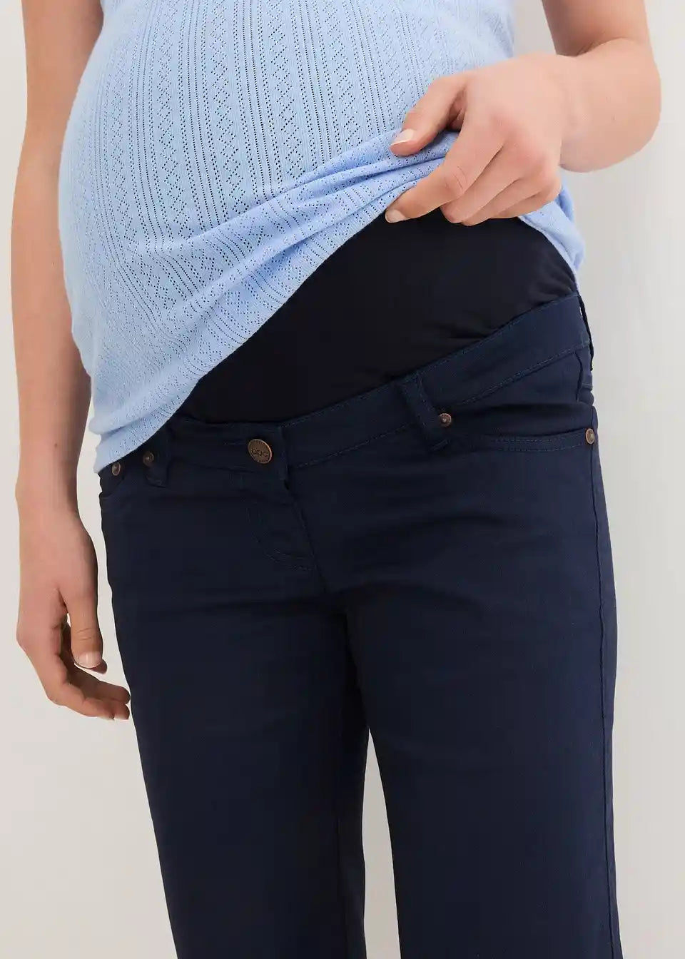Ove trudničke hlače dužine bermuda s podesivim pojasom i trakom od dresa za trbuh mogu se nositi tijekom cijele trudnoće. Pomaknuti bočni šavovi ovim trudničkim hlačama daju sjajnu figuru i vrlo su udobne. S uobičajenim prednjim i stražnjim džepovima.