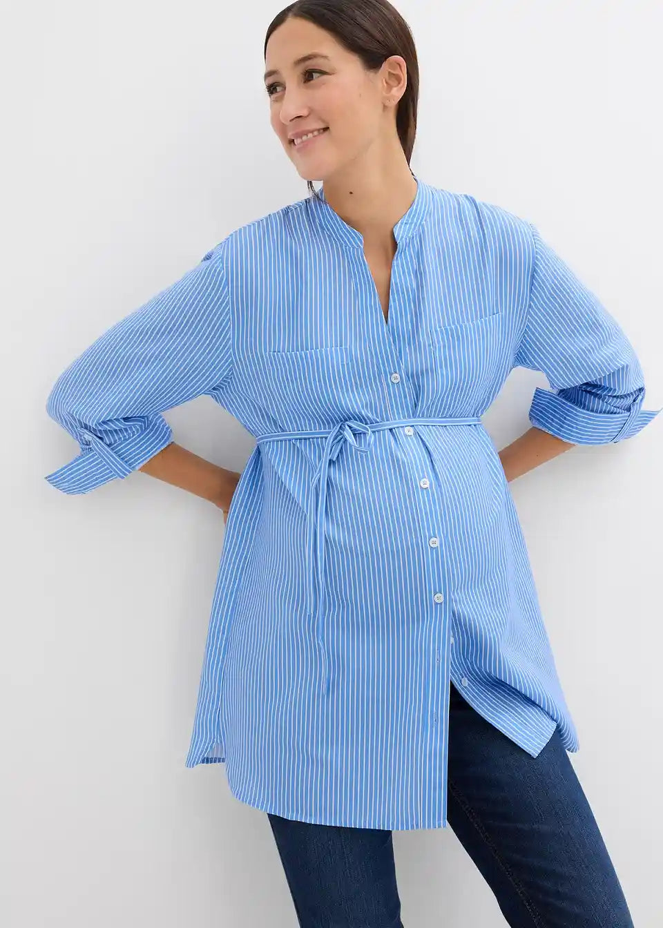 bluza od pamučnog popelina s postepenim kopčanjem, stojećim ovratnikom i uskim, odvojivim remenom ispod grudi. Dugi rukavi koji se mogu zavrnuti s manžetama na kopčanje i prorezom s gumbom. Bluza se može nositi tijekom trudnoće i nakon nje te je pogodna za dojenje.