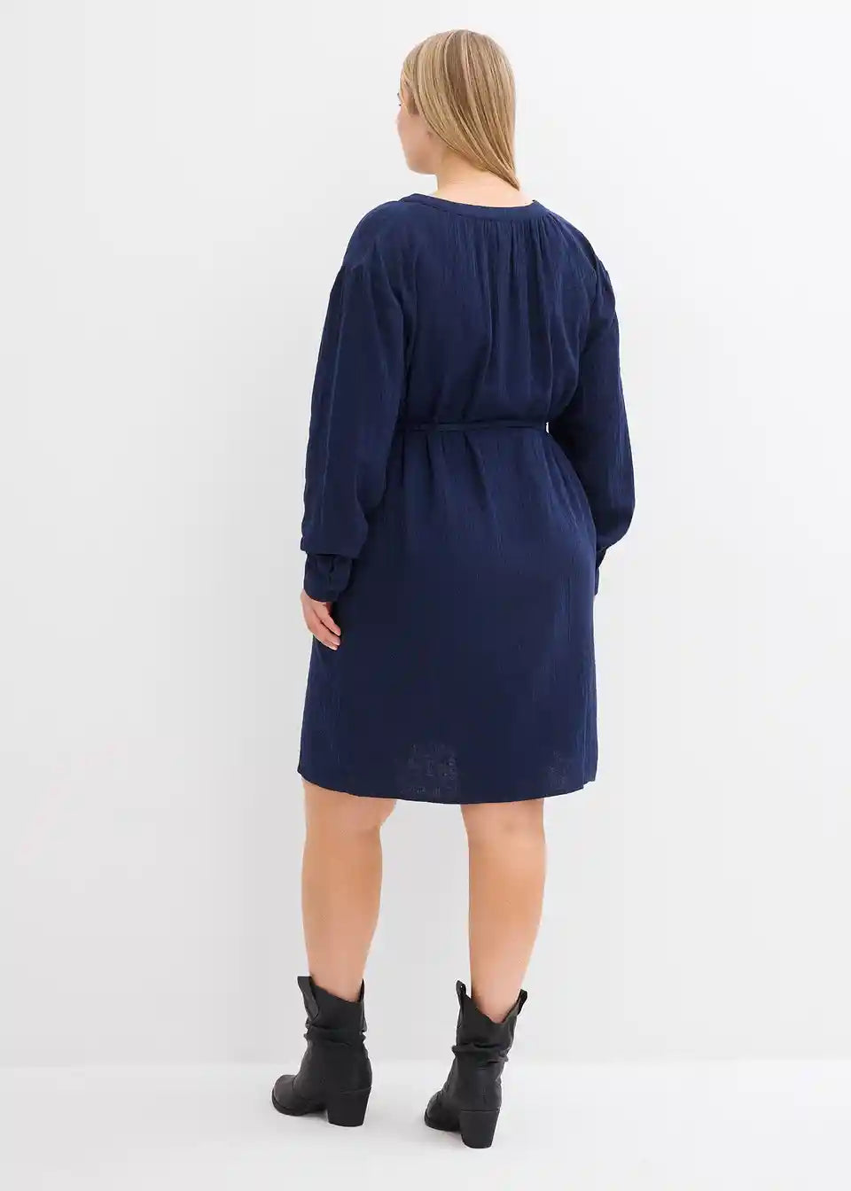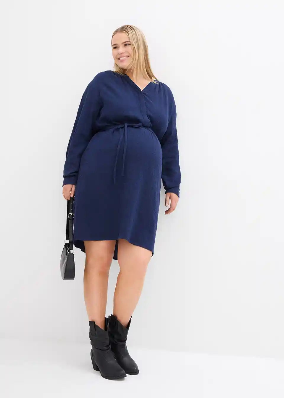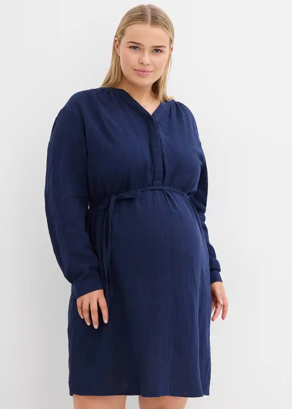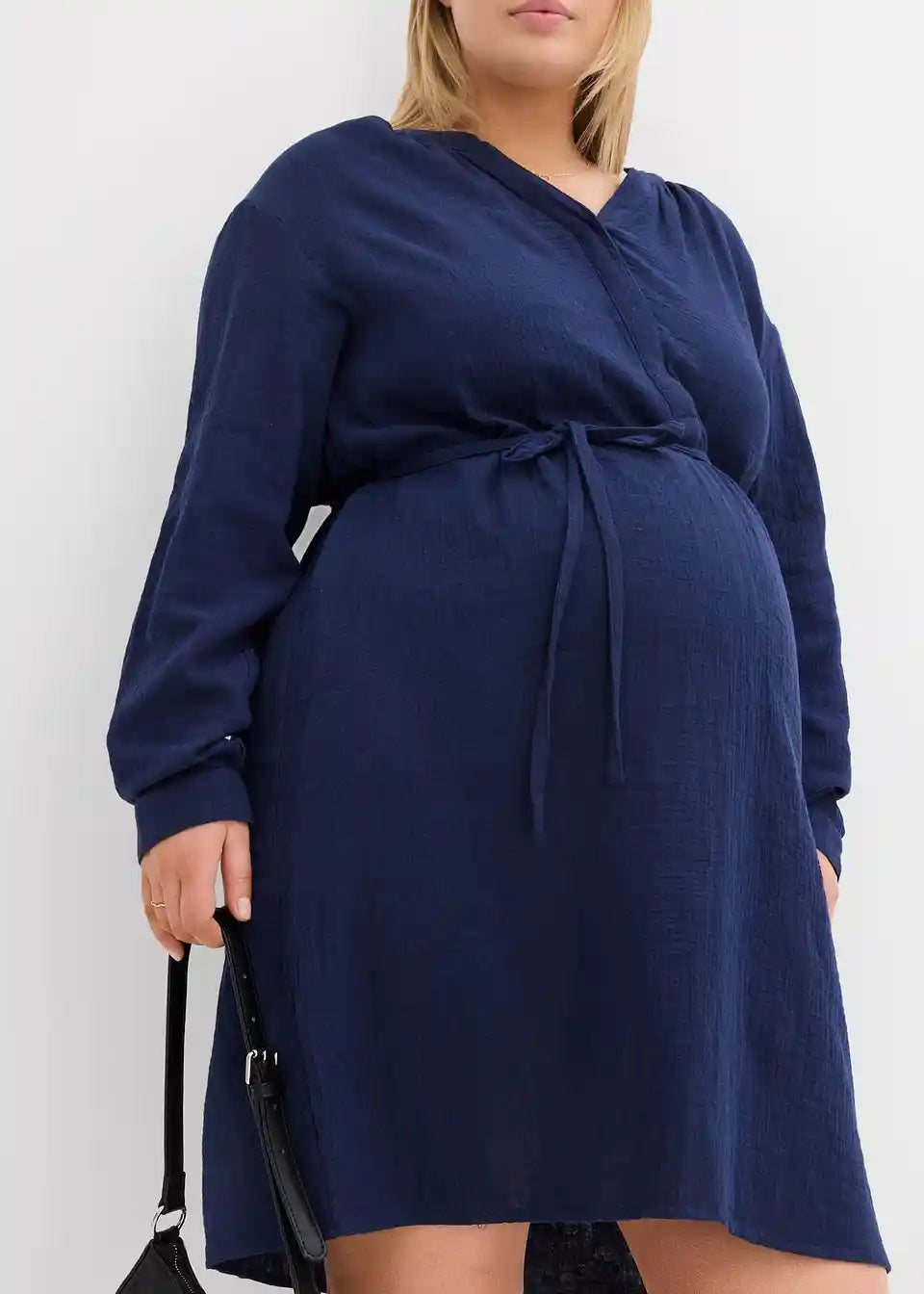 Trudnička haljina s funkcijom dojenja izrađena od čistog pamučnog muslina pruža maksimalnu udobnost tijekom trudnoće i u razdoblju dojenja. Haljina ima malu stojeću kragnu i dugu kopčanu traku s skrivenim drukerima, što omogućuje jednostavno dojenje i udobno oblačenje i svlačenje. Odvojivi pojas naglašava rastući trudnički trbuh. Dugi rukavi opremljeni su manžetama i gumbima. Mekani, prozračni pamučni materijal osigurava ugodan osjećaj nošenja.