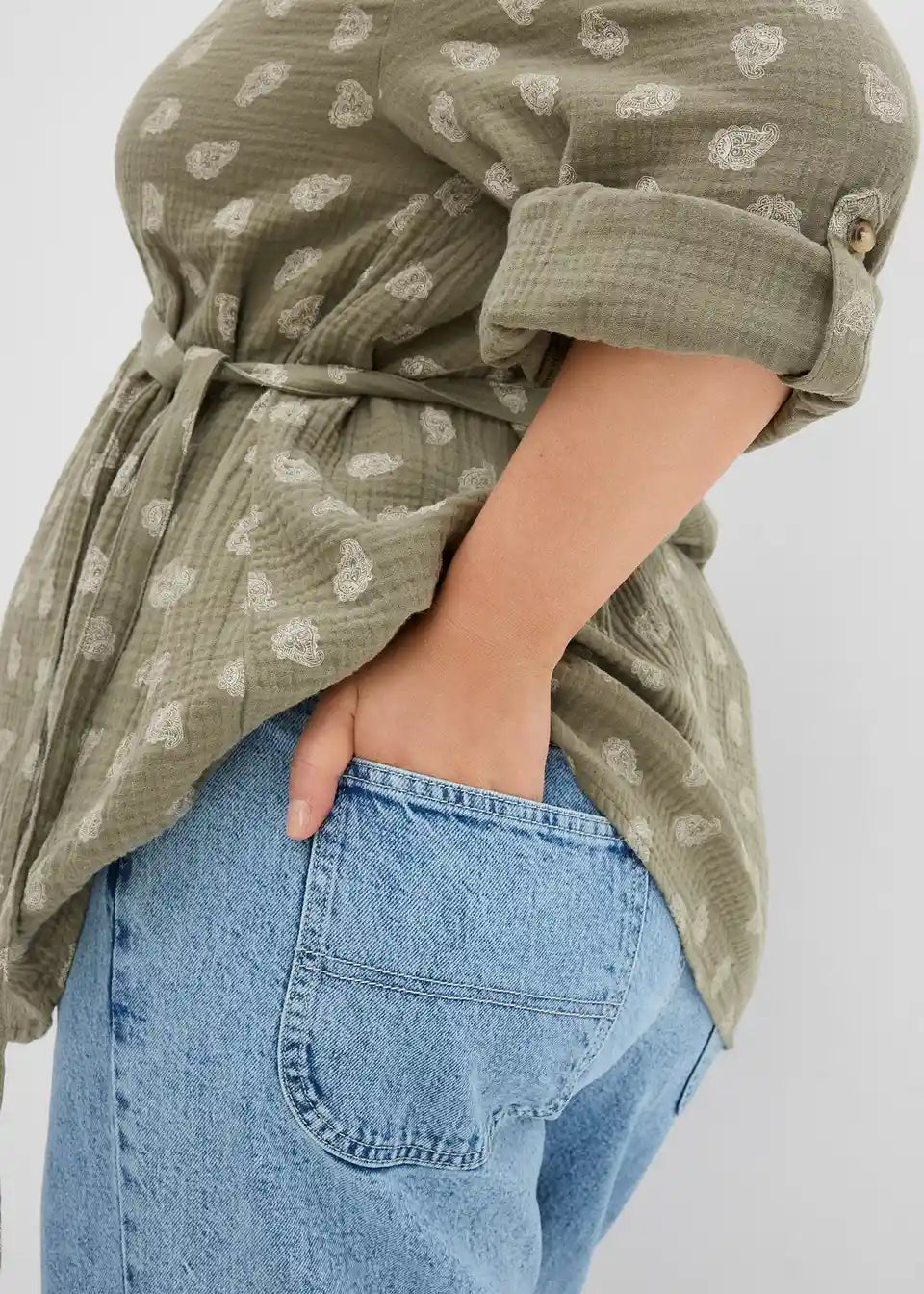 Prozračna trudnička bluza od čistog pamučnog muslina sa stiliziranim Paisley uzorkom. V-izrez i mali ovratnik daju ženstveni izgled, dok podesivi pojas nježno naglašava rastući trudnički trbuh. Nakon trudnoće, puna dugmad omogućuje jednostavno dojenje. Rukavi se mogu individualno prilagoditi pomoću traka i dugmadi. Meki, prozračni pamuk osigurava maksimalnu udobnost – svestran komad za trudnoću i razdoblje dojenja.