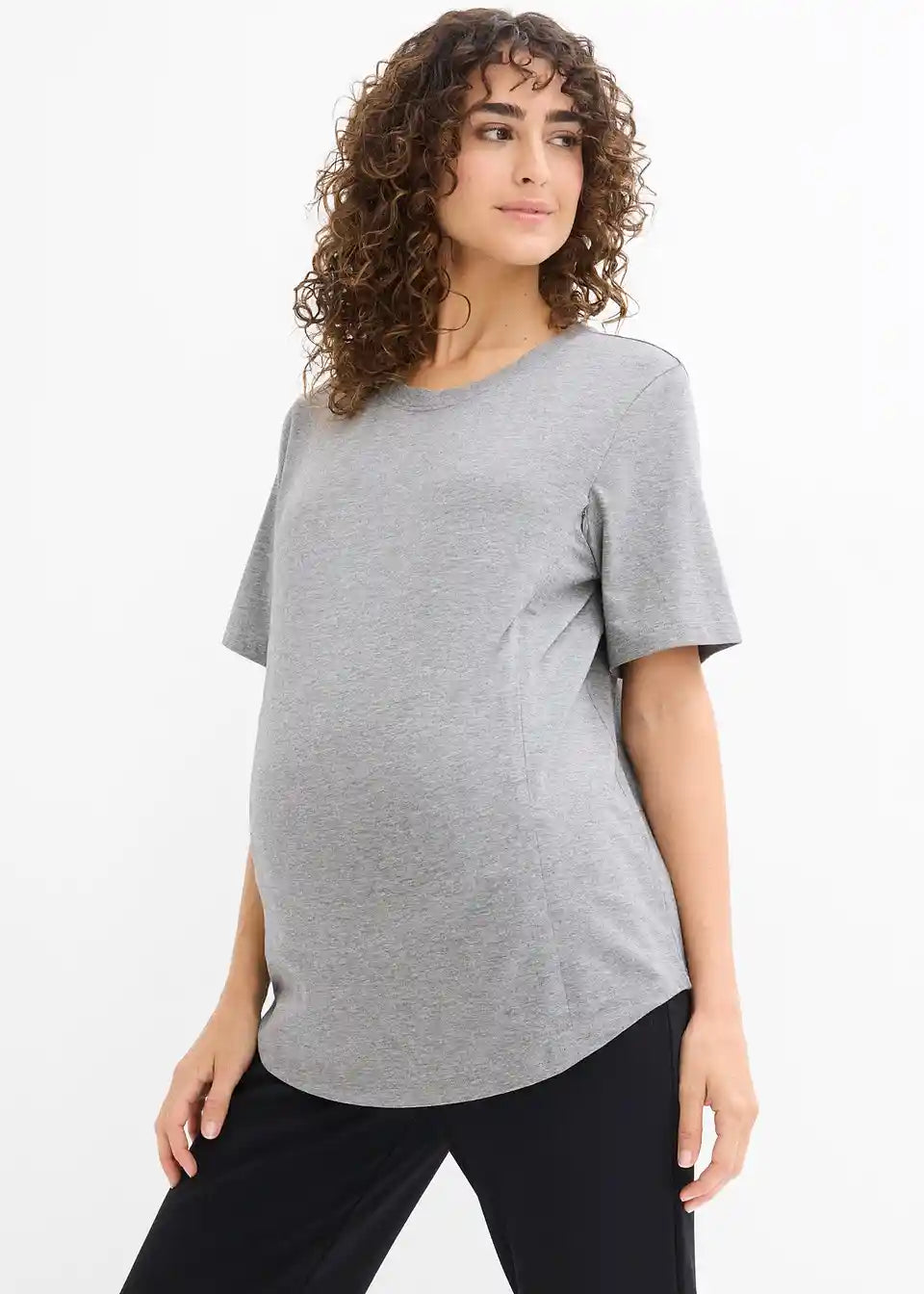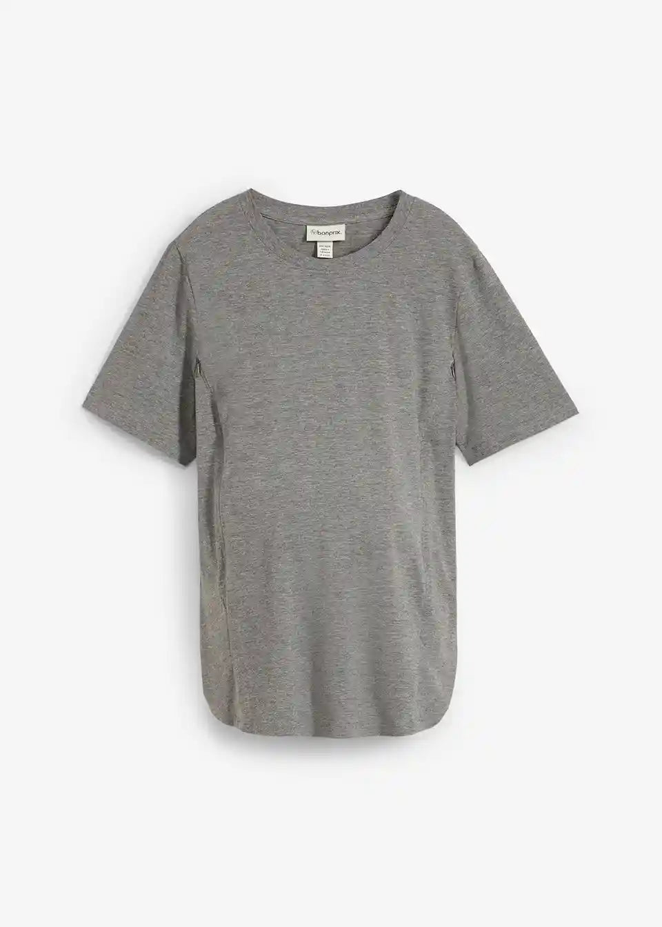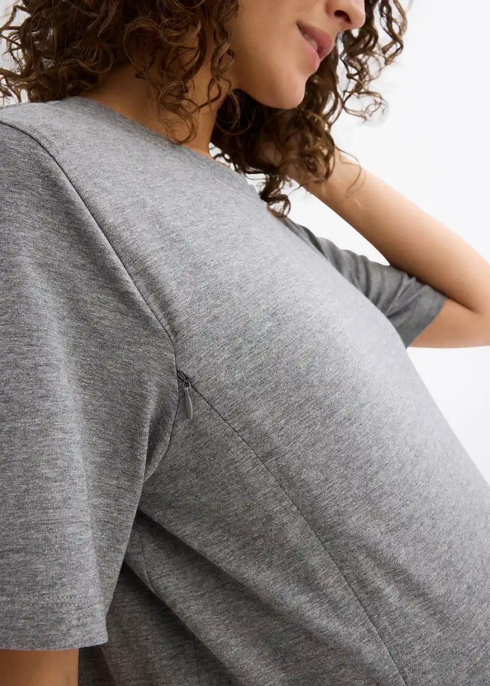 Praktičan trudnički basic od mekanog jerseyja od organskog pamuka s malo rastezljivosti za ugodnu udobnost nošenja. S okruglim izrezom i kratkim rukavima laskave duljine. Dva diskretno ugrađena patentna zatvarača na prednjem dijelu omogućuju nakon poroda jednostavno i diskretno dojenje, bez prevelikog otkrivanja.