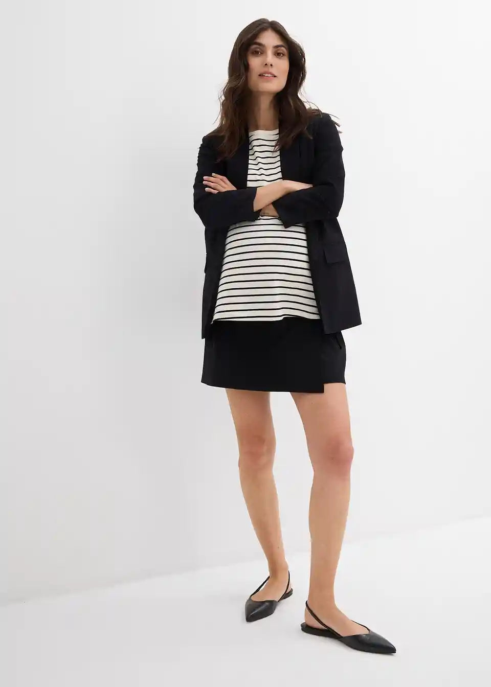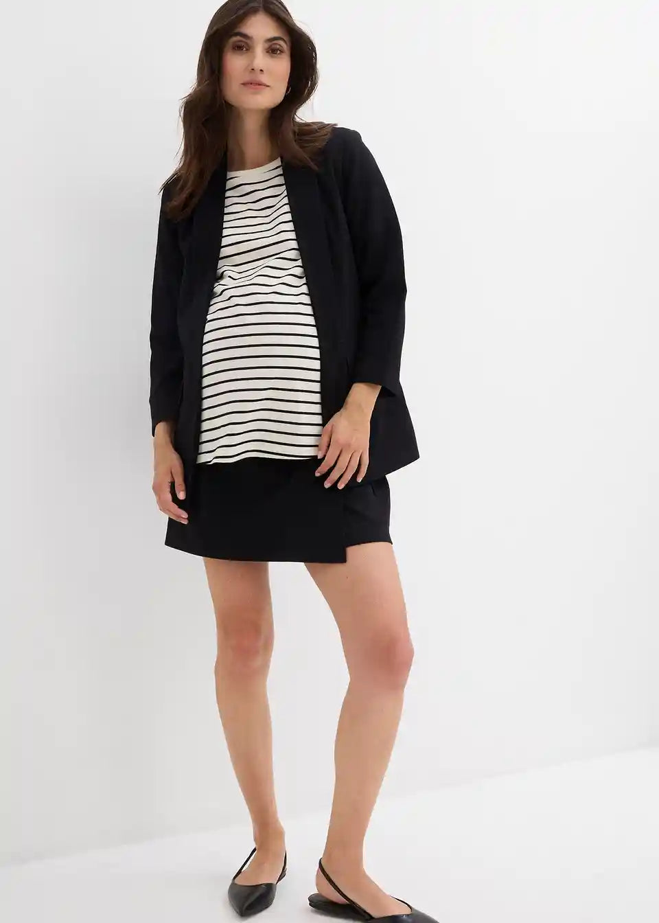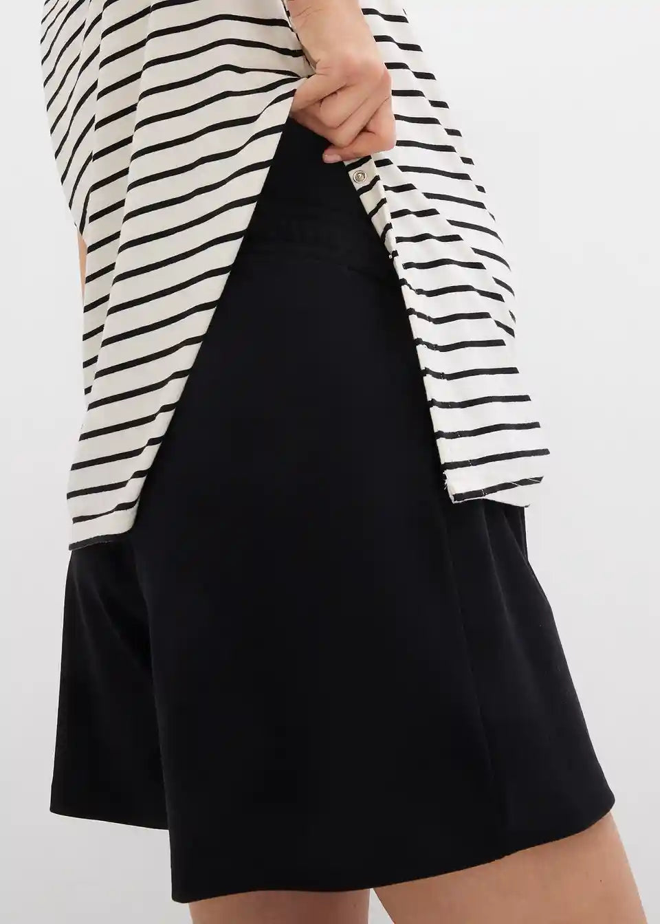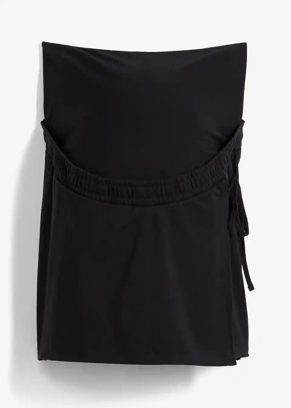 Trudničke hlačnate suknje od mekano, gusto tkanog interlocka na prvi pogled izgledaju kao suknja, ali nude udobnost hlača. Prednji dio je dizajniran s izgledom preklopa, podesivom trakom za vezanje i mekom elastičnom trakom u pojasu. Široki pojas od jerseya s dodanim rastezljivim pamukom osigurava savršeno pristajanje trbuhu.