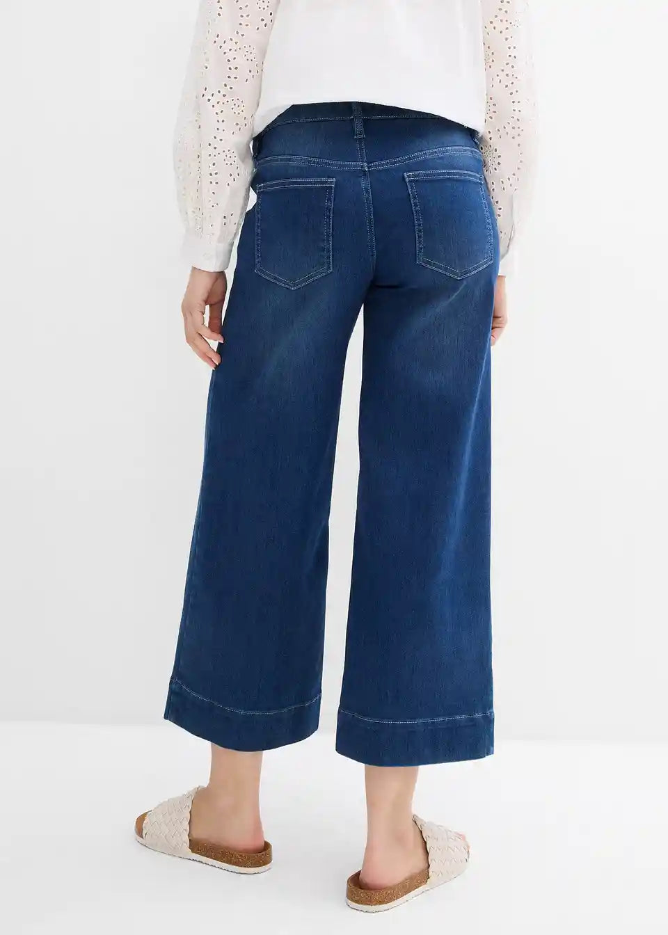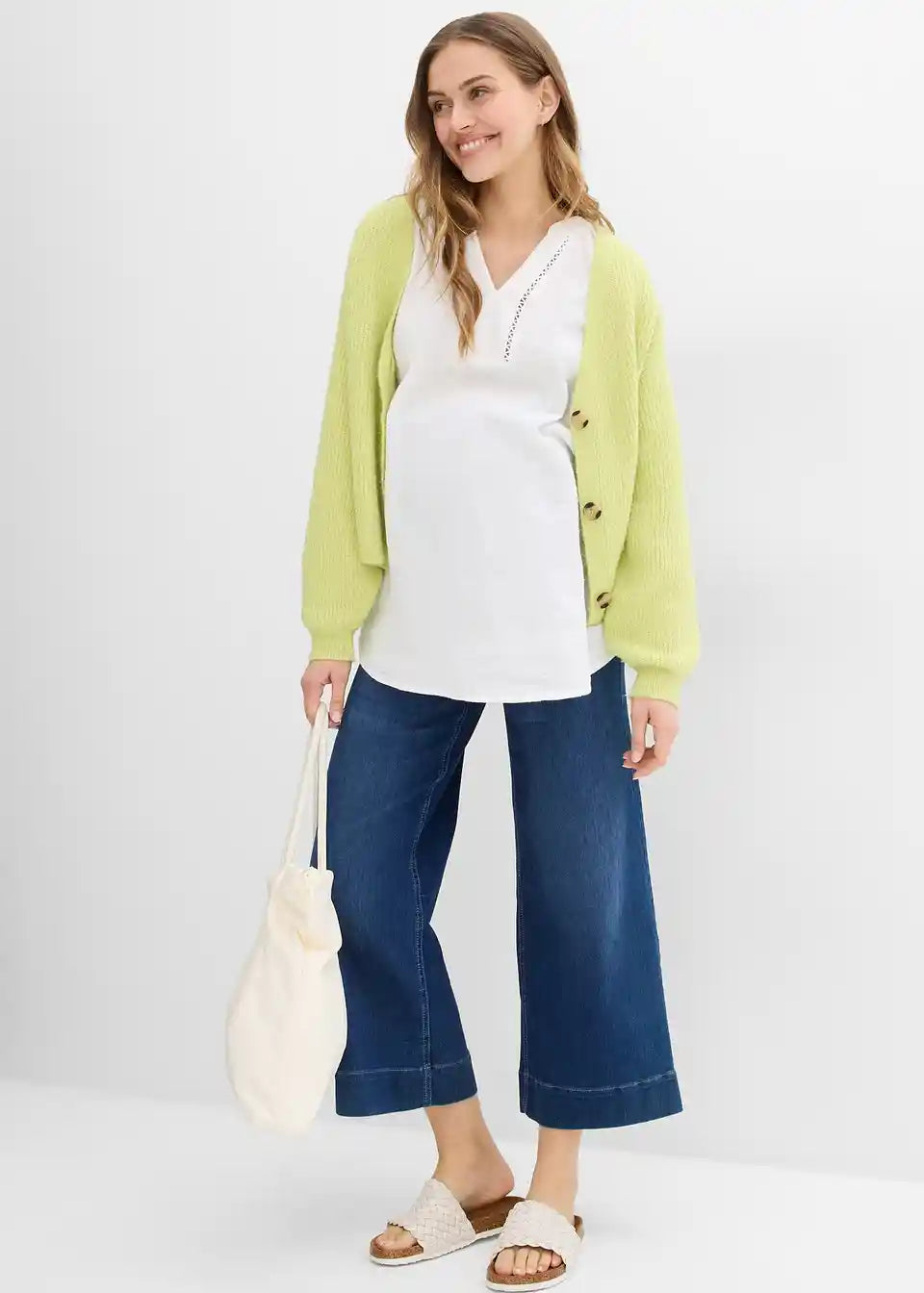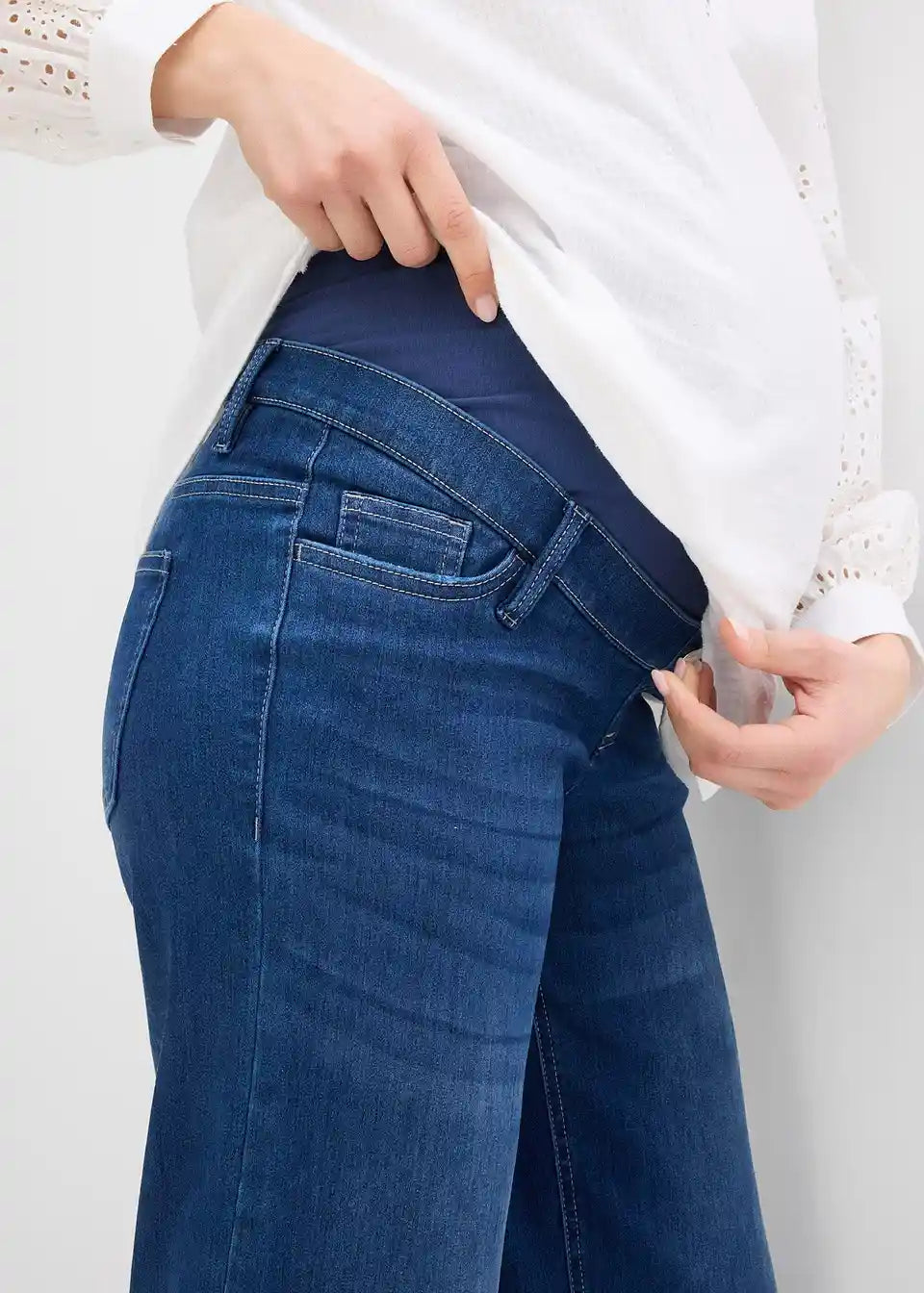 Traperice dužine do gležnja s 5 džepova izrađene od mekanog rastezljivog trapera za ugodno nošenje. Elastični, niski struk s integriranom i podesivom gumicom koja omogućava prilagodbu traperica mjesecu trudnoće. Široki kroj od bokova do bedara i završetak nogavica s dekorativnim podvrnutim rubom. Široki, ušiveni pojas od pamučnog stretcha osigurava optimalno prijanjanje na području trbuha.