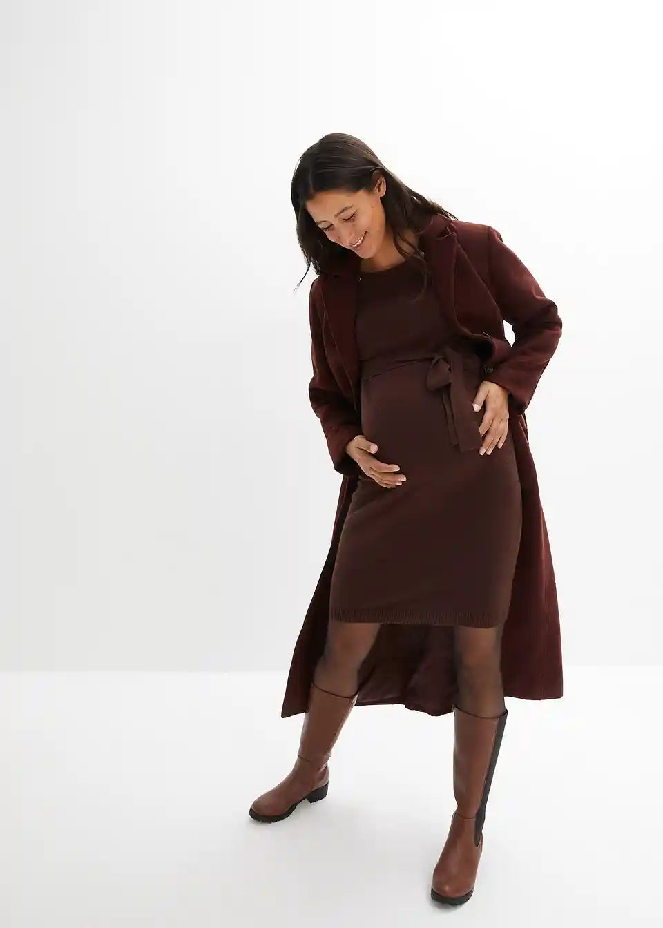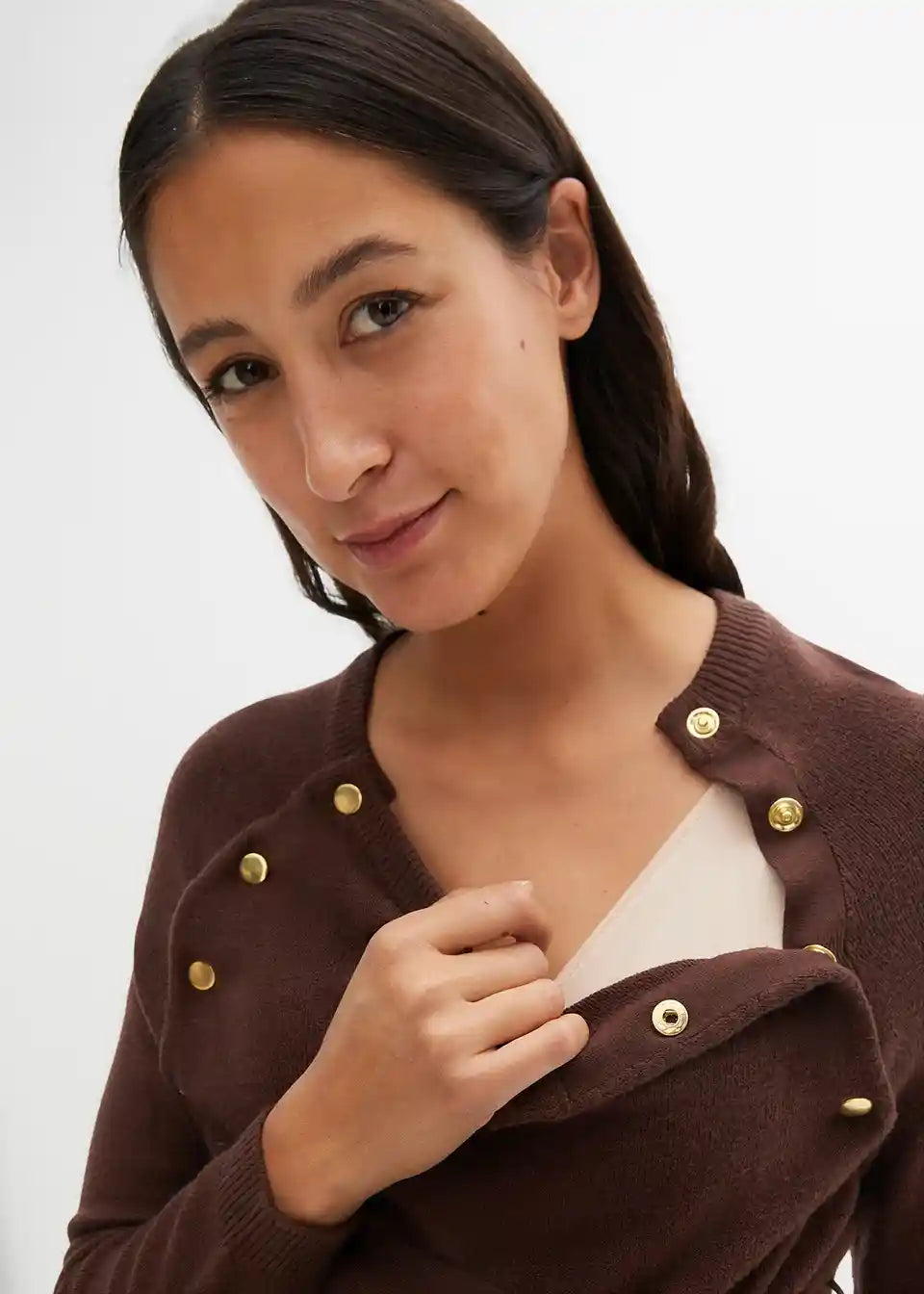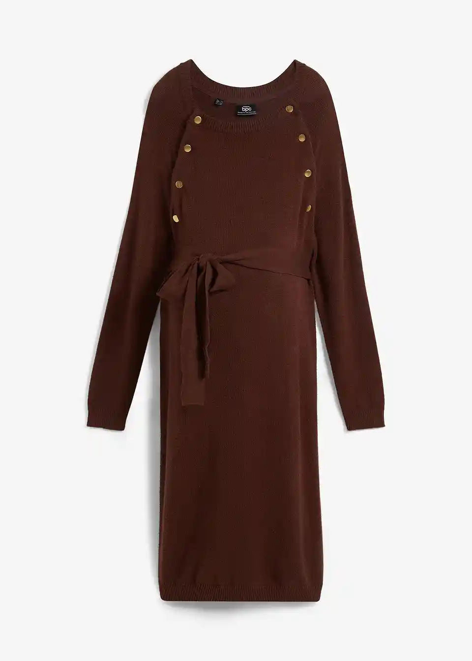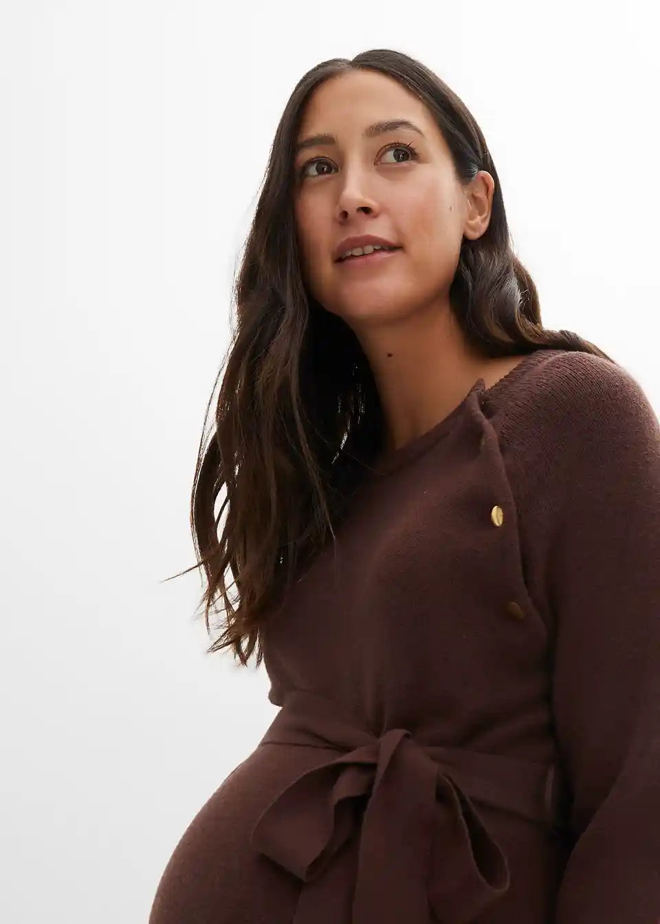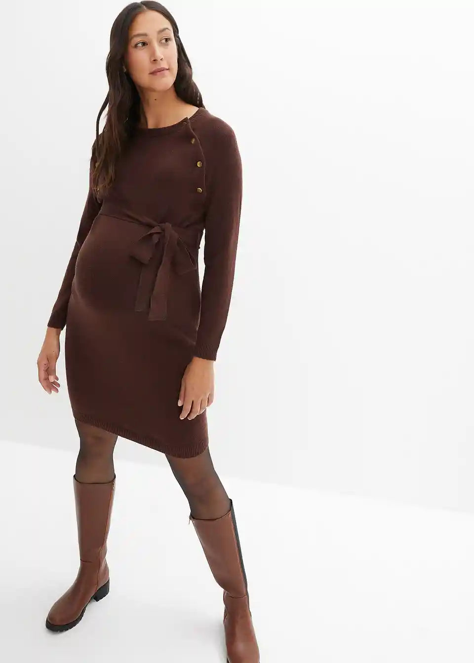 Ova pletena haljina prikladna je za svaki mjesec trudnoće, a također i kao haljina za dojenje zahvaljujući gumbima na preklopu kraj izreza. Izuzetno mekan i udoban materijal. Ova kombinacija pruža ugodan i topao osjećaj tijekom nošenja.