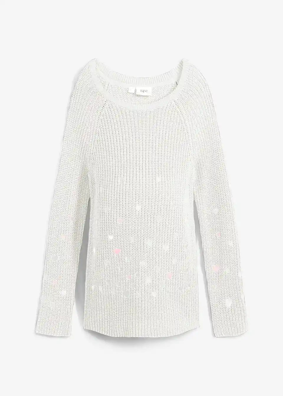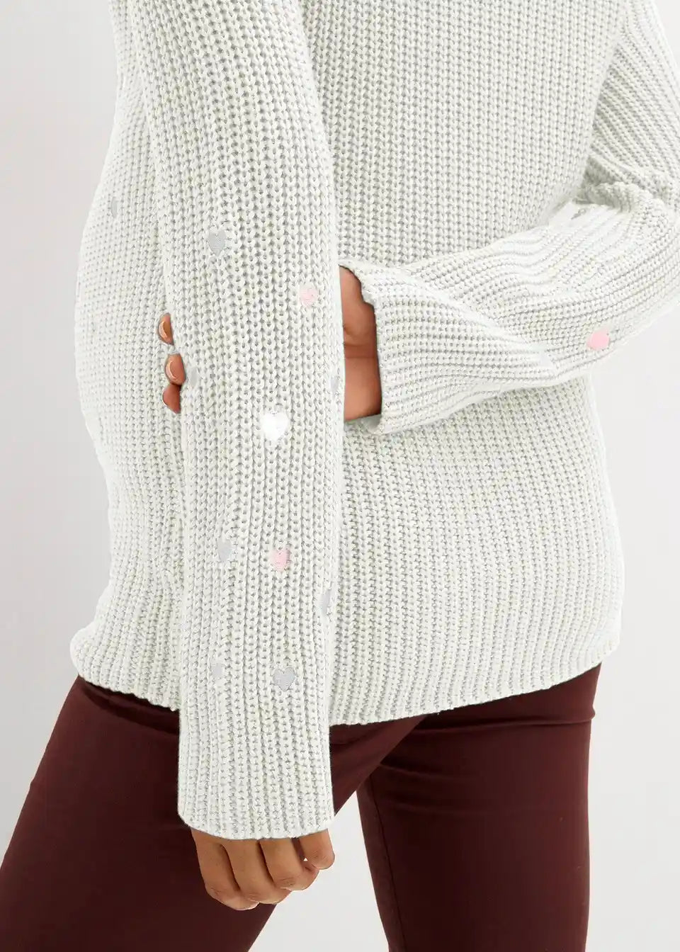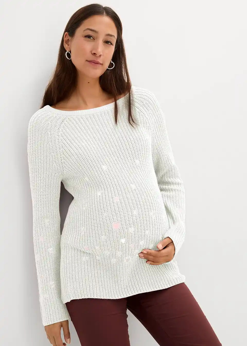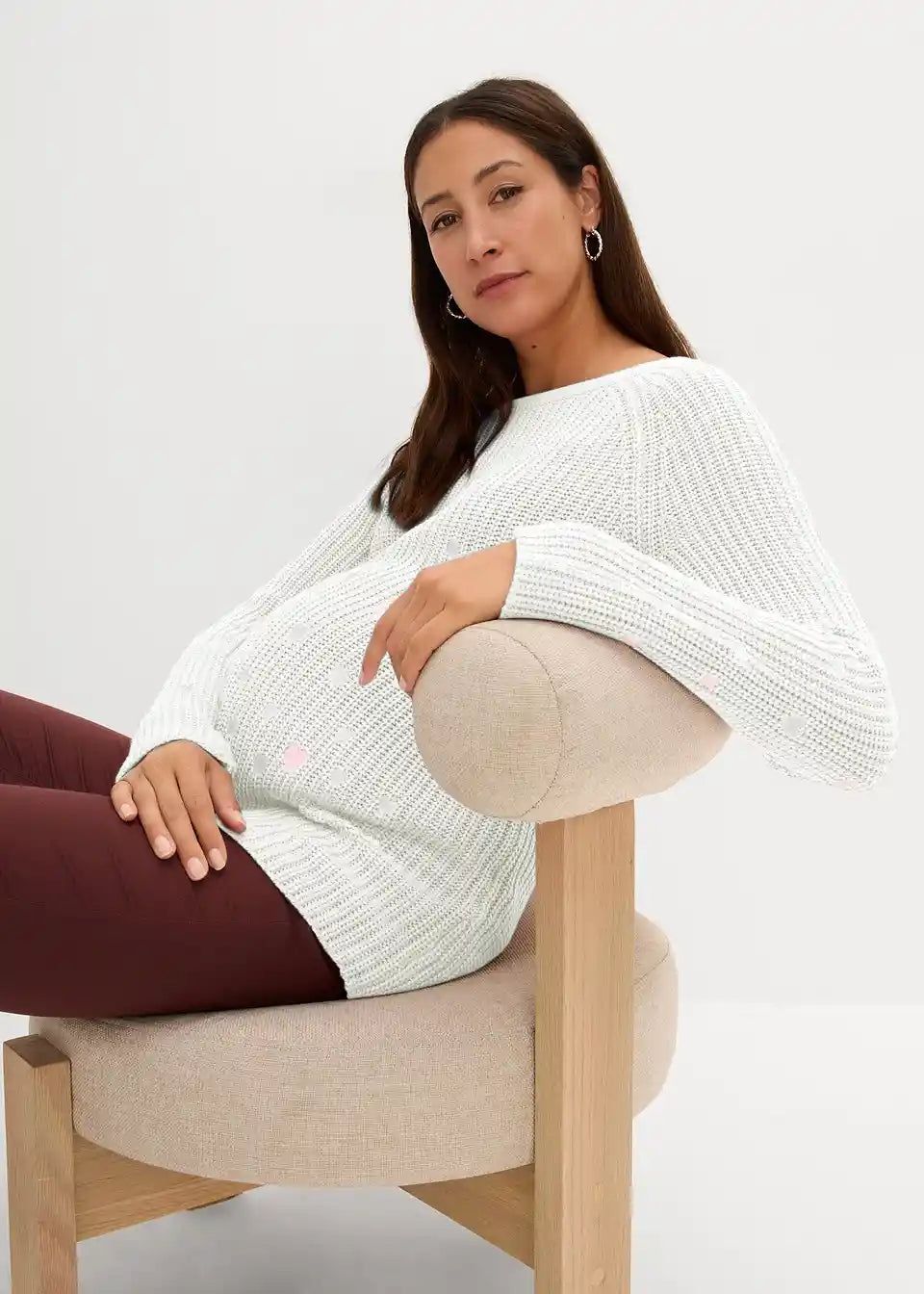Trudnički pulover zahvaljujući udjelu pamuka ugodno prianja na kožu i pruža udoban osjećaj tokom nošenja. Zahvaljujući materijalu, pulover se prilagođava rastućem trudničkom trbuhu i sa srcastim detaljima idealan je pratitelj tijekom cijele trudnoće.
