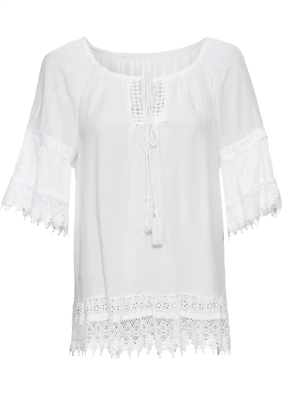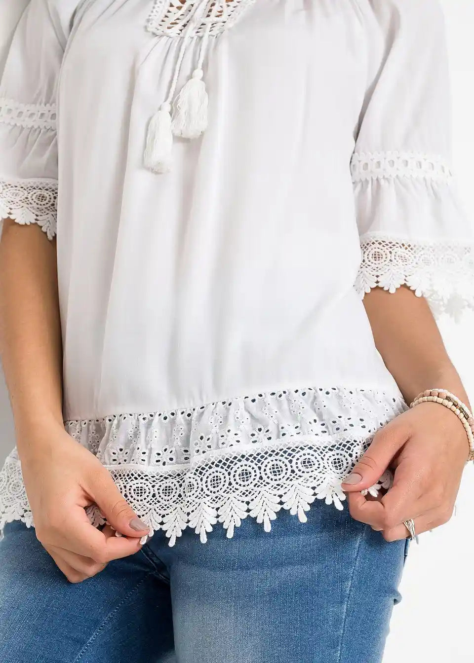 Detaljno izrađena tunika s čipkom i volanima na rukavima i rubu, lagano prozirni materijal