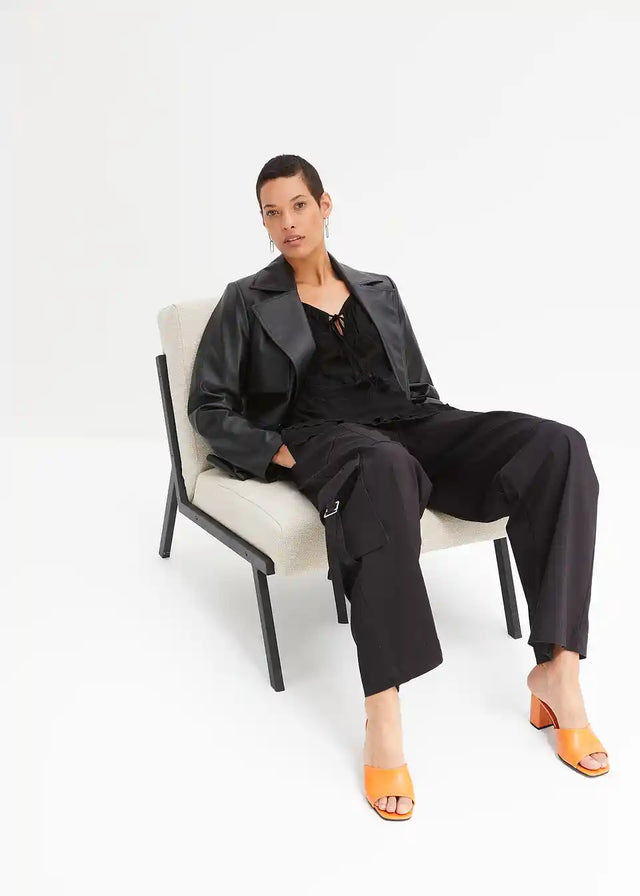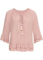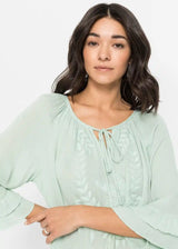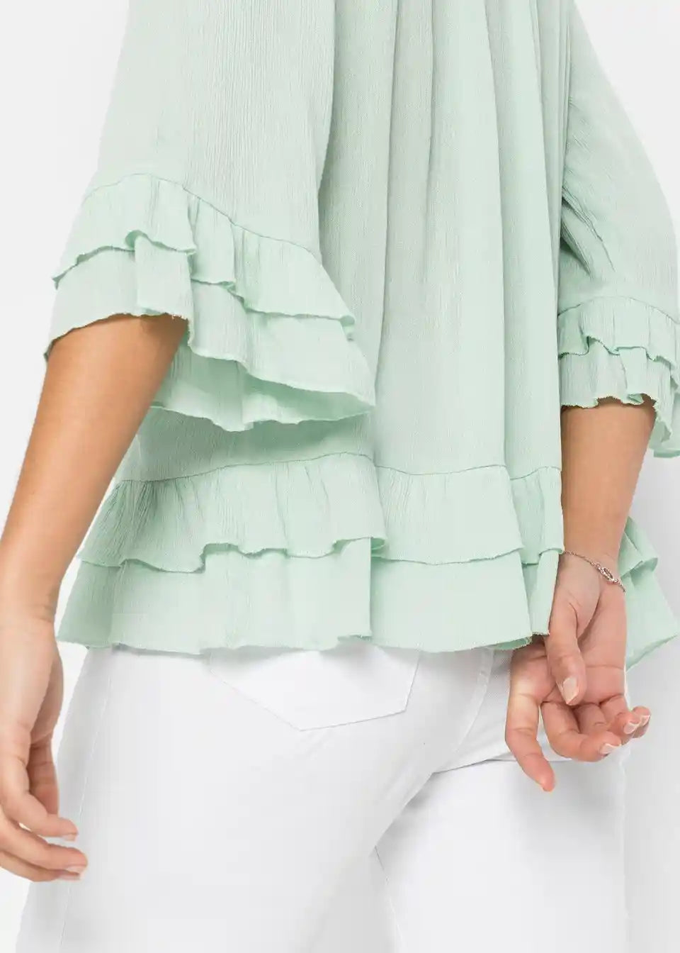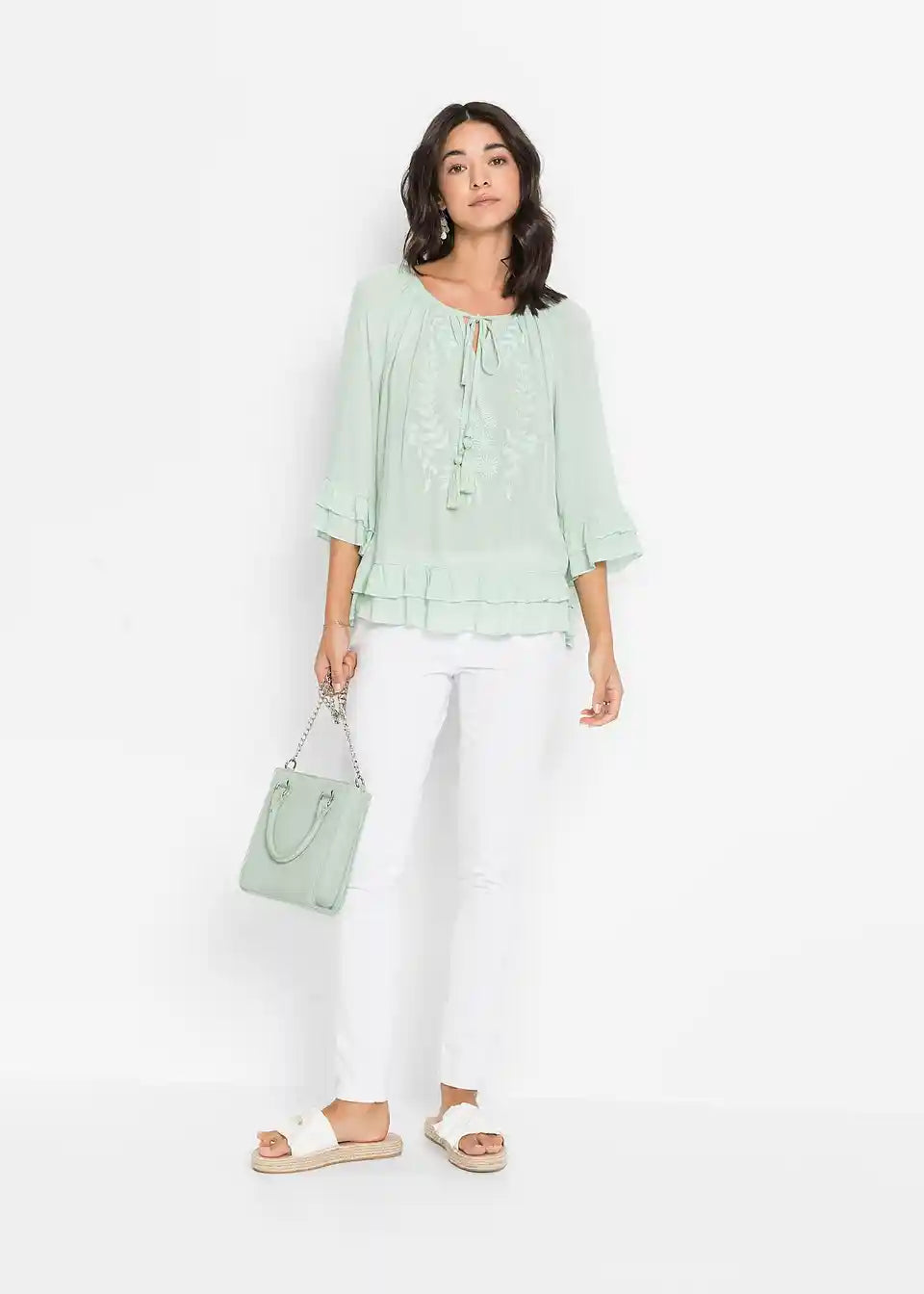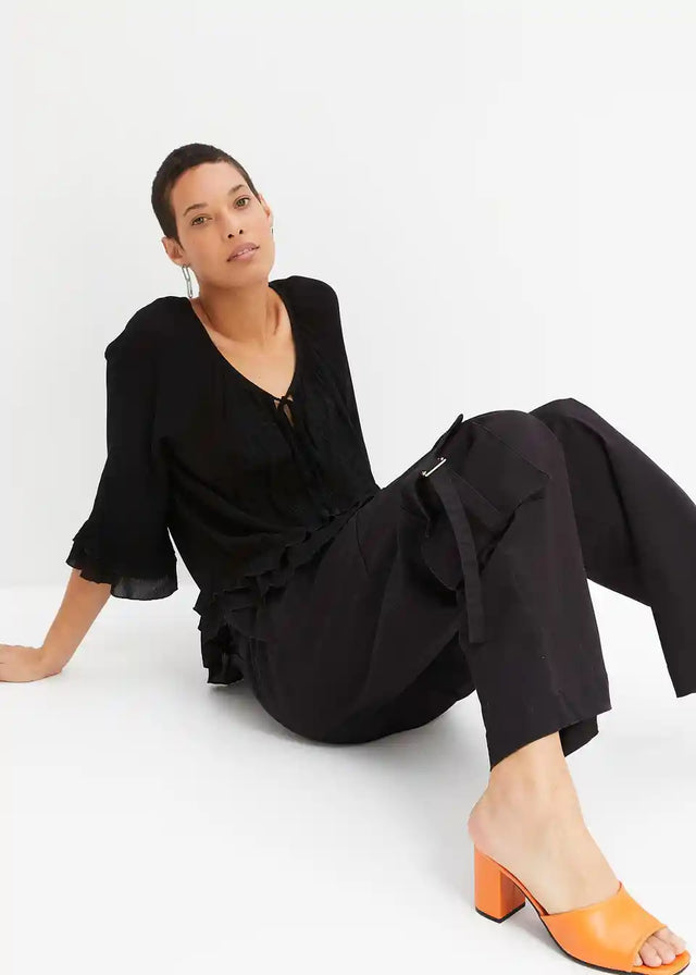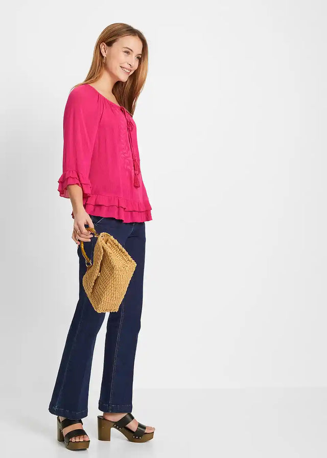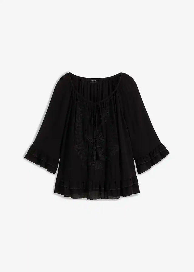 Ova bluzica s ton-sur-ton vezom brenda BODYFLIRT osvaja svojim nježnim šarmom. Lijepi nabori krase široki okrugli izrez, ispod kojeg se nalazi mali izrez. Duge vezice s resicama pružaju ležeran naglasak. Dvostruki volani ističu rub rukava i porub. Ležerna silueta savršeno zaokružuje ovu bluzu s vezom.