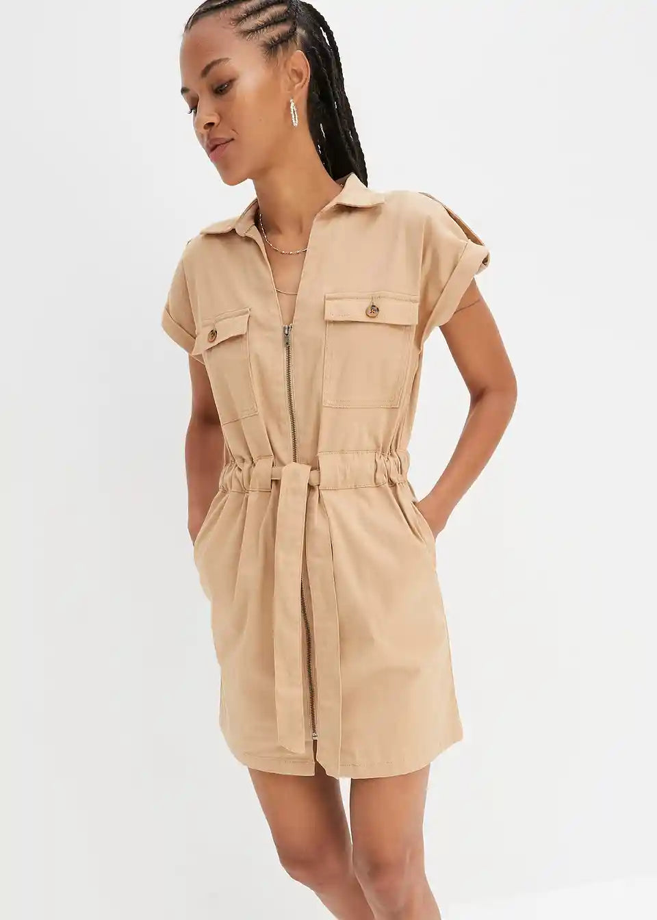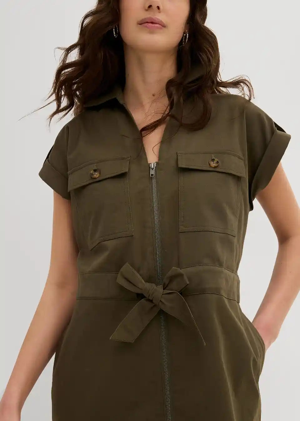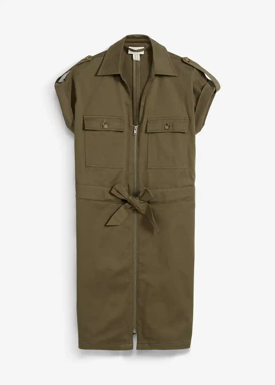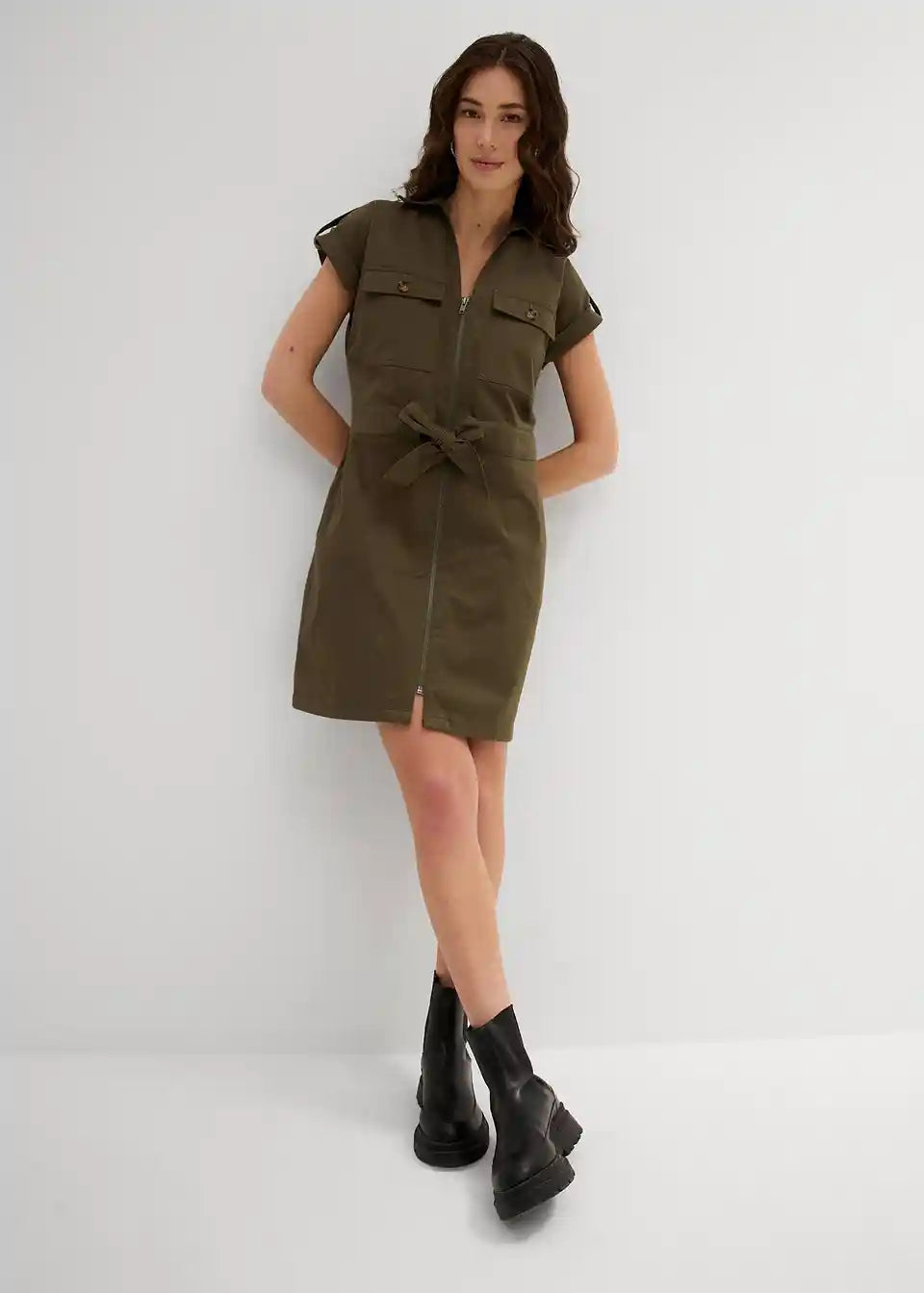 Trendovska twill haljina s cargo detaljima i podesivim pojasom na vezanje u struku, ležernog kroja.