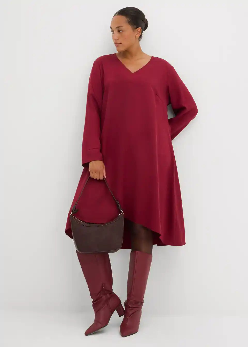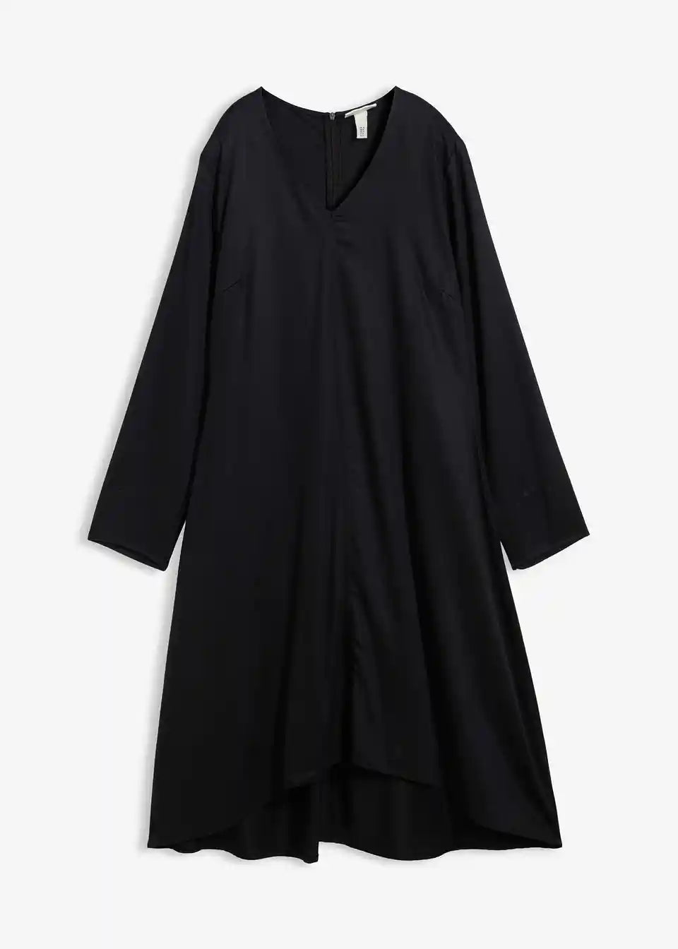 Poluduga, zvonasta haljina s naborima na završecima rukava te ukrasnim šavom sprijeda i straga. Sakriveni patentni zatvarač straga.