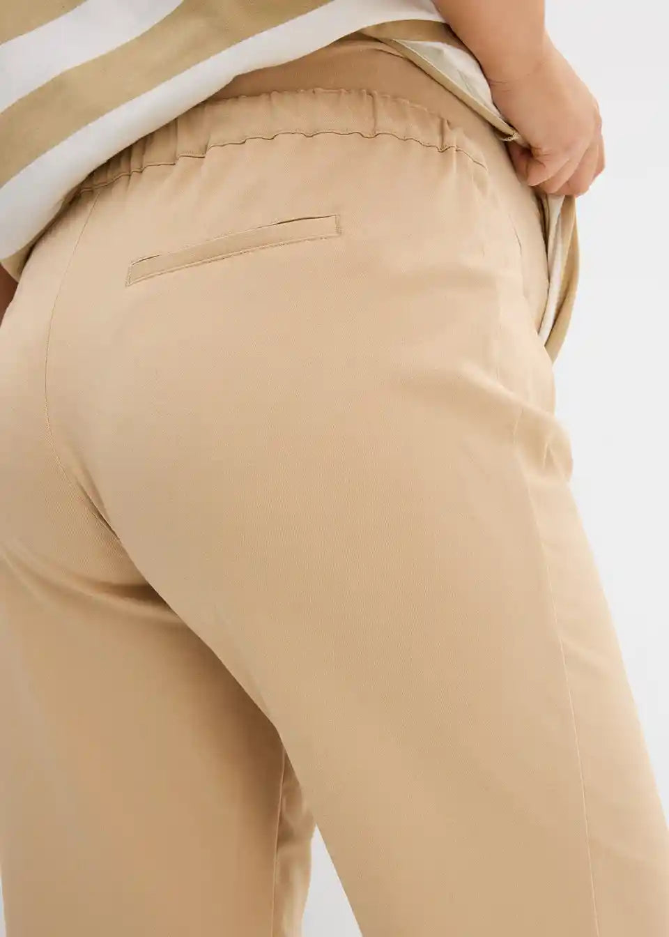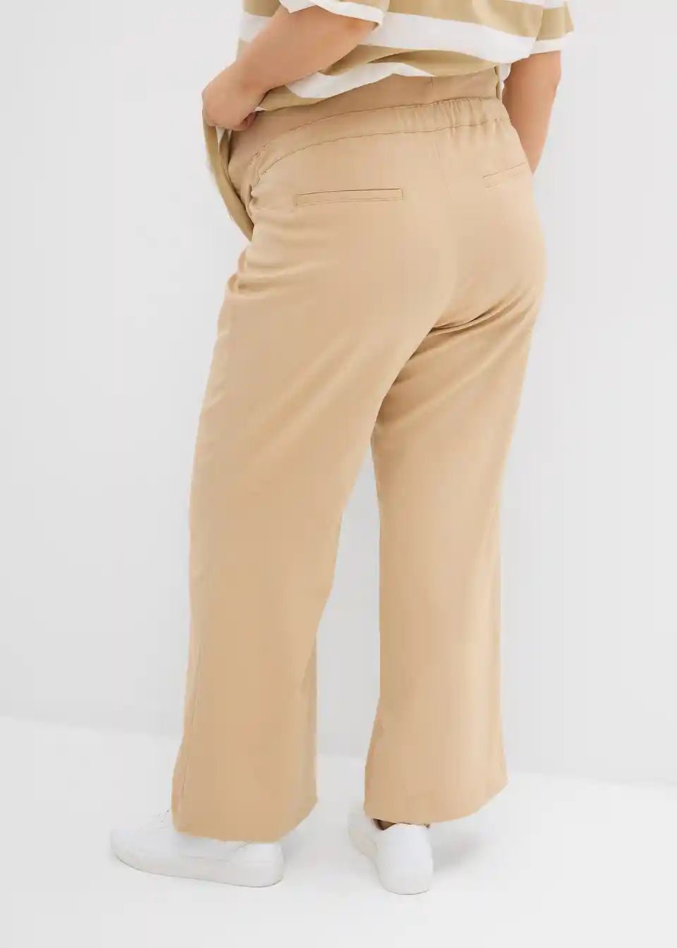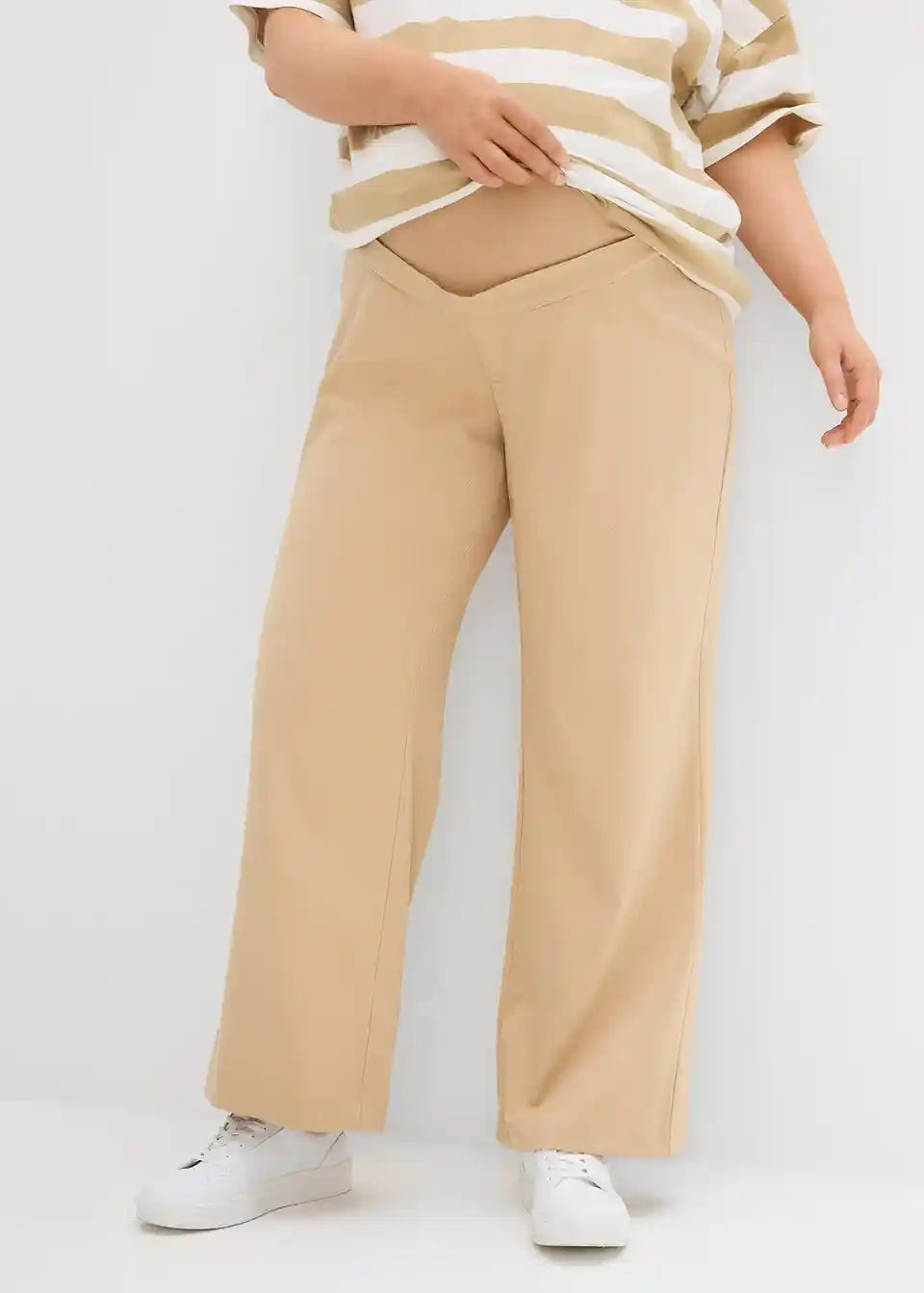 Ležerne trudničke hlače od tkanine ravnog kroja. Elastična traka na stražnjem pojasu prilagođava se širini trbuha i osigurava udobno pristajanje. S naznačenim džepovima s preklopom na stražnjoj strani.