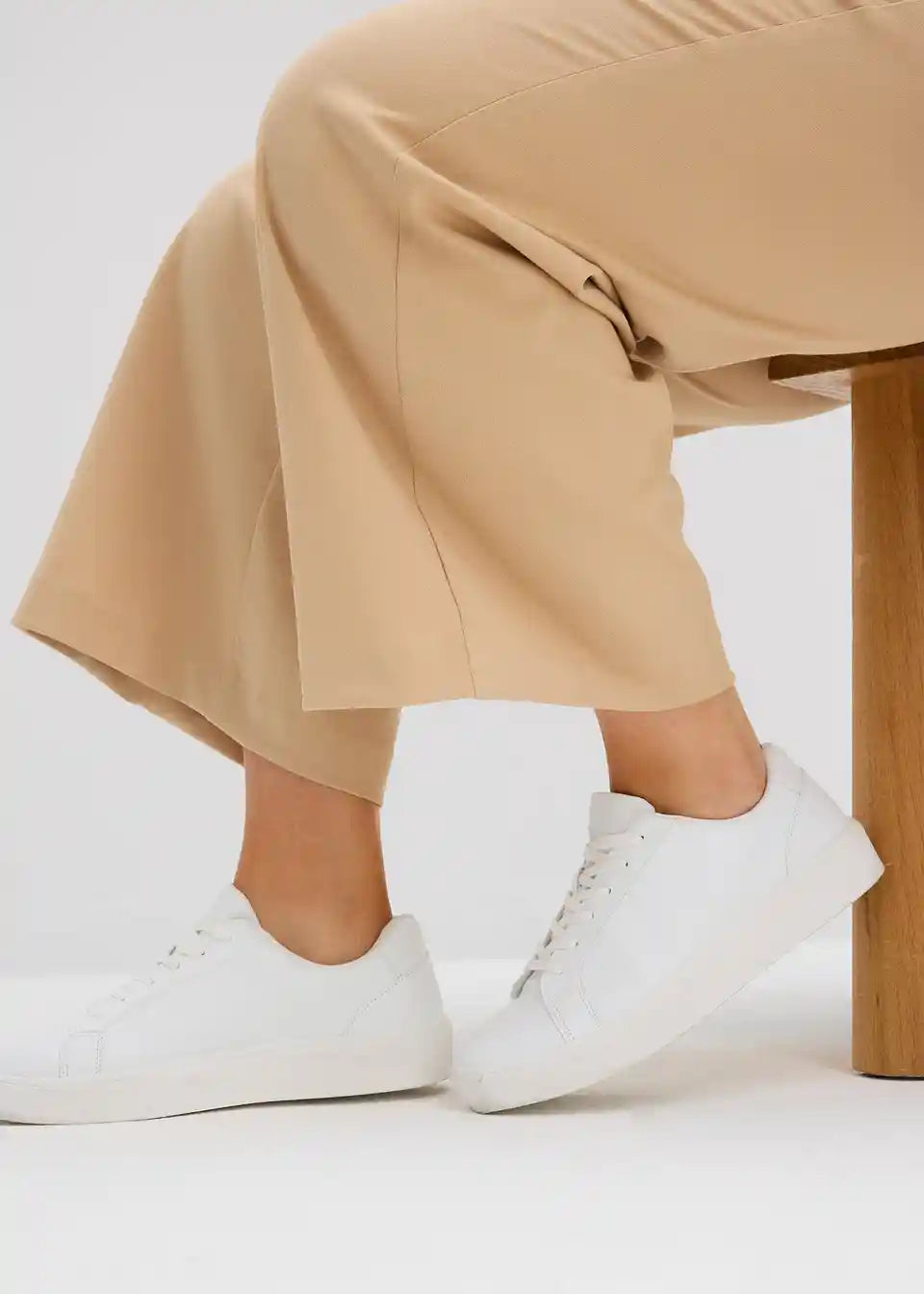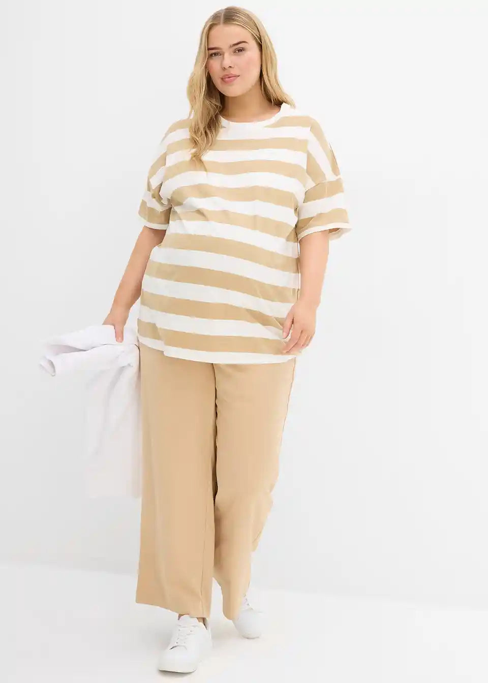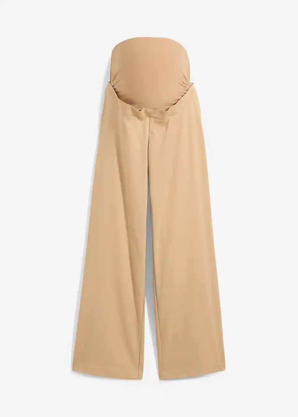 Ležerne trudničke hlače od tkanine ravnog kroja. Elastična traka na stražnjem pojasu prilagođava se širini trbuha i osigurava udobno pristajanje. S naznačenim džepovima s preklopom na stražnjoj strani.