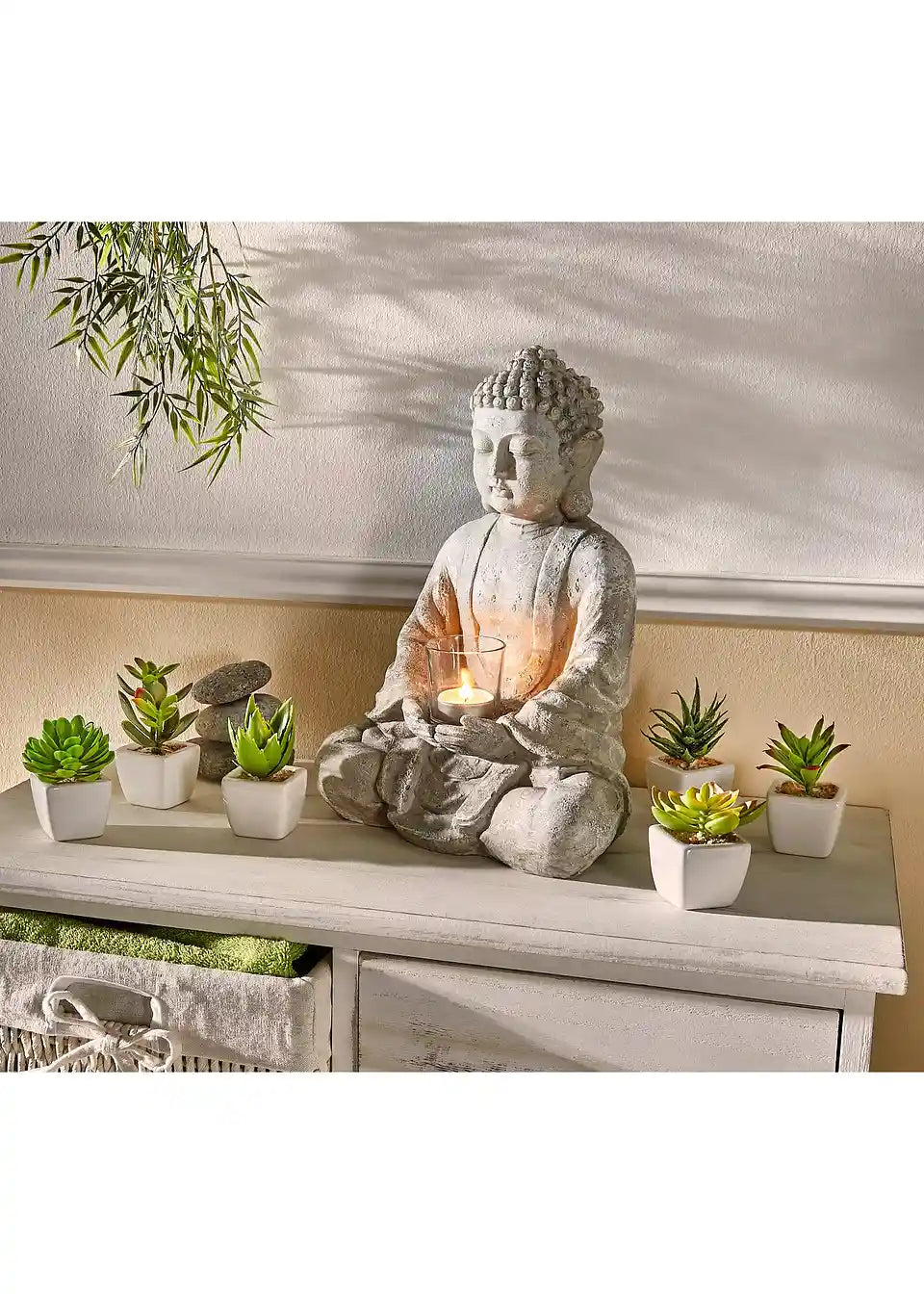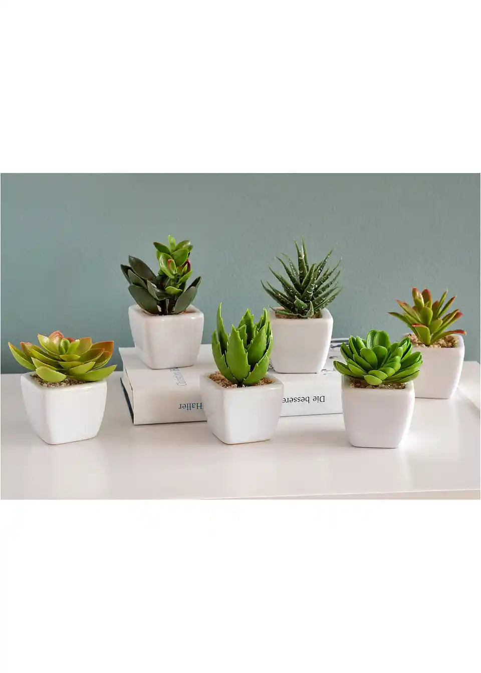 Uz umjetne biljke sukulente u setu od 6 komada mogu se realizirati dekorativne ideje tamo gdje uvjeti nisu povoljni. To mogu biti kupaonice bez prozora, poslovni prostori ili čekaonice. Dekorativne biljke nalikuju svojim prirodnim uzorima do najsitnijih detalja. Posebno privlačan izgled set ima zbog različitih oblika rasta. Elegantne keramičke posude upotpunjuju izgled. Postavljene pojedinačno ili kao skupina, umjetne biljke sukulenti u setu od 6 komada uljepšavaju prostorije u kojima je održavanje pravih biljaka otežano.