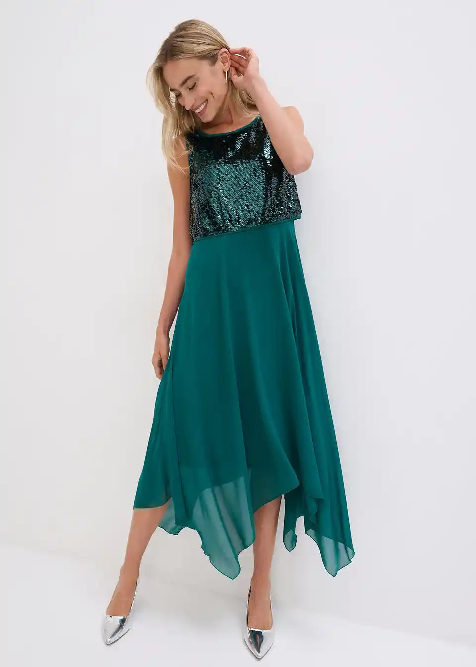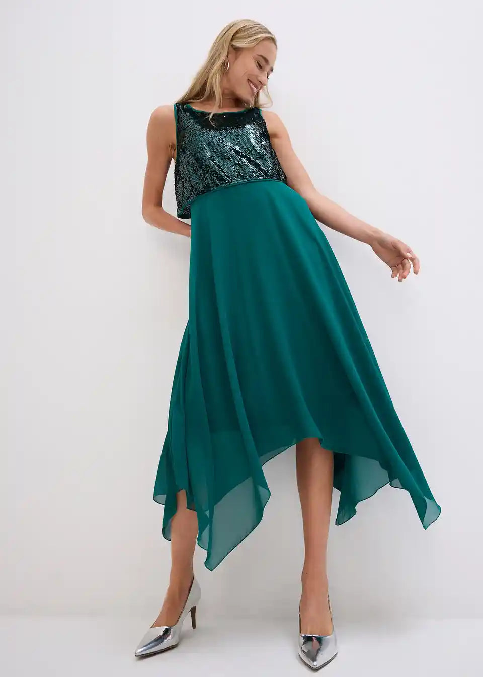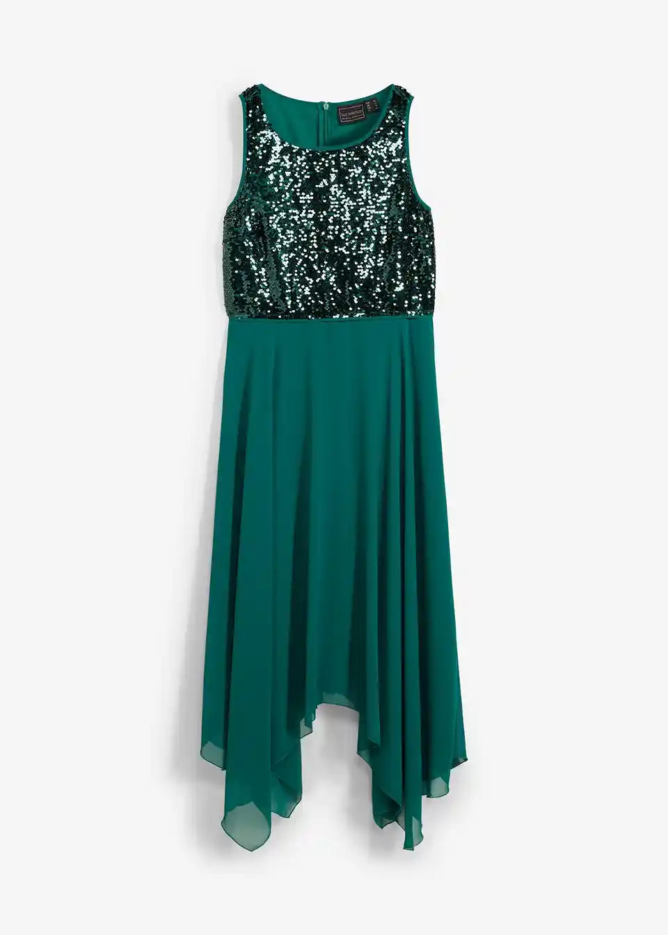 Elegantna večernja haljina s gornjim dijelom od flitera i lepršavim rubom