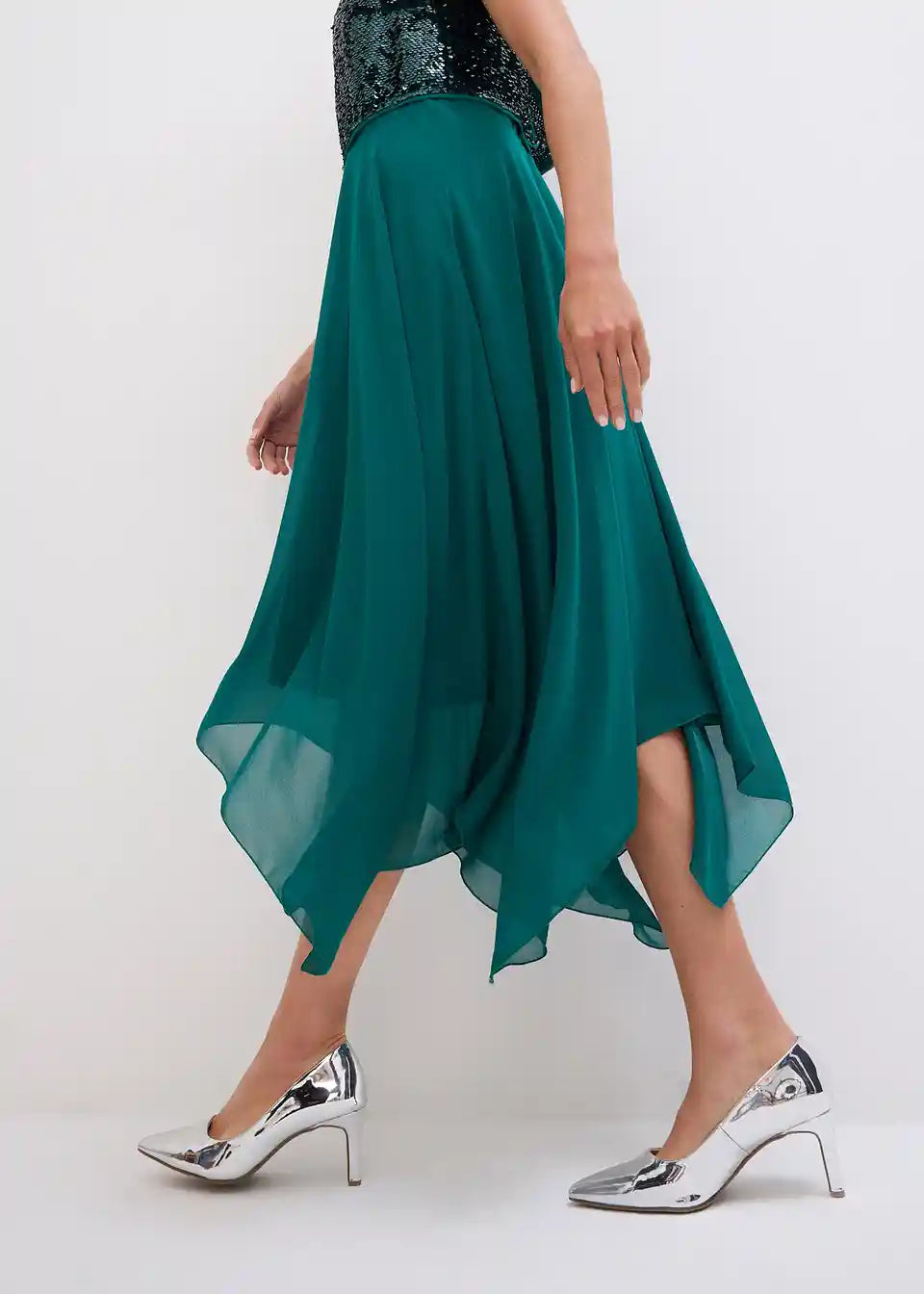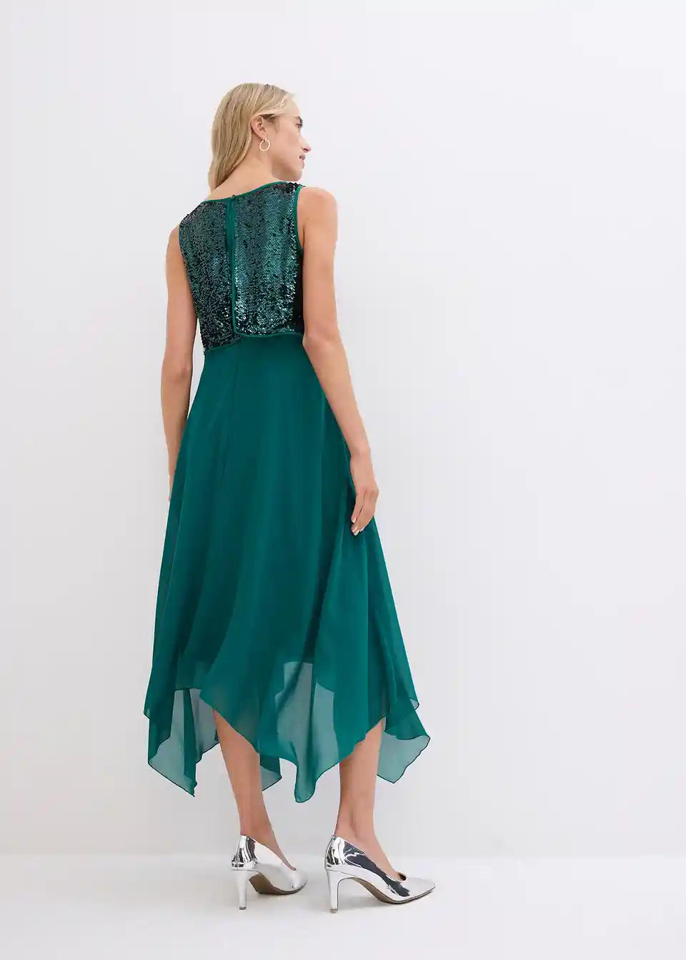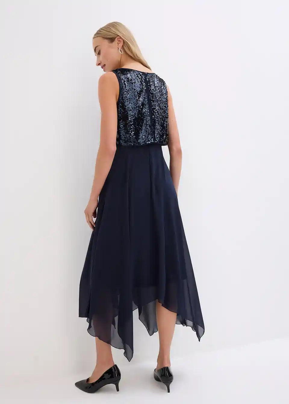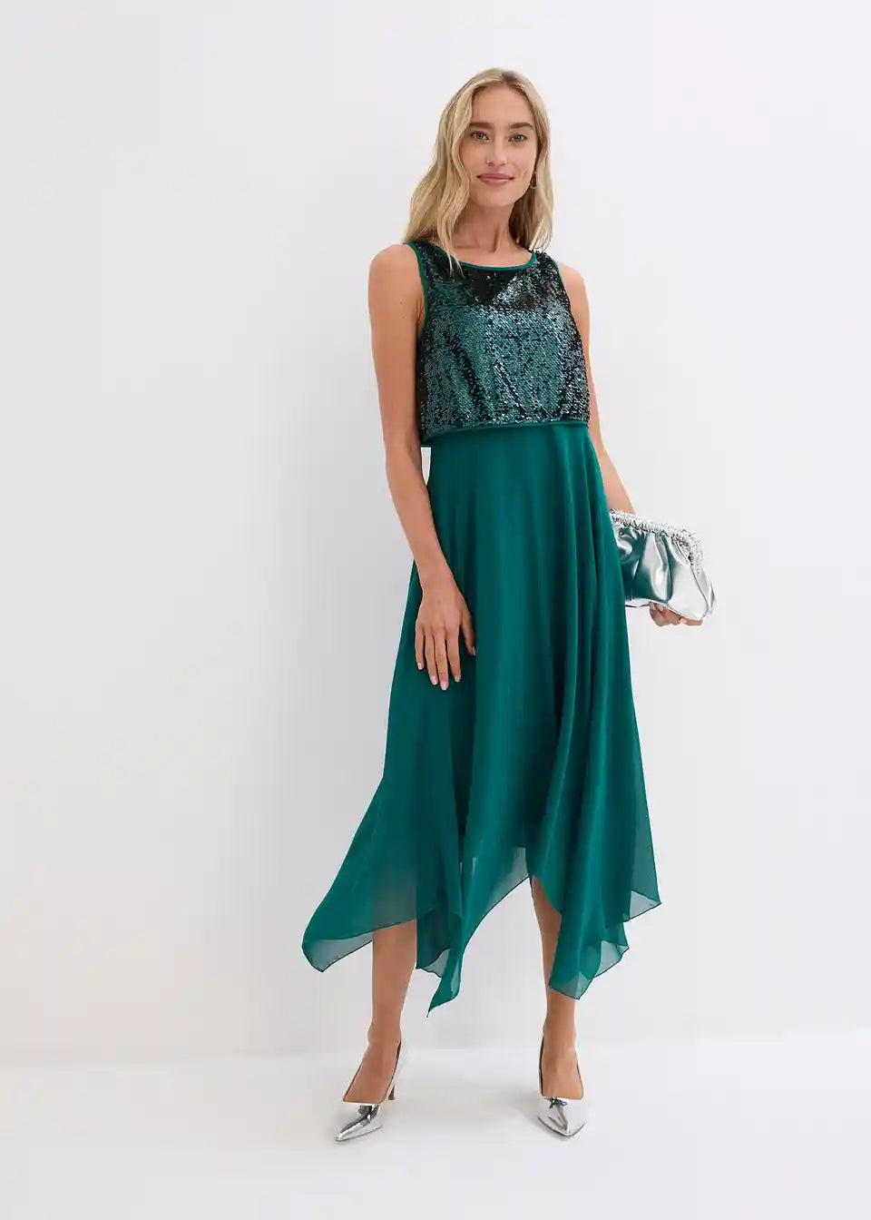Elegantna večernja haljina s gornjim dijelom od flitera i lepršavim rubom
