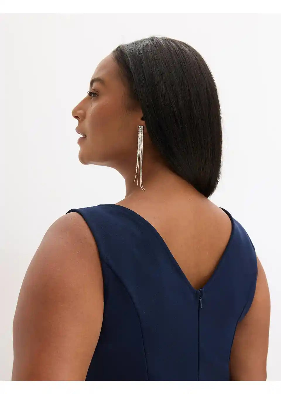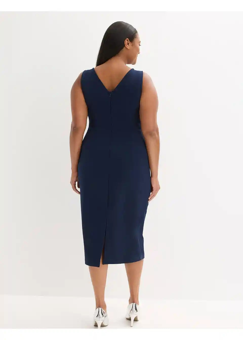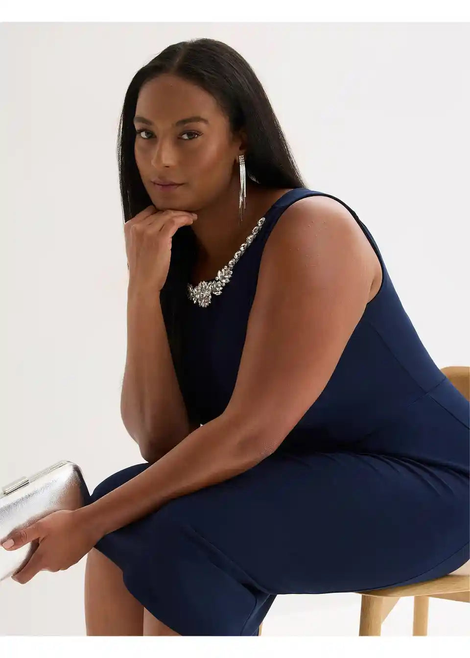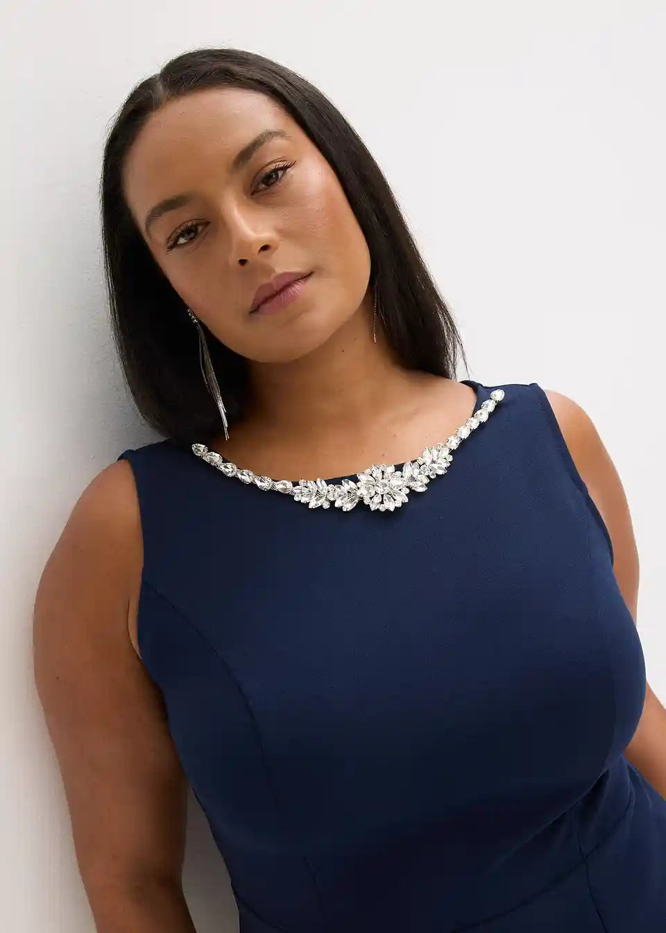 Etui-haljina od strukturiranog krepa sa aplikacijom od kamenčića na izrezu