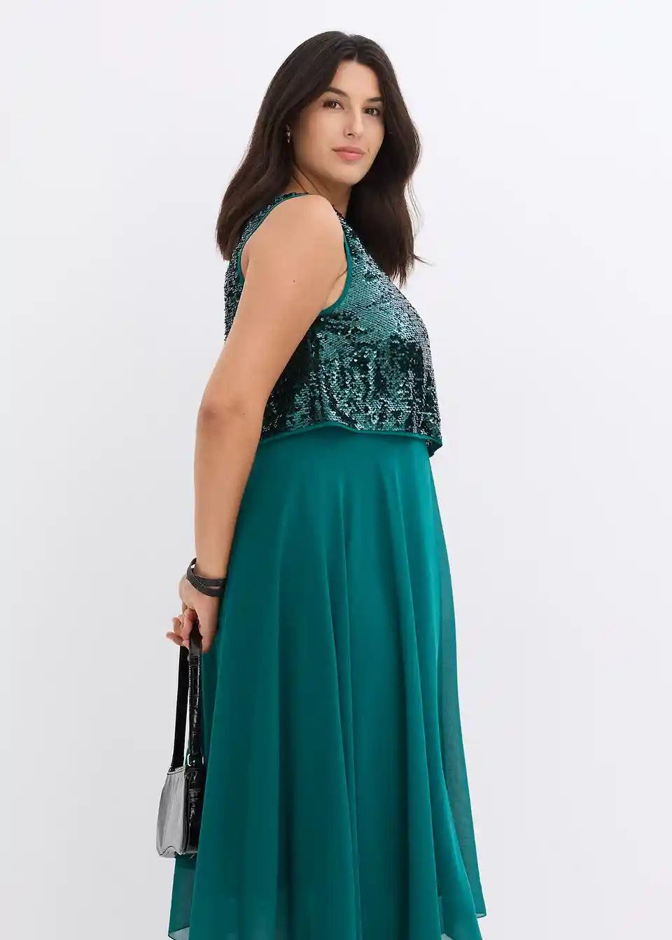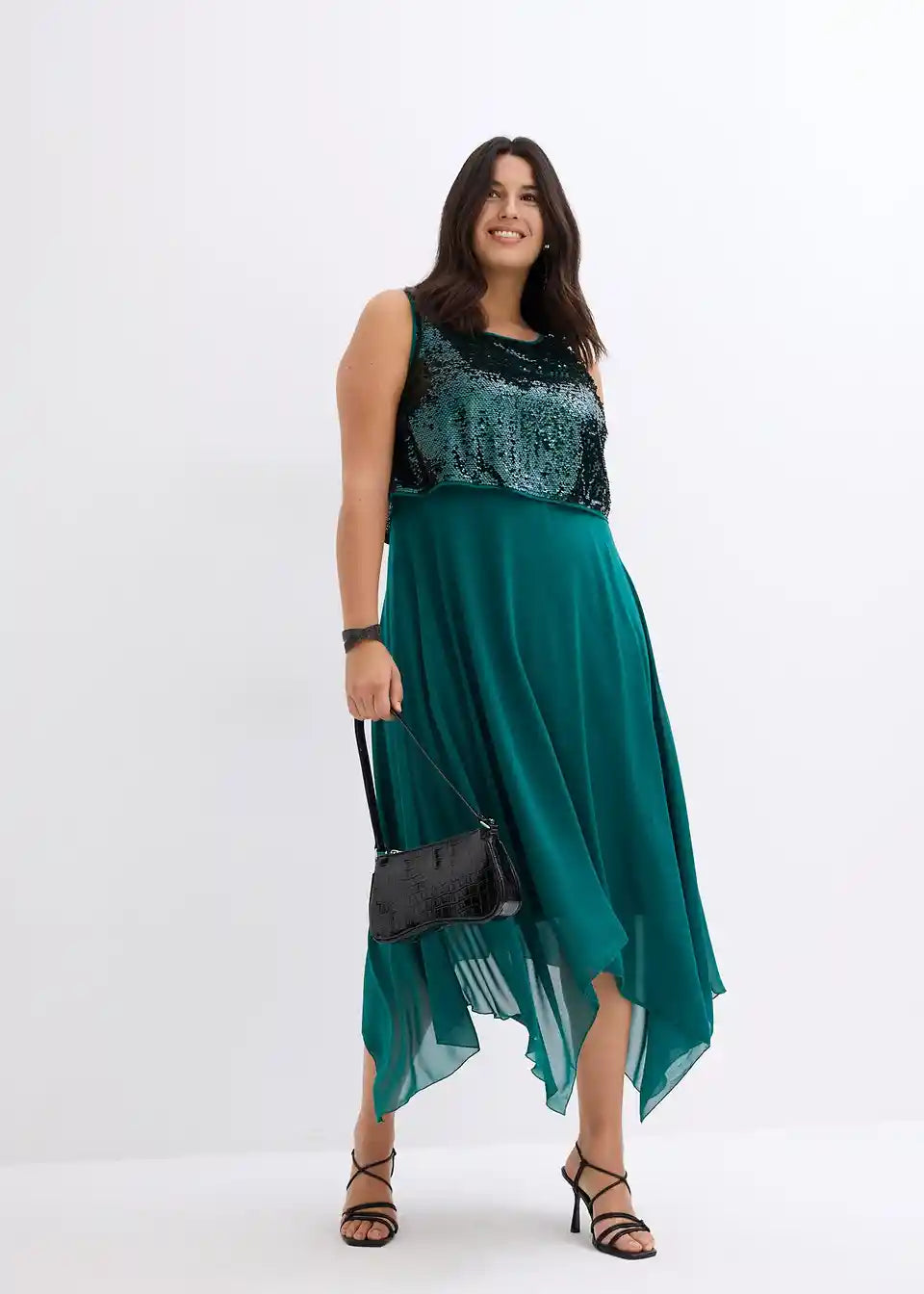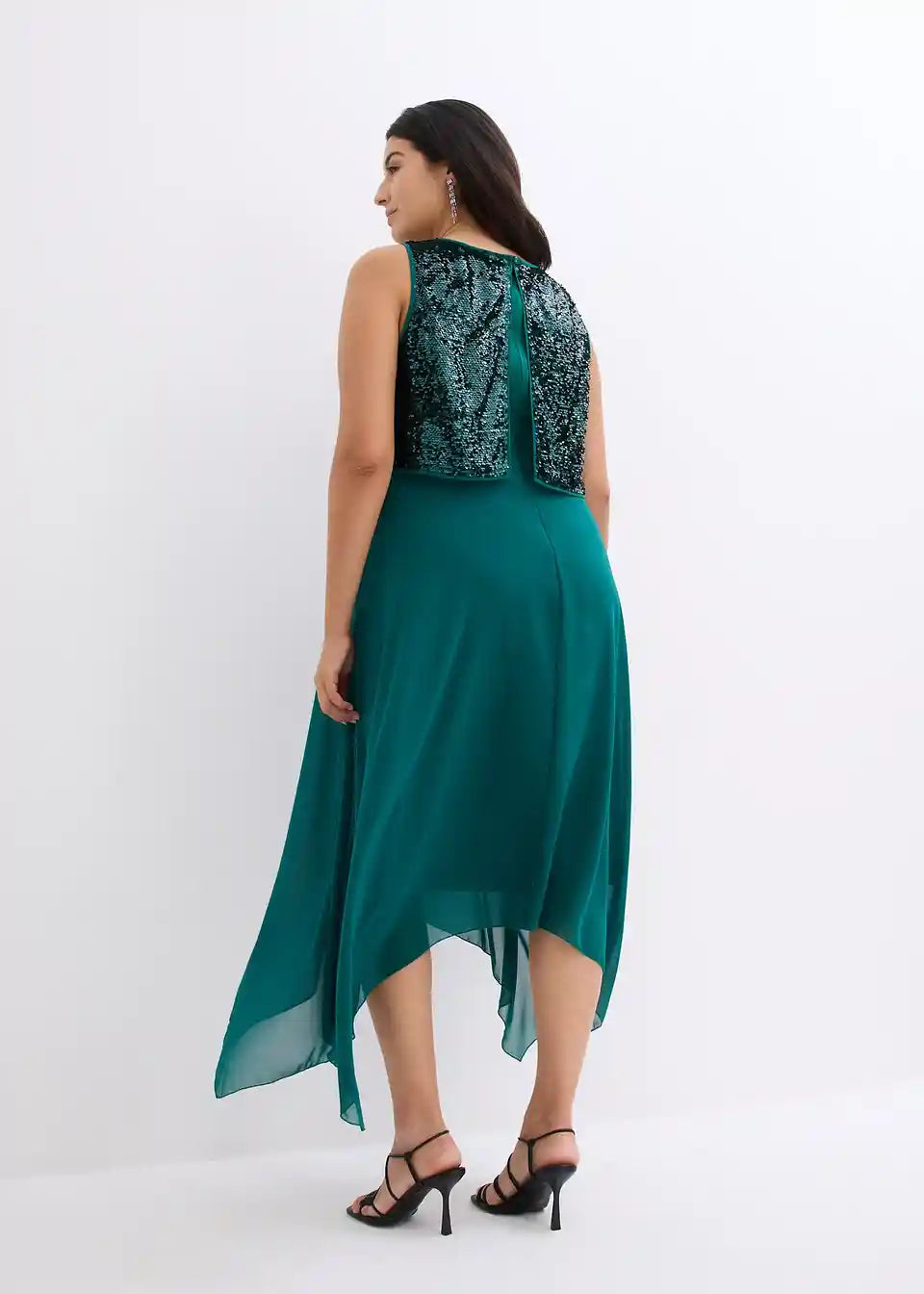 Elegantna večernja haljina s gornjim dijelom ukrašenim šljokicama i lepršavim asimetričnim rubom