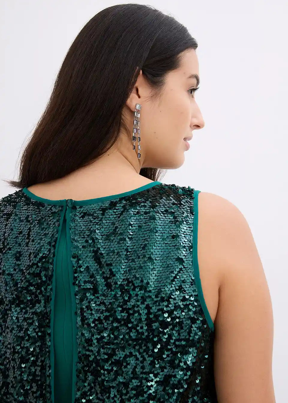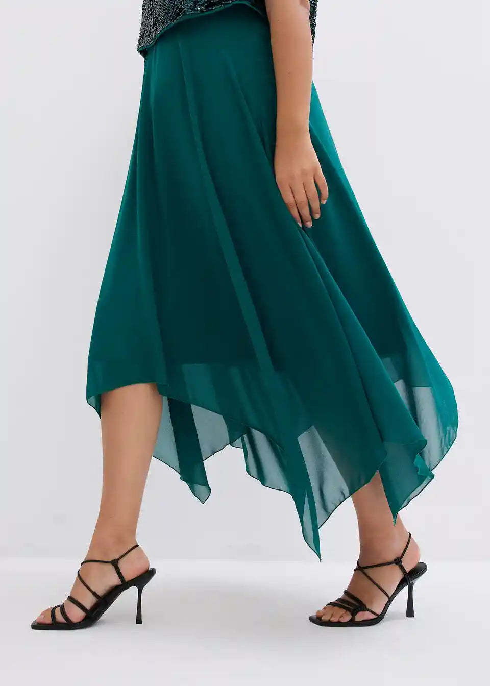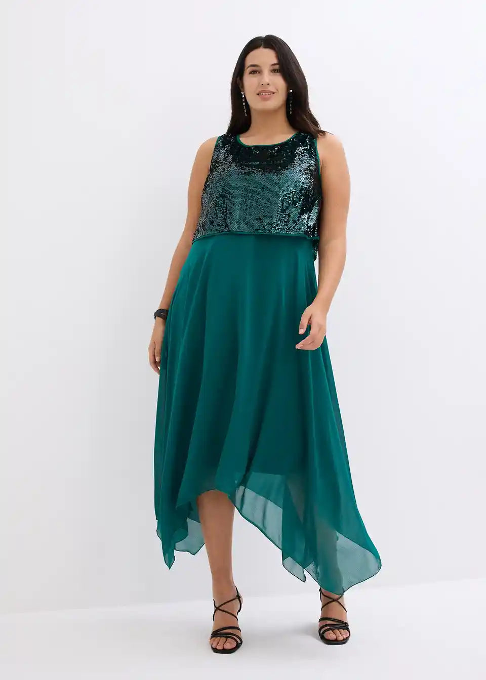 Elegantna večernja haljina s gornjim dijelom ukrašenim šljokicama i lepršavim asimetričnim rubom