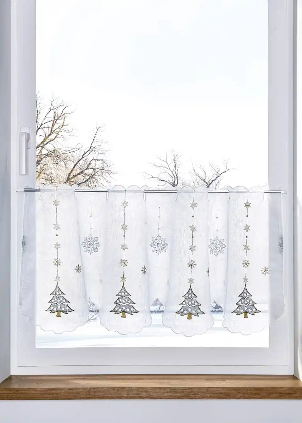 Prekrasna vitrajna zavjesa ukrašena božićnim vezom i zakrivljenim porubom, uključujući trakicu s rupama za štapove do max. 3cm promjera.