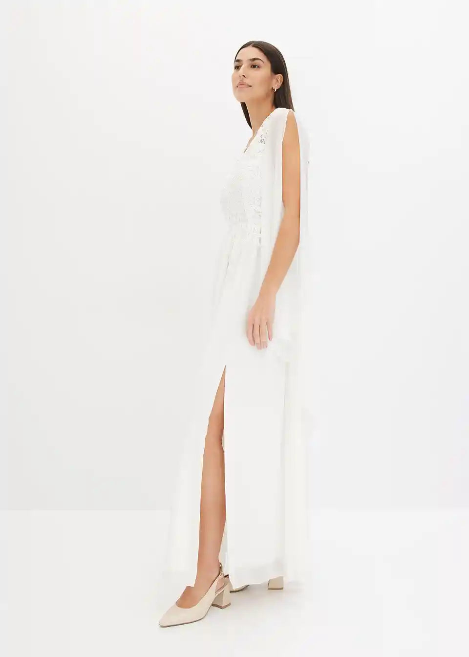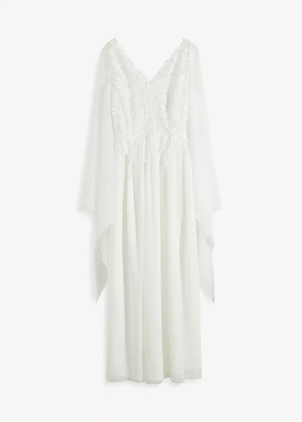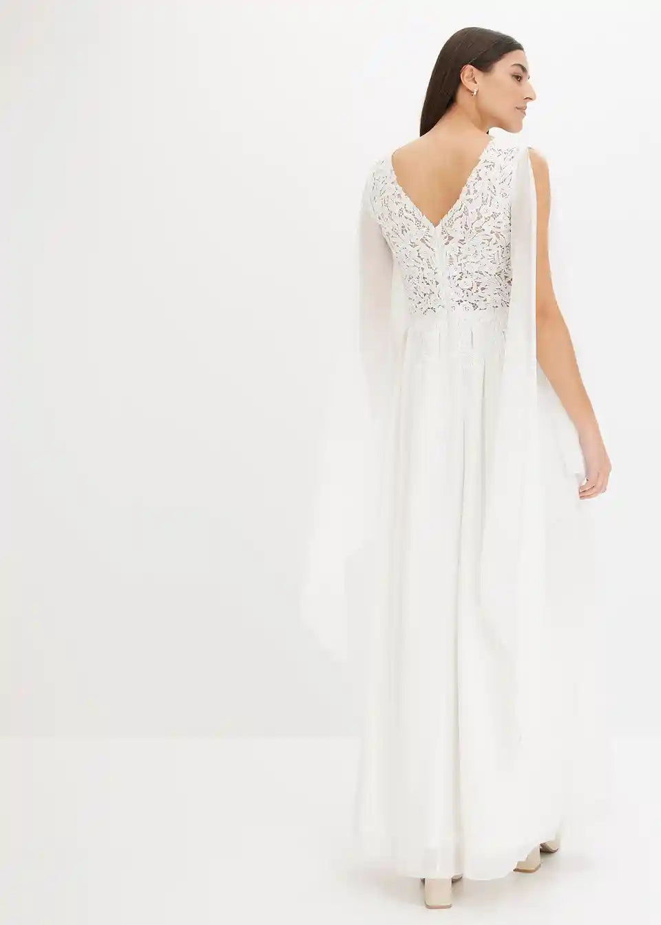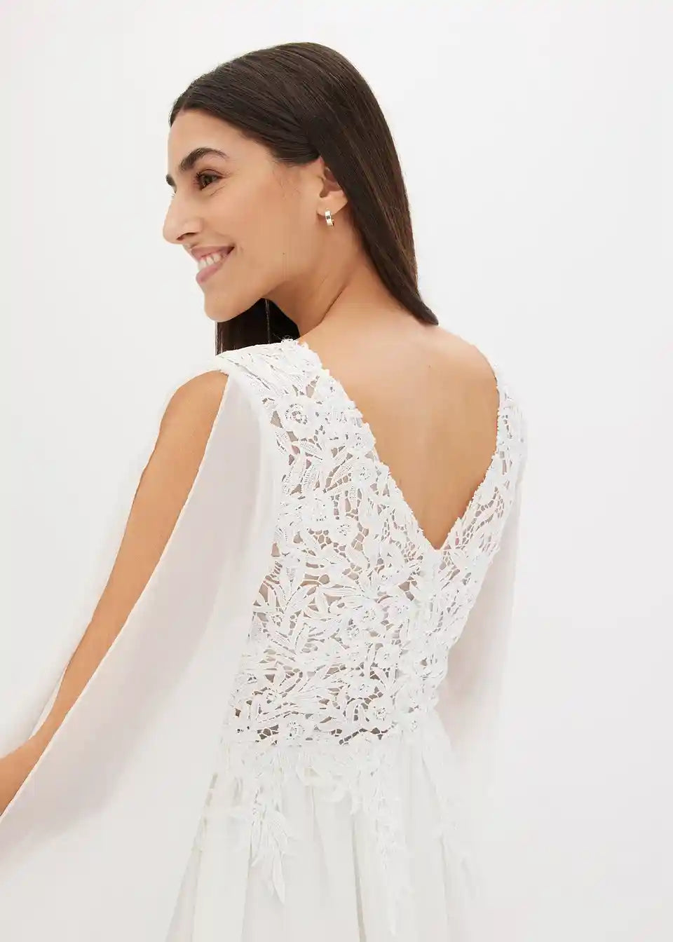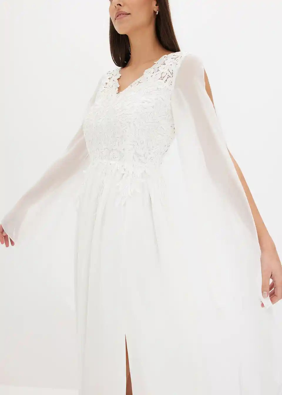 Romantična razigrana vjenčanica od finog šifona s očaravajućom čipkom na gornjem dijelu i dugim asimetričnim rukavima s izrezima