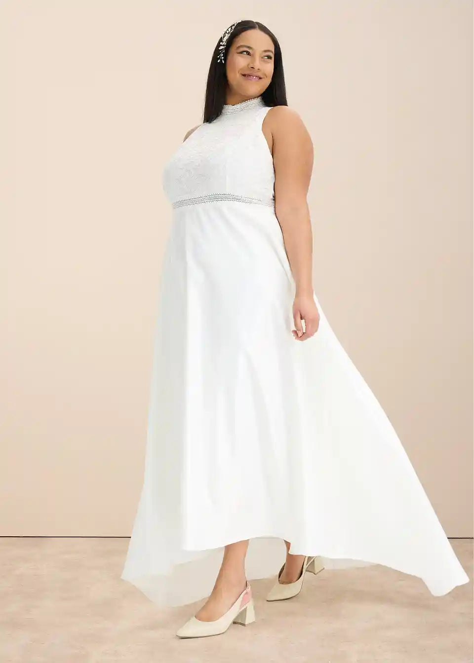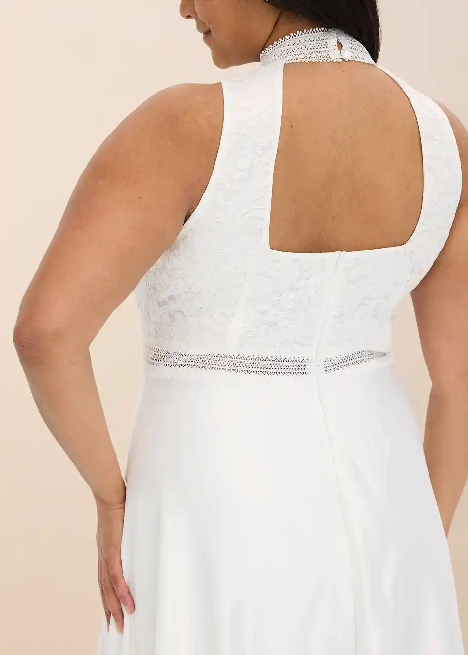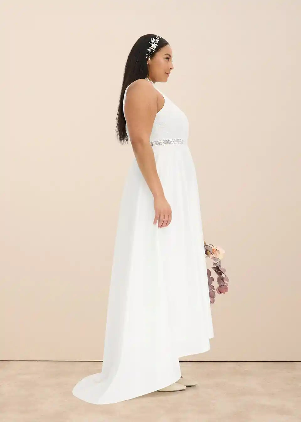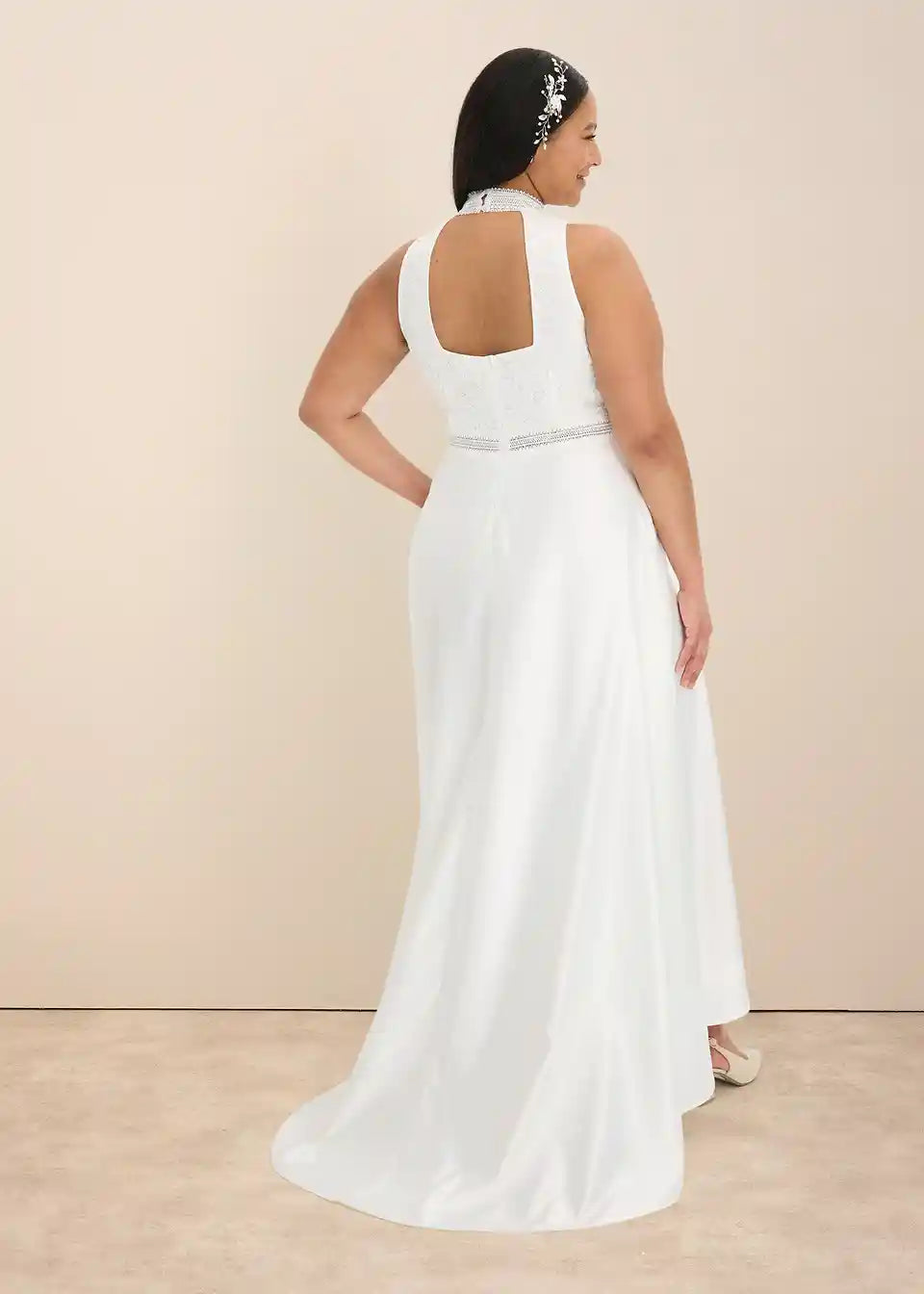 Vjenčanica maksi dužine od sjajnog satena s malim šlepom i izrezom na leđima.