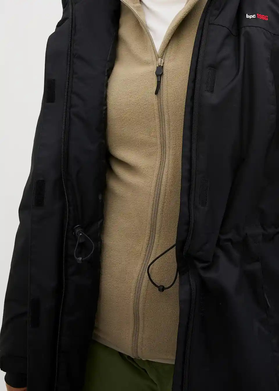 odvojiva kapuljača i krzno, otvori za palac, unutarnji džep s vođenjem kabela, dvosmjerni patentni zatvarač s zaštitom za bradu, vodeni stupac 3000 mm, duljina u vel. 42 cca 90 cm.