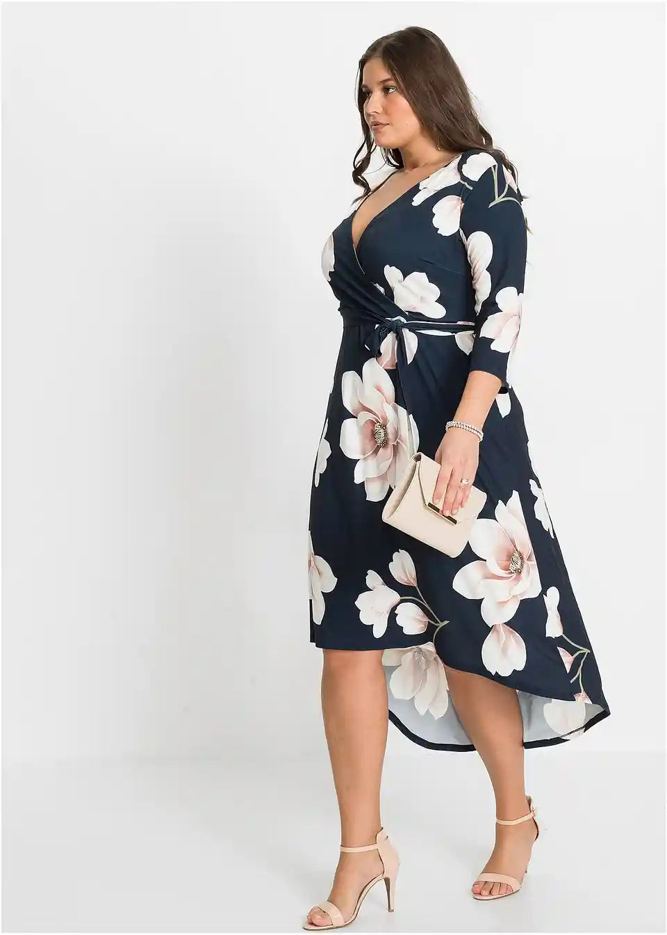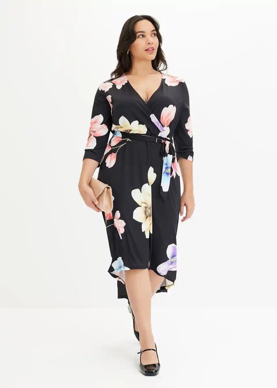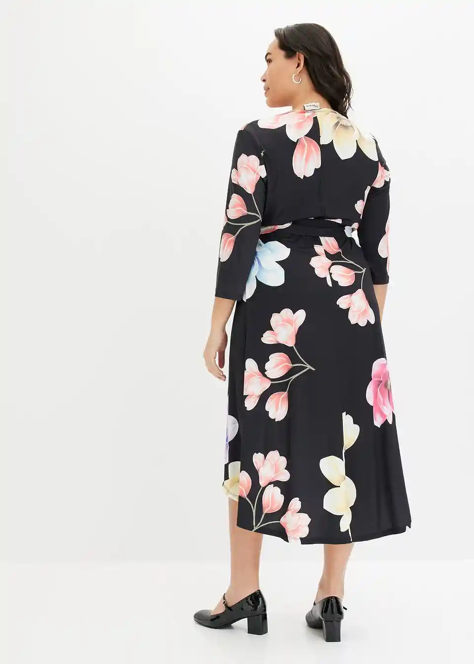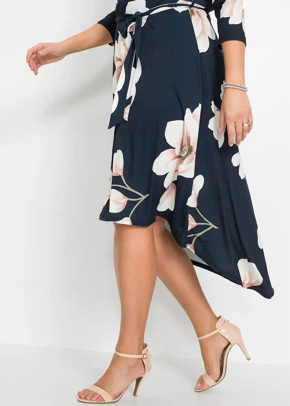 Ova elegantna haljina od BODYFLIRT ukusno ističe dekolte i listove. Ženstvena midi haljina očarava atraktivnim cvjetnim uzorkom, asimetričnim rubom i profinjenim preklopnim izgledom. U struku, uska vezica elegantno naglašava sredinu tijela. Duga vokuhila-haljina s vezicom izgleda fantastično uz elegantne cipele s visokim potpeticama.