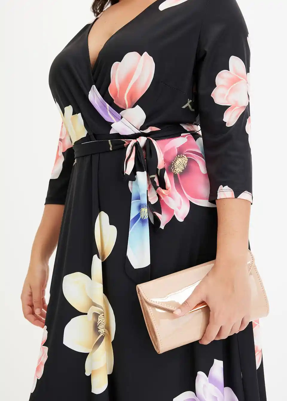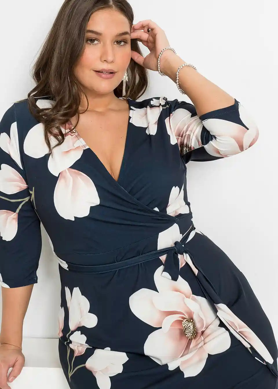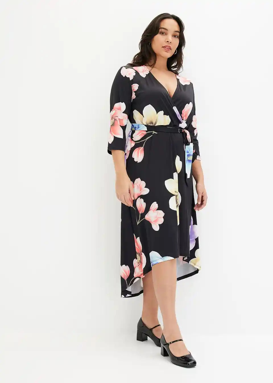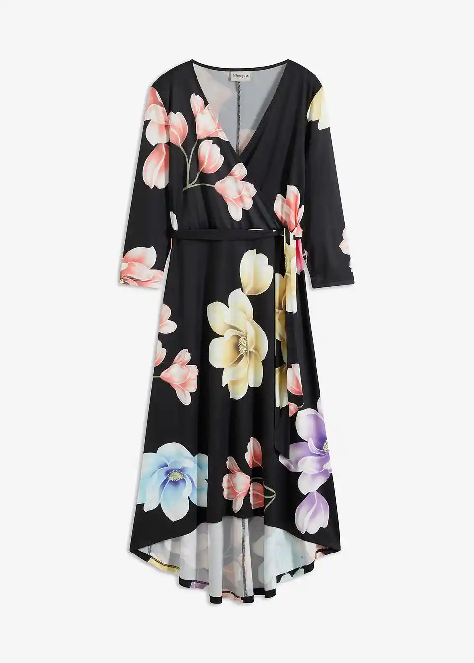 Ova elegantna haljina od BODYFLIRT ukusno ističe dekolte i listove. Ženstvena midi haljina očarava atraktivnim cvjetnim uzorkom, asimetričnim rubom i profinjenim preklopnim izgledom. U struku, uska vezica elegantno naglašava sredinu tijela. Duga vokuhila-haljina s vezicom izgleda fantastično uz elegantne cipele s visokim potpeticama.