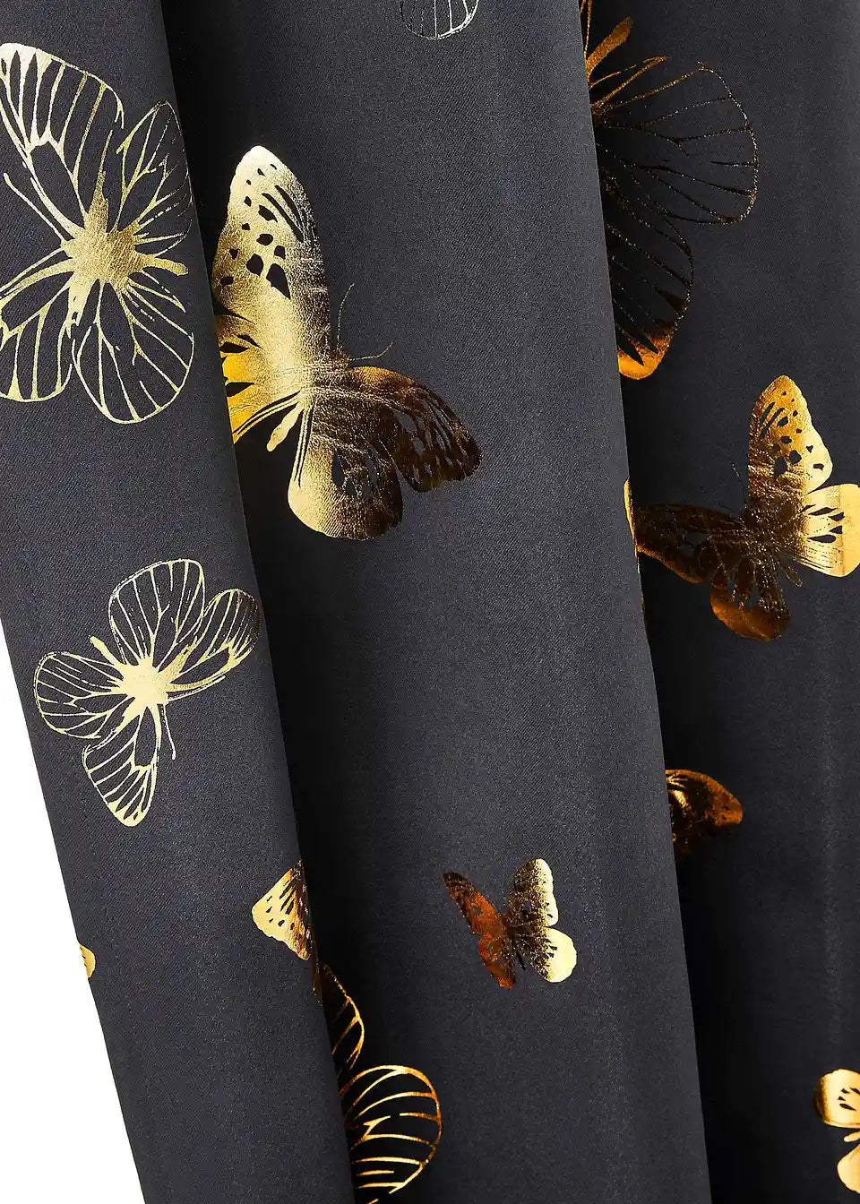 Zavjesa od teške tkanine ukrašena sjajnim leptirima. Pravi ukras za vaš dom! Idealna za spavaću sobu, jer tkanina zamračuje prostoriju. Zavjesa može imati zvučno-apsorbirajući i termo-izolacijski učinak, čime prigušuje buku i štedi energiju jer štiti od hladnog propuha.