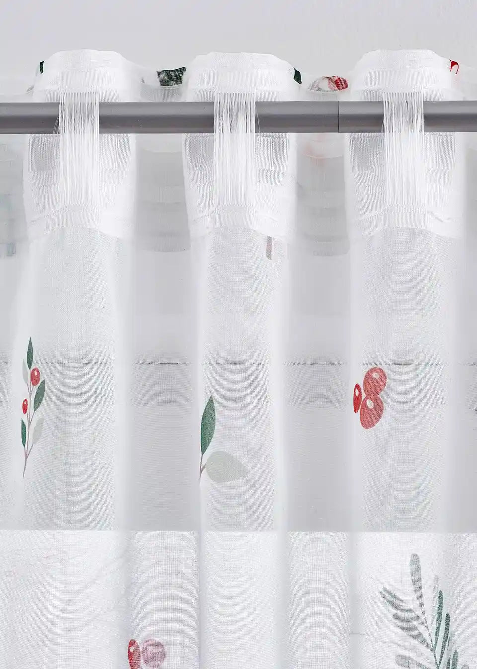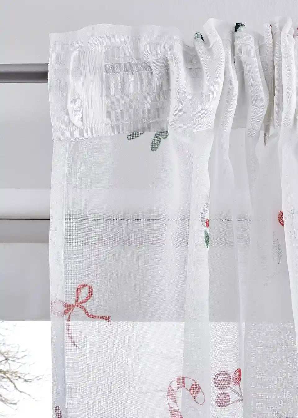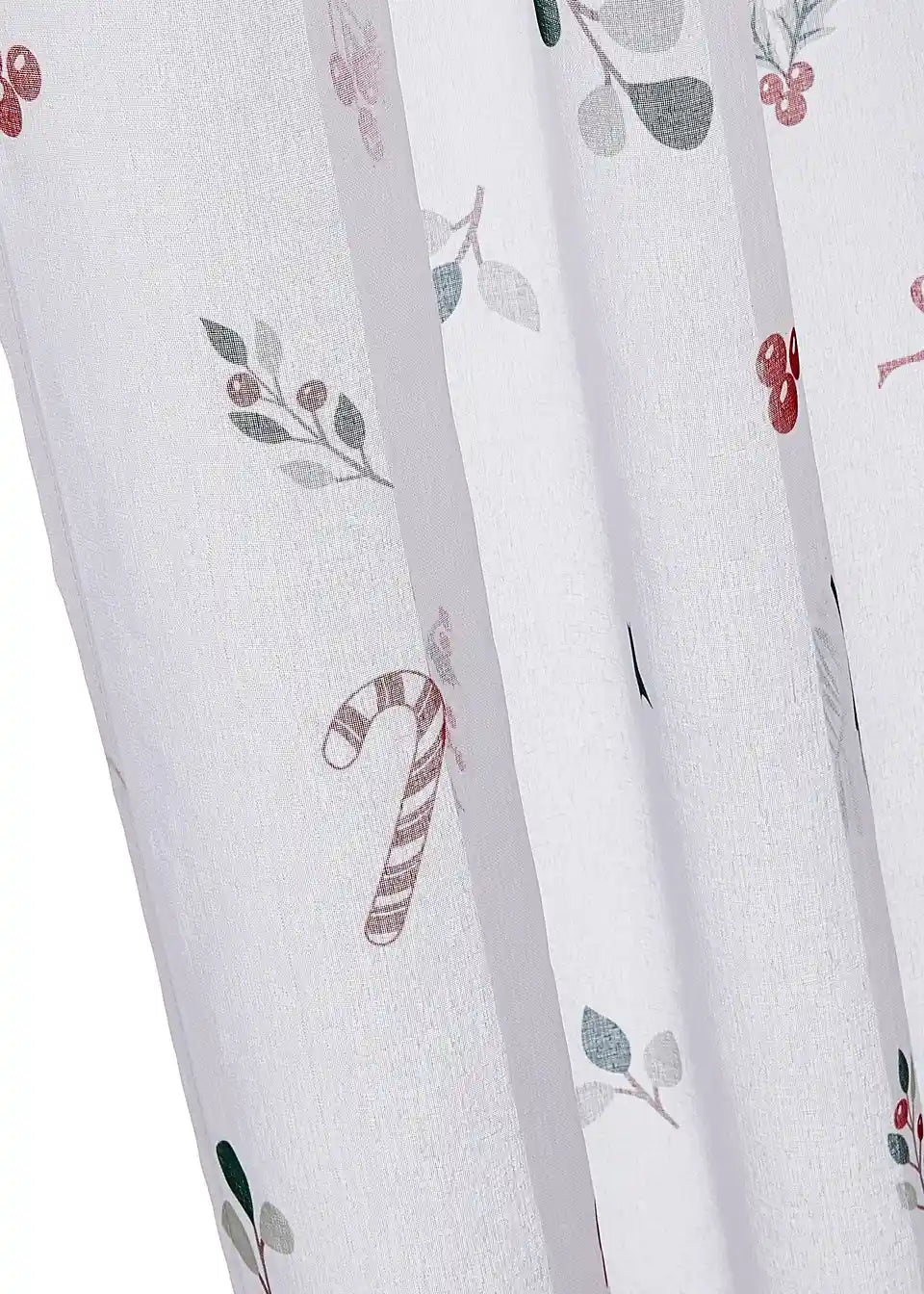 Prozračna božićna zavjesa u bezvremenskom dizajnu koja ispunjava tvoj prostor blagdanskim raspoloženjem. Prozirna tkanina djelomično je od održivog poliestera.