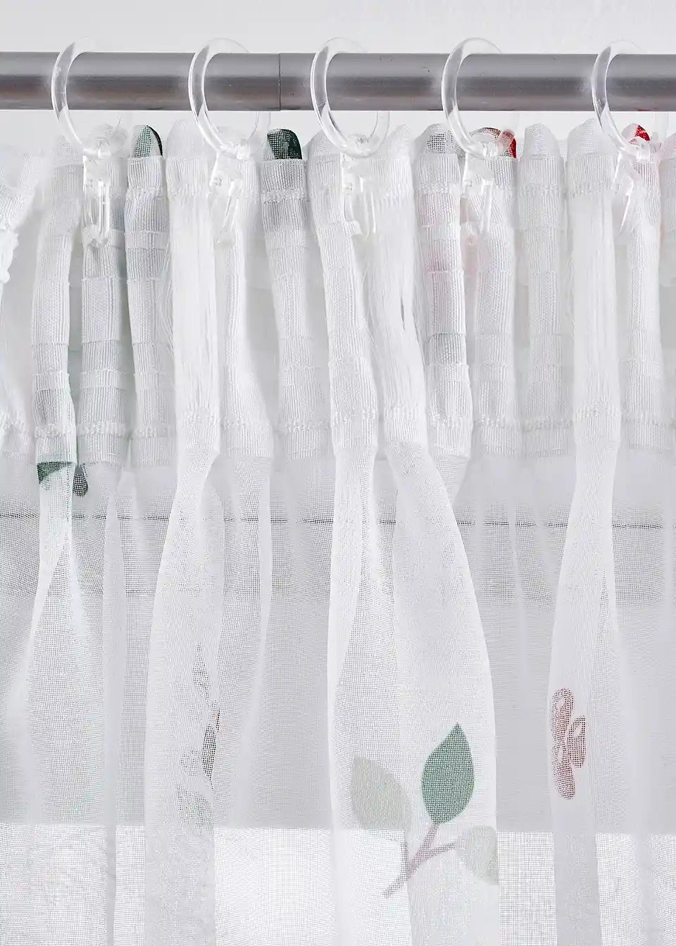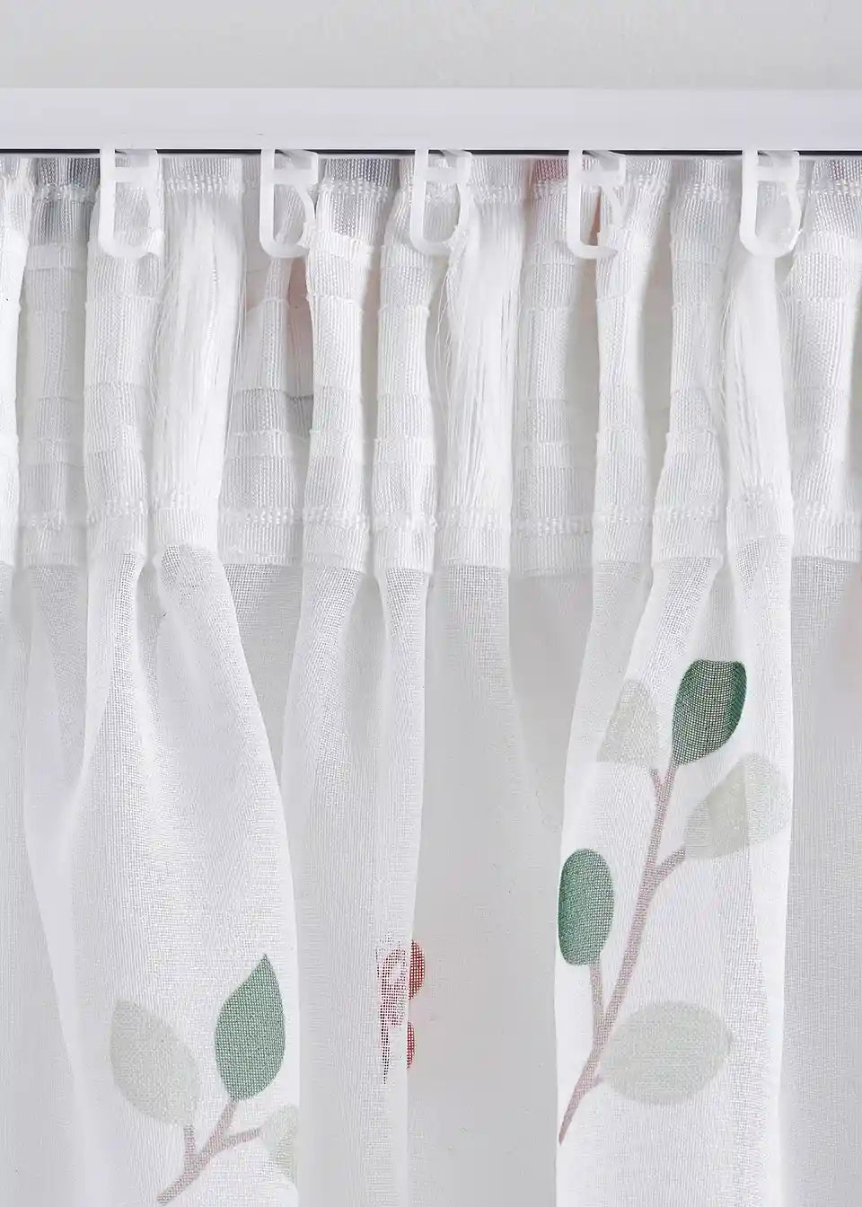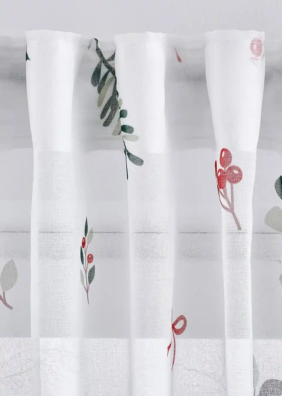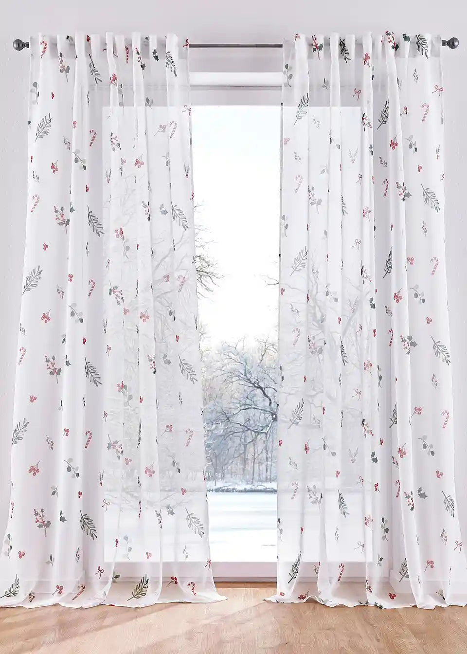 Prozračna božićna zavjesa u bezvremenskom dizajnu koja ispunjava tvoj prostor blagdanskim raspoloženjem. Prozirna tkanina djelomično je od održivog poliestera.