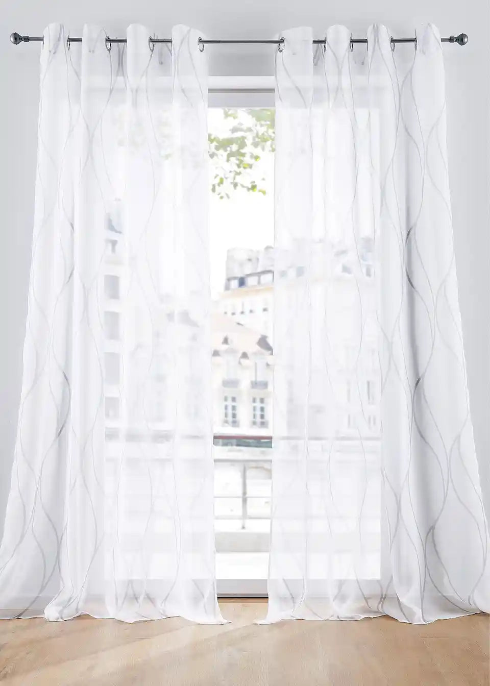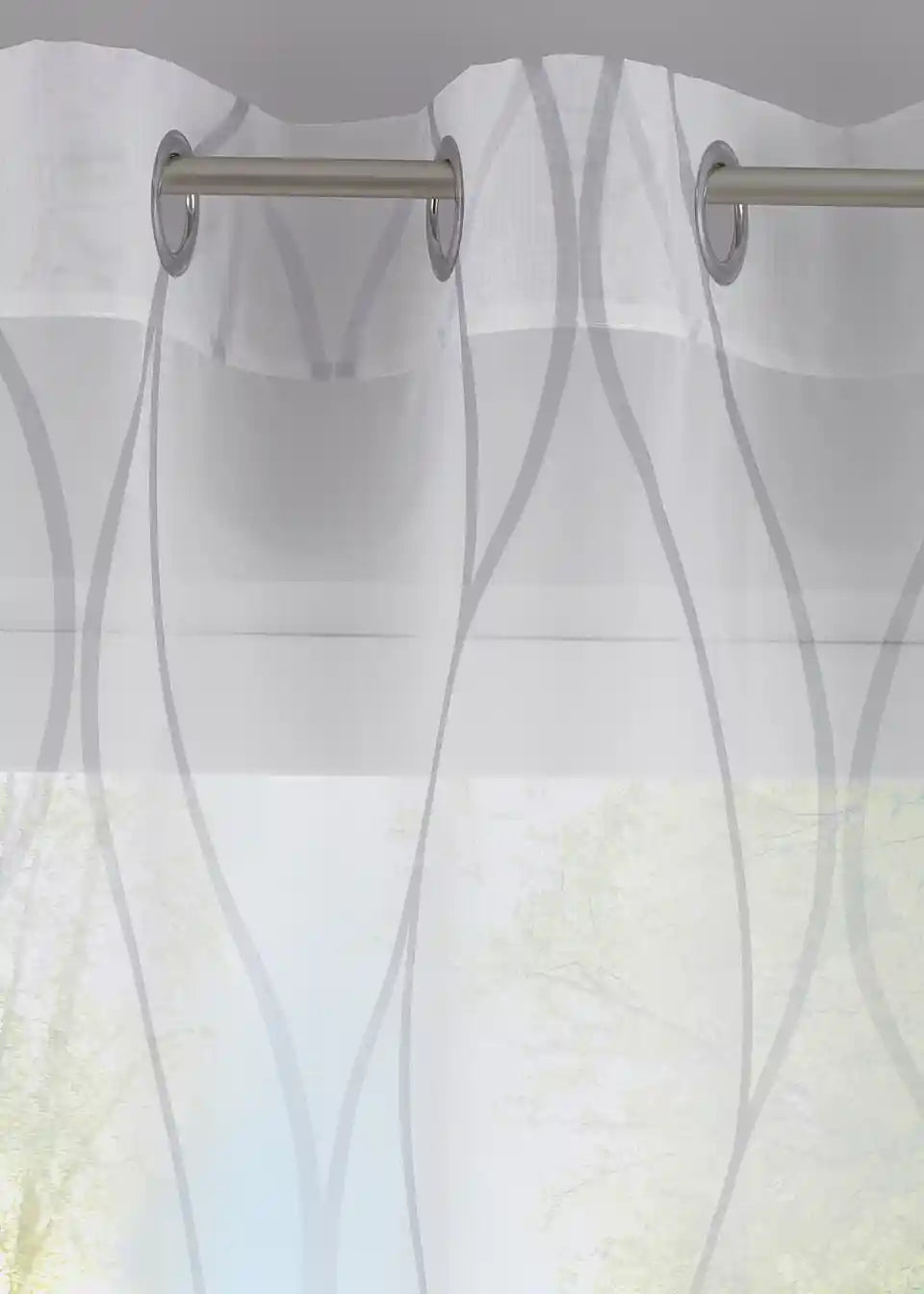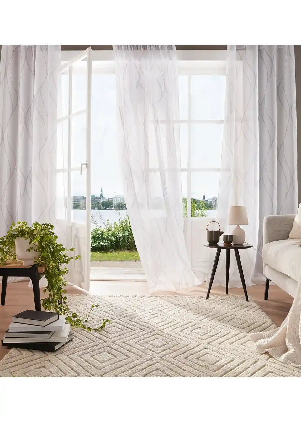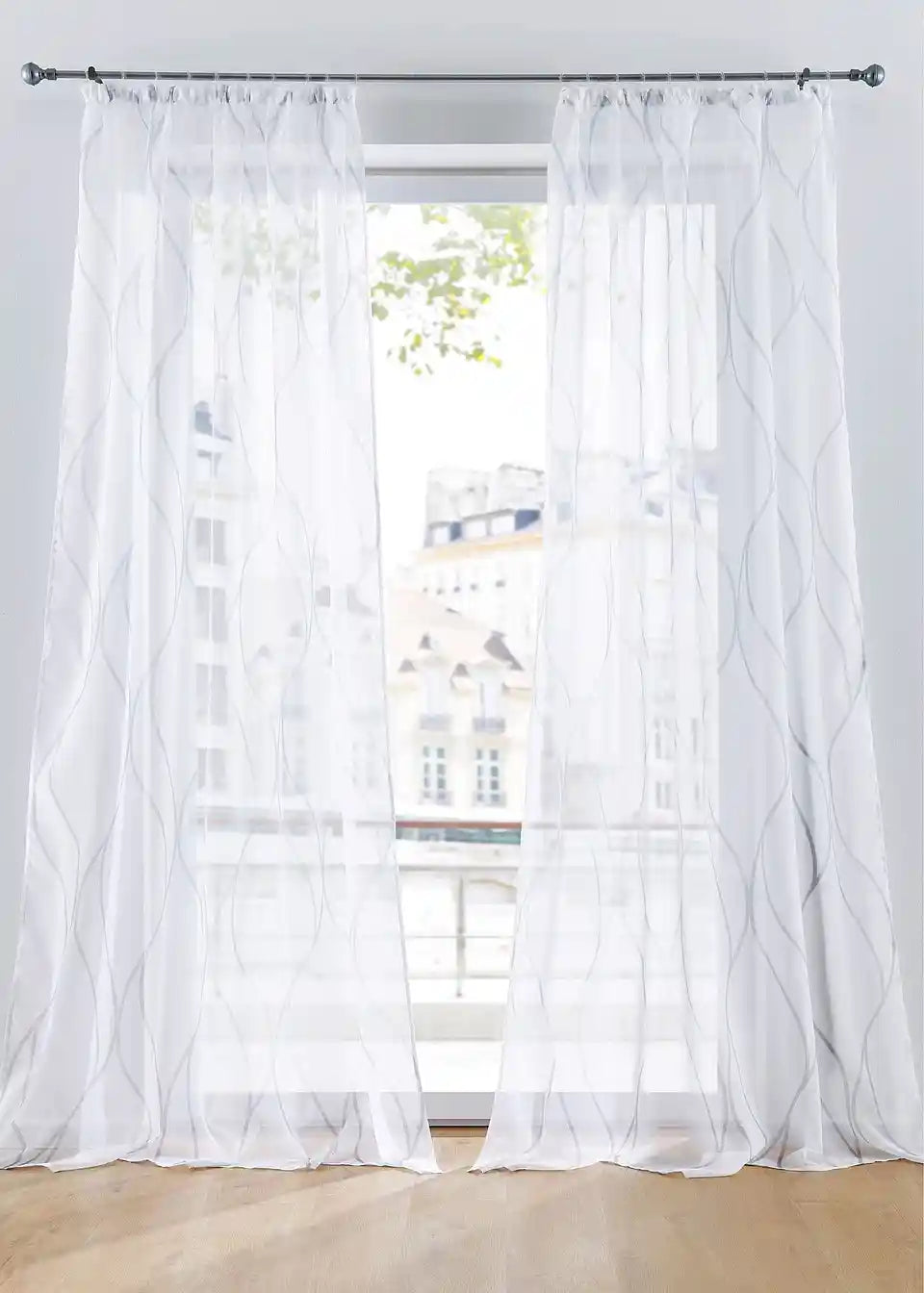 Elegantni kućni dodatak u modernom dizajnu! Prozirna zavjesa dostupna je u bijeloj boji s modernim uzorkom u sivoj i stoga je lako kombinirati s različitim stilovima interijera. Izrađena od finog poliesterskog materijala, zavjesa propušta svjetlost, lagano pada i jednostavna je za održavanje. Zavjesa impresionira svojim inovativnim dizajnom i lakoćom.