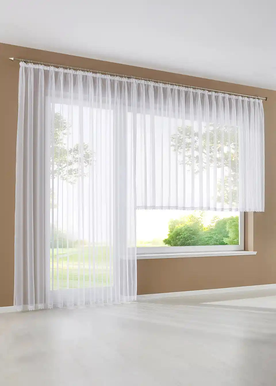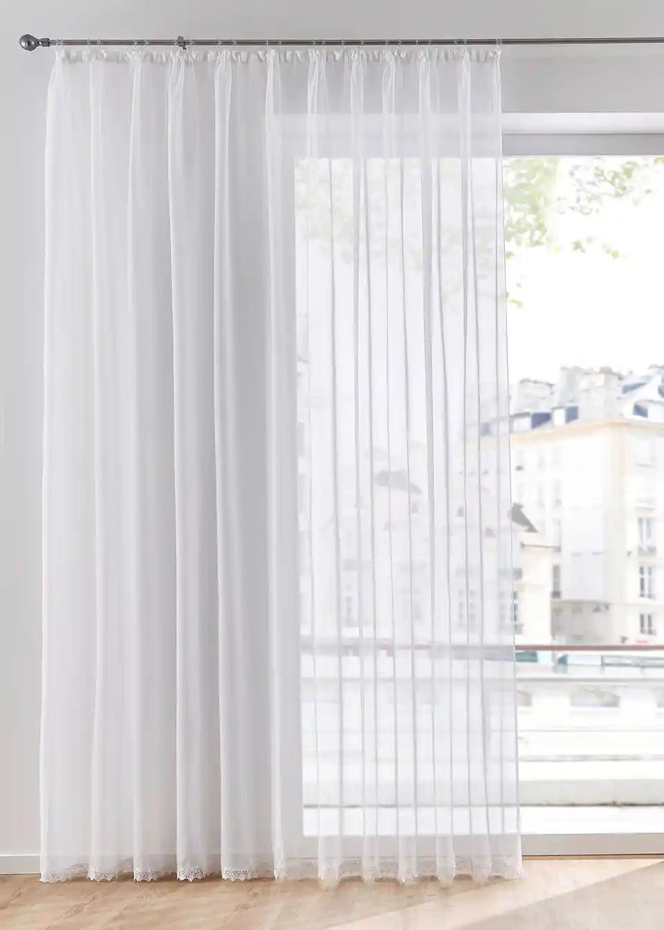 Ova prekrasna duga zavjesa savršeno je prikladna za prozore različitih veličina. Lako se može dekorirati i prozore s cvjetnim aranžmanima, kao i prozore do poda. Duga zavjesa izrađena je od prozirnog voile materijala. Divan detalj je prava čipkasta obruba na donjem rubu. Zavjesa dolazi gotova sa širinom trake za nabore. Preporučujemo naručiti 3 puta širu širinu prozora za lijep izgled na prozoru.