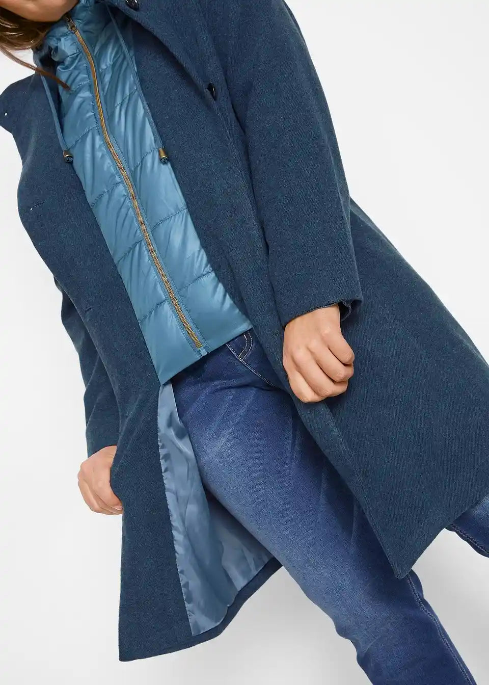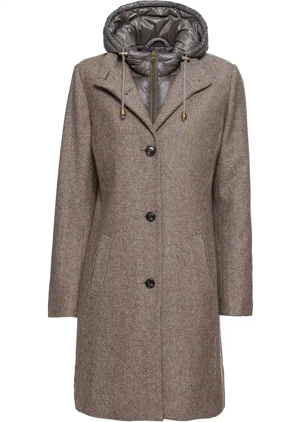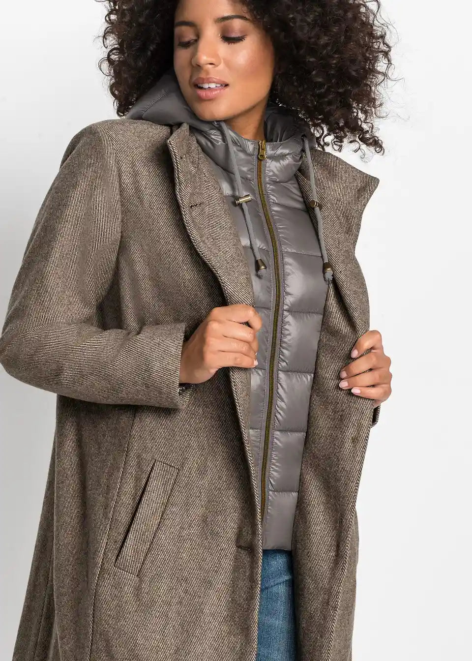 Ovaj moderni zimski kaput u 2-u-1 izgledu kombinira klasičan kroj kaputa s prošivenim umetkom. Gornji kaput impresivan je svojim čistim linijama i zakopčava se dekorativnim gumbima.